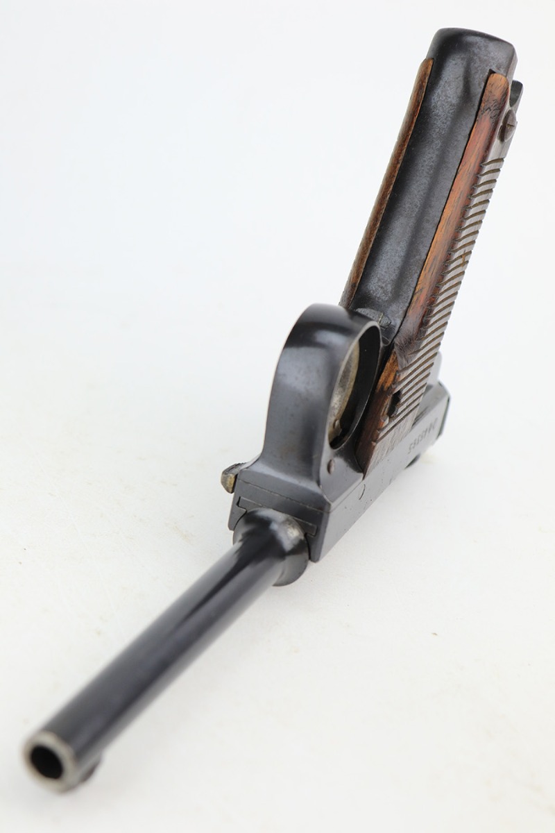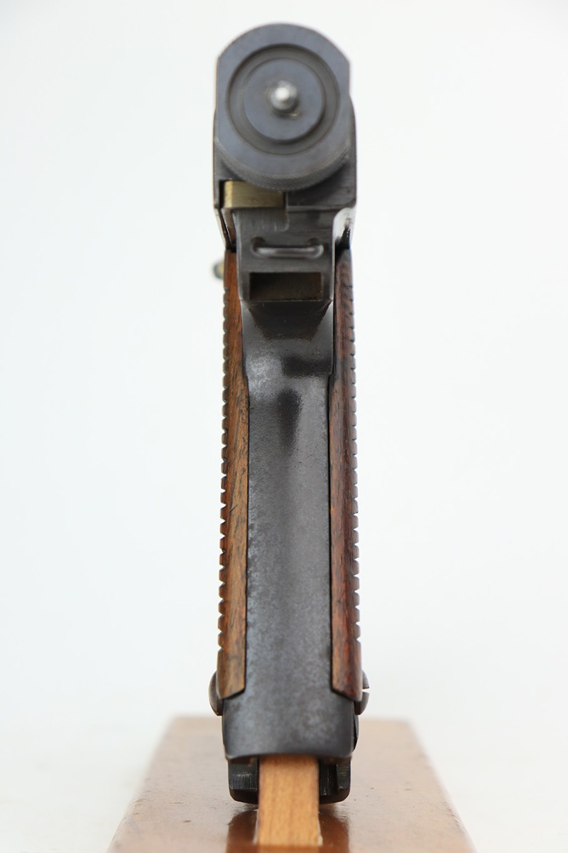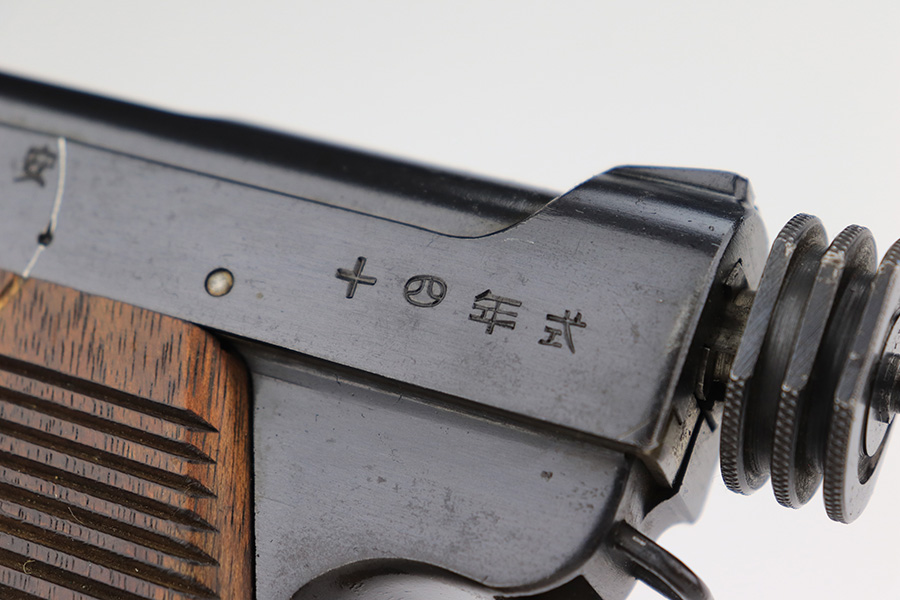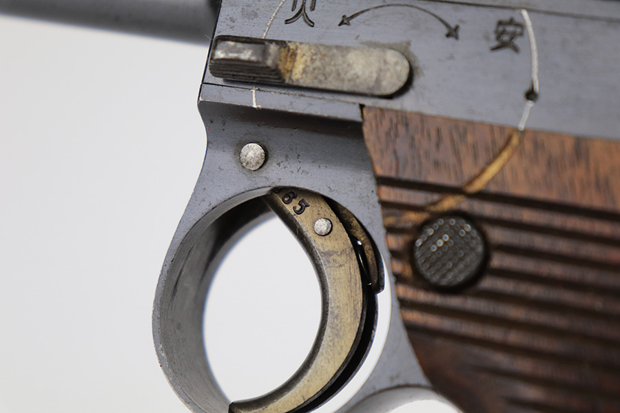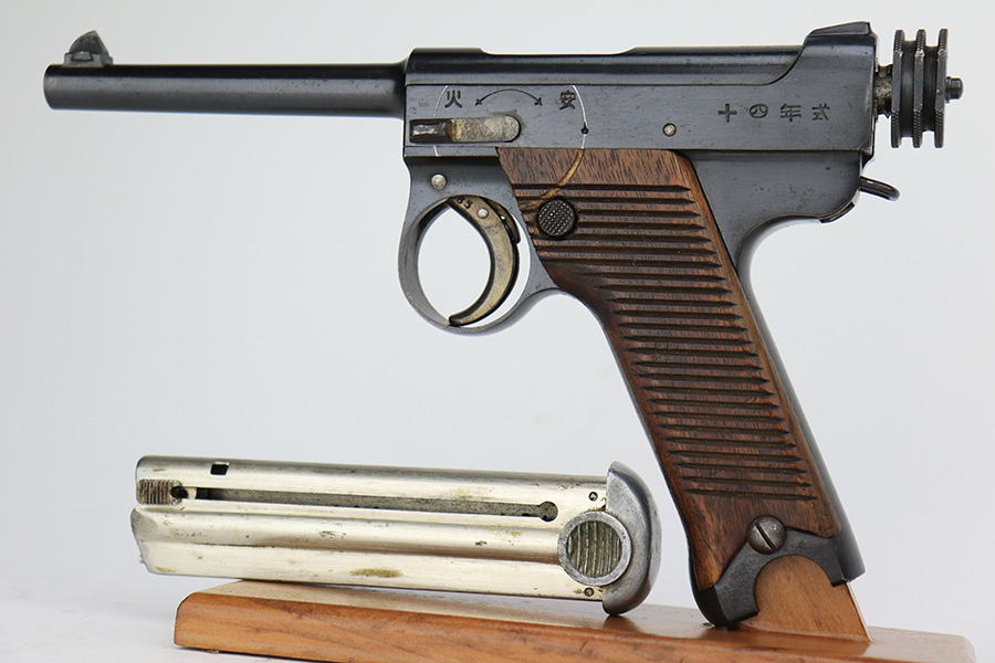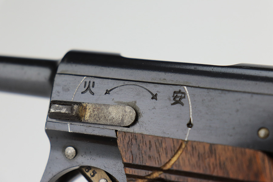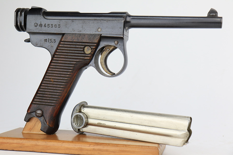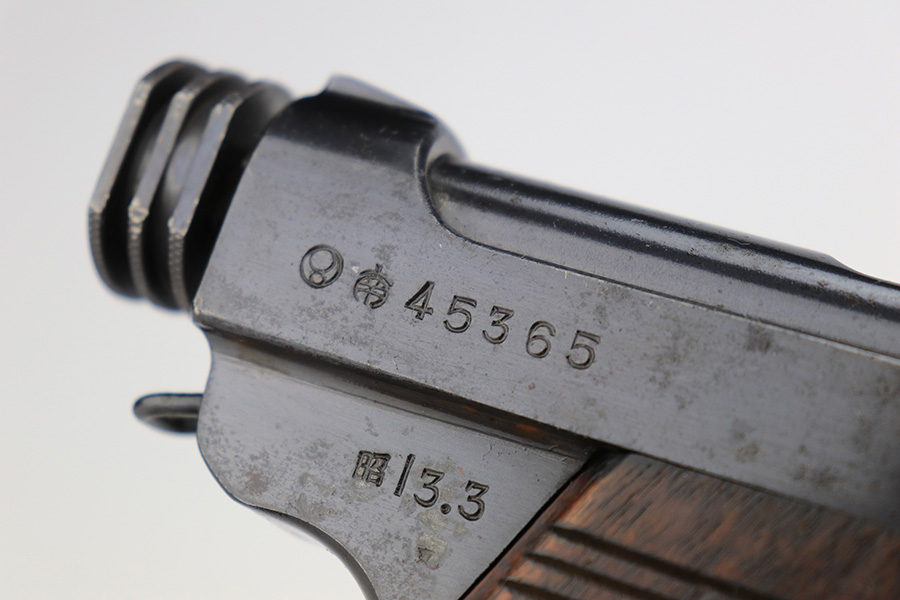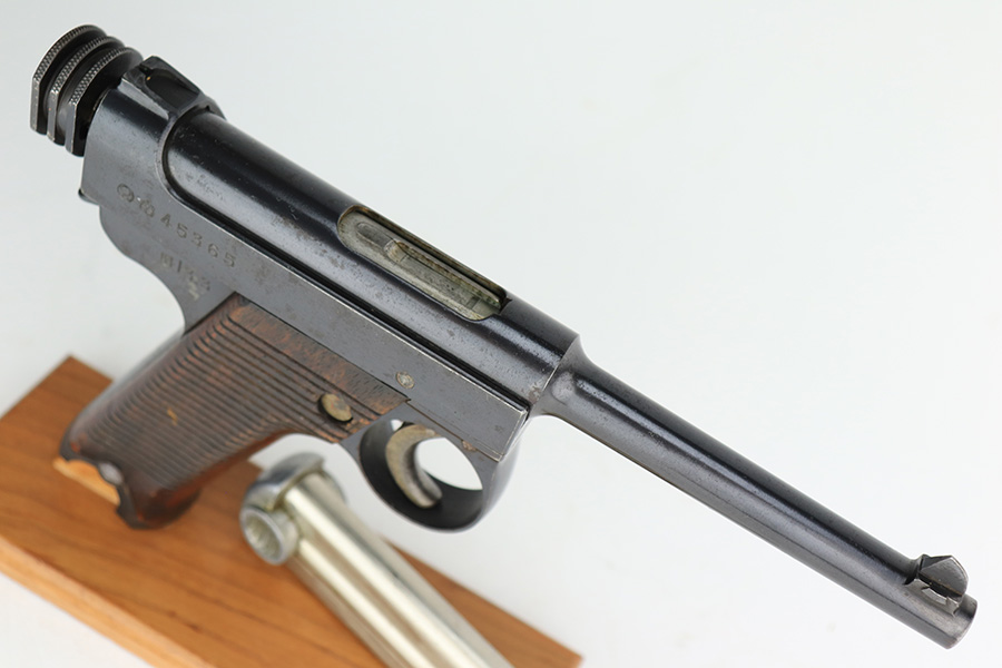 5/12/23 – This is a very nice example of a Nambu Type 14 issued to the Japanese military in 1938. It is all matching, except for the firing pin which is un-numbered. The gun itself has retained about 96% of its original finish with very light wear and a few small spots of discoloration on the right side of the gun. While there isn’t much actual finish loss, there is light spotty oxidation throughout and some more noticeable freckling on both grip straps. Fitted with excellent wood grips – the left panel is hand-numbered and matching, the right is numbered but illegible. Comes with a period-correct but mismatched magazine. Excellent bore with strong rifling.