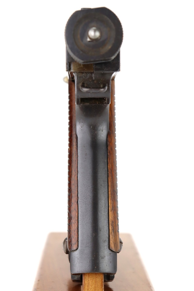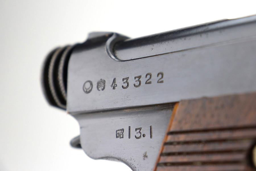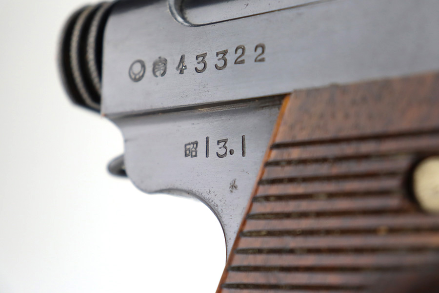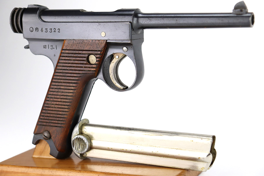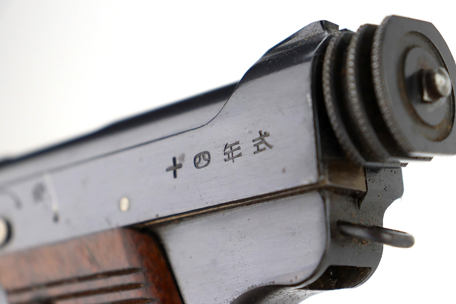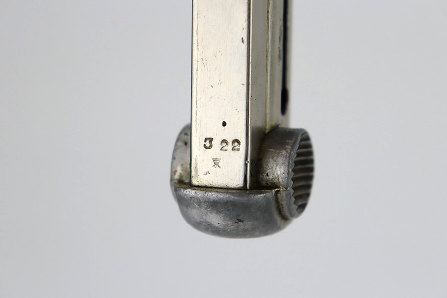 4/11/24 – This is a minty example of a Nambu Type 14 issued to the Japanese military in January of 1938. All matching and comes as a rig with a leather holster, one original matching-numbered magazine, one mismatched magazine, and a nickeled cleaning rod. The stitching from the holster’s top flap is missing, so the it is not attached. The gun has retained nearly all of its original finish, but there is light freckling along the barrel. The right grip panel is numbered and matching – the numbering on the left is illegible. Mint bore.
