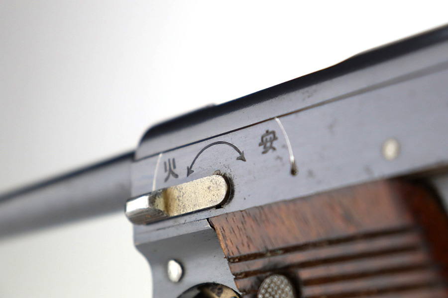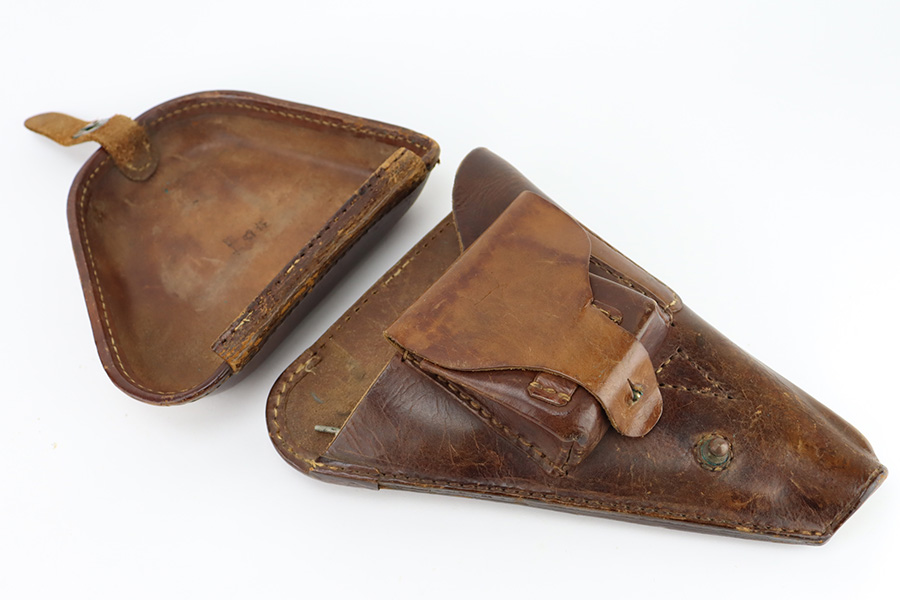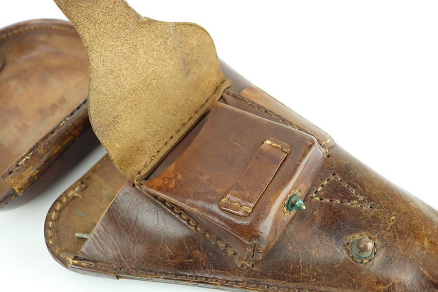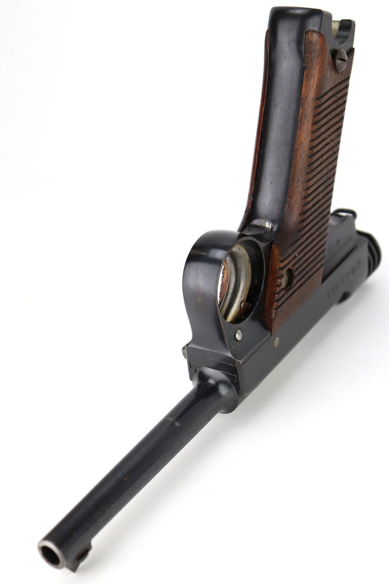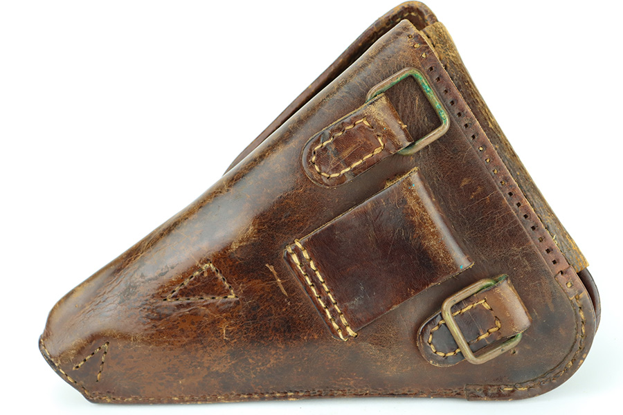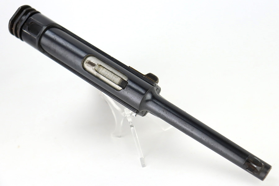 4/11/24 – This is a minty example of a Nambu Type 14 issued to the Japanese military in January of 1938. All matching and comes as a rig with a leather holster, one original matching-numbered magazine, one mismatched magazine, and a nickeled cleaning rod. The stitching from the holster’s top flap is missing, so the it is not attached. The gun has retained nearly all of its original finish, but there is light freckling along the barrel. The right grip panel is numbered and matching – the numbering on the left is illegible. Mint bore.