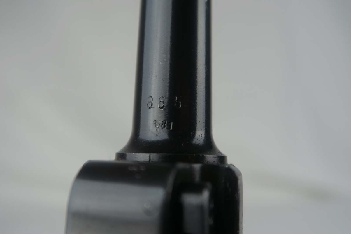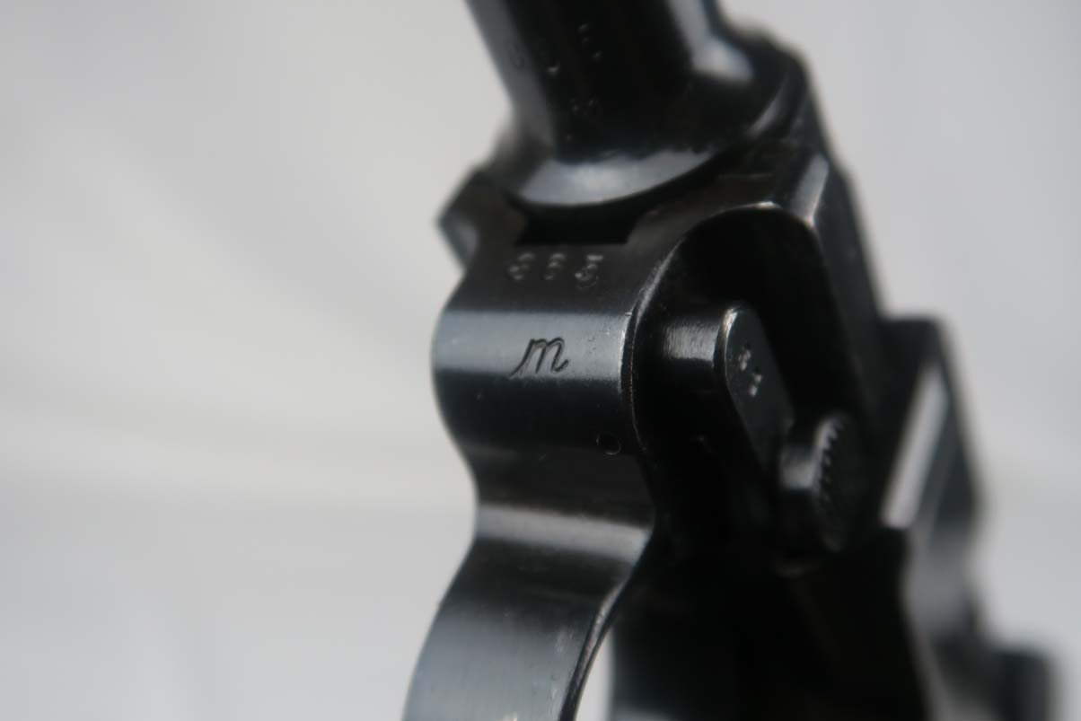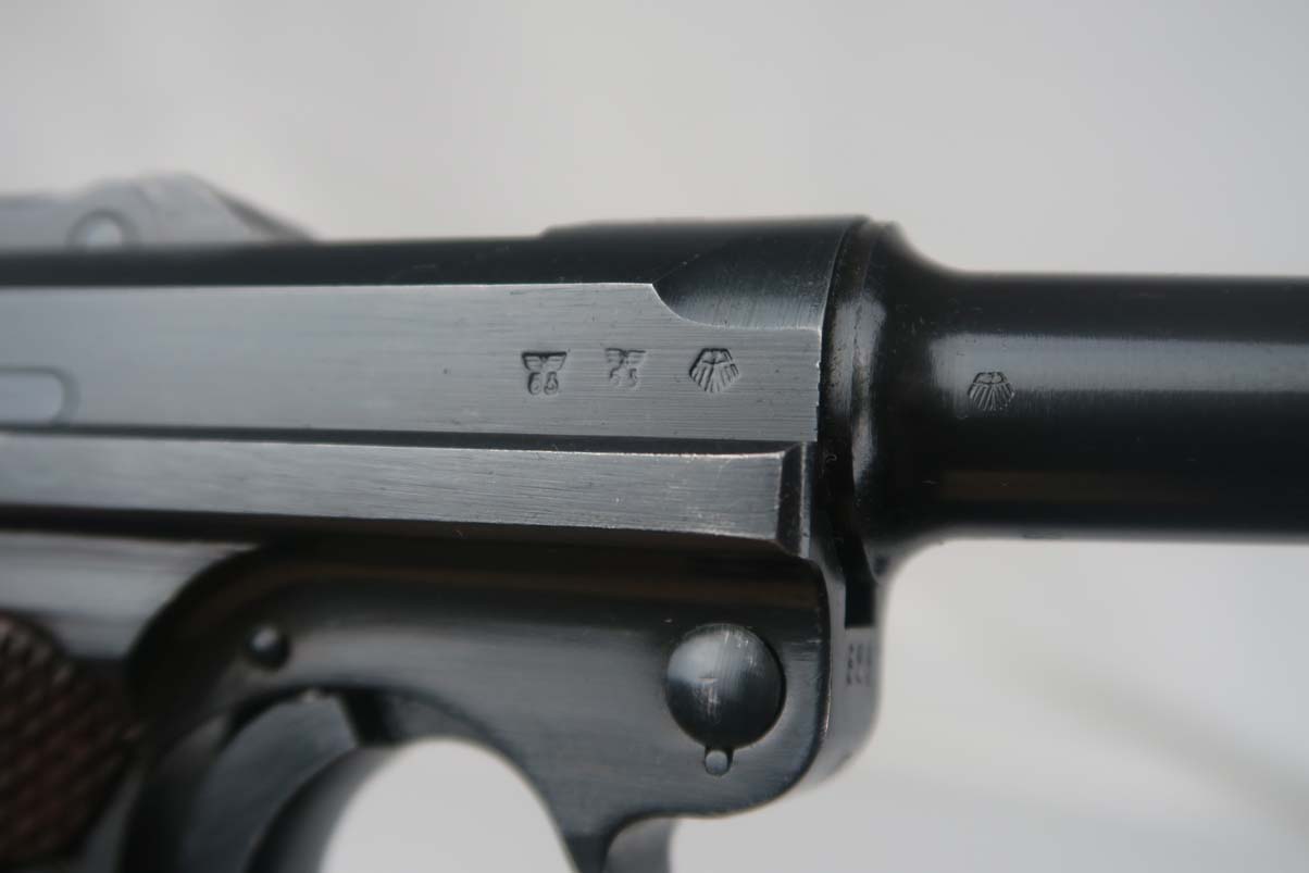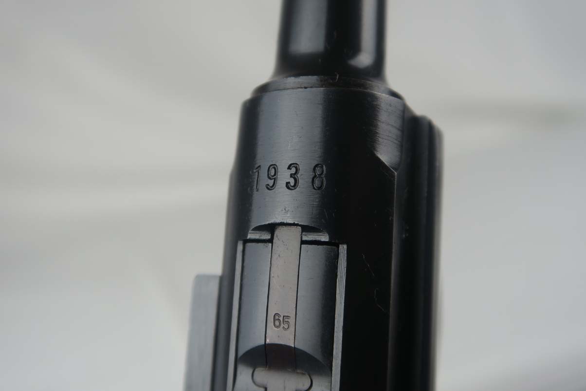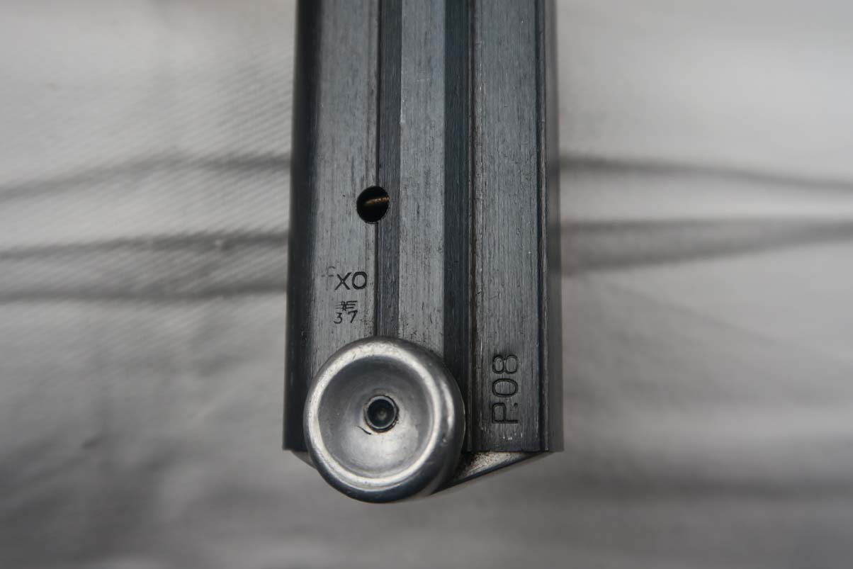 4/11/17 – This is a rare and desirable 1938 Mauser luger, issed to the German Navy as part of a 6,000 pistol procurement from 1936 to 1940. This one was issued to the East Sea Property, as evidenced by the O property mark on the front grip strap, which correctly runs lengthwise. The original finish is about 97%, with nearly all the wear on the side plate. Magazine is unmarked on the bottom, and fxo/37 proofed on the body. Grips are unmarked. Small parts are all matching, and correctly blued. Bore is excellent with no issues.