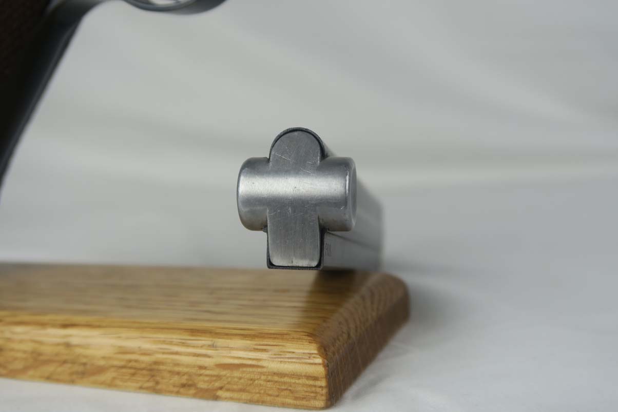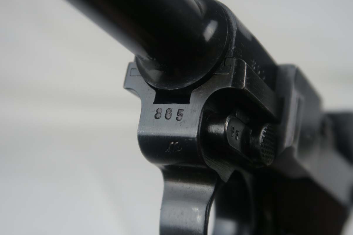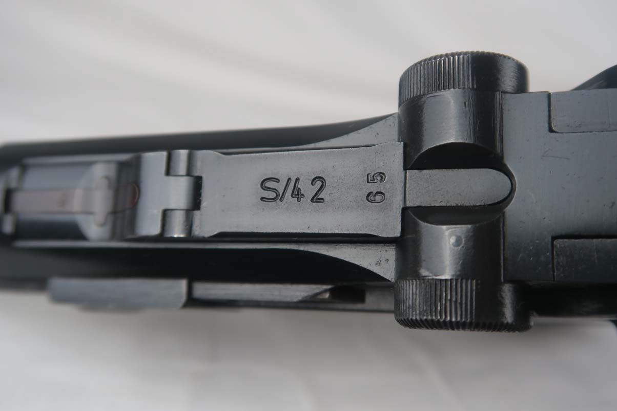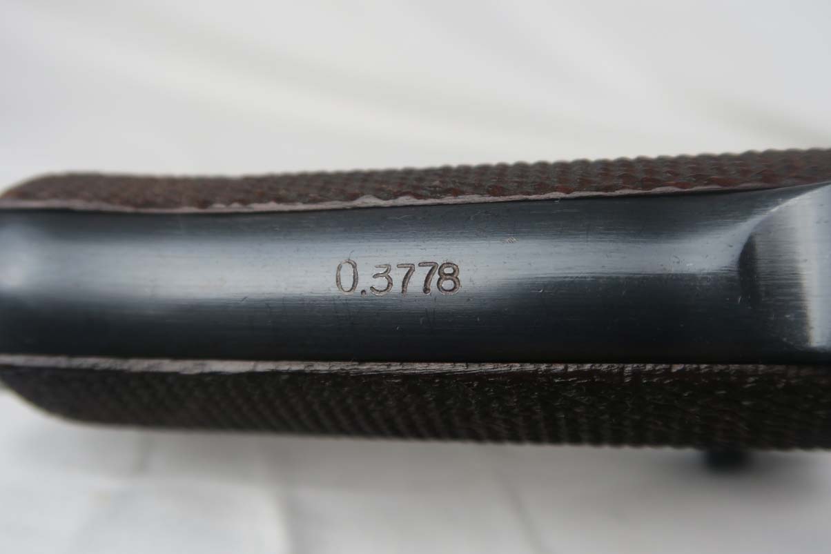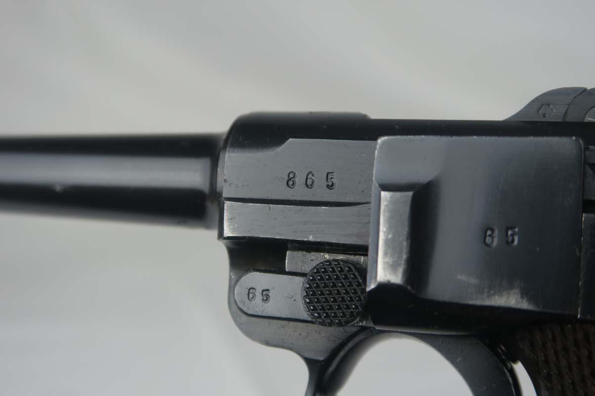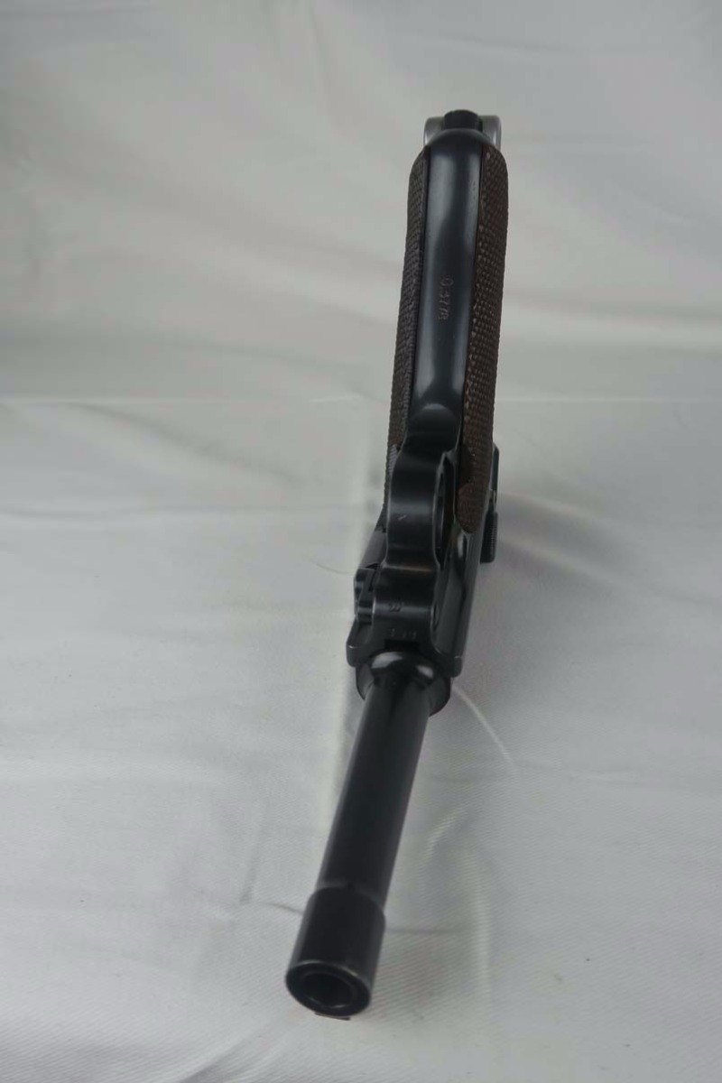 4/11/17 – This is a rare and desirable 1938 Mauser luger, issed to the German Navy as part of a 6,000 pistol procurement from 1936 to 1940. This one was issued to the East Sea Property, as evidenced by the O property mark on the front grip strap, which correctly runs lengthwise. The original finish is about 97%, with nearly all the wear on the side plate. Magazine is unmarked on the bottom, and fxo/37 proofed on the body. Grips are unmarked. Small parts are all matching, and correctly blued. Bore is excellent with no issues.