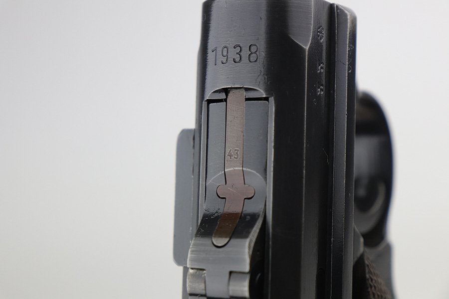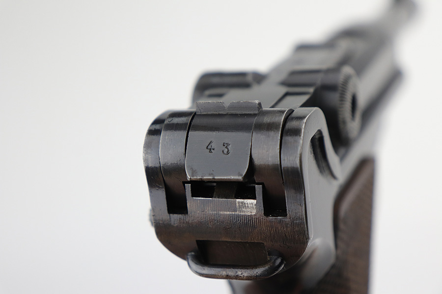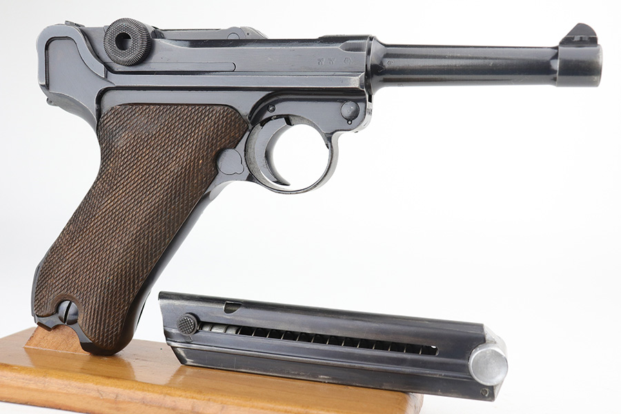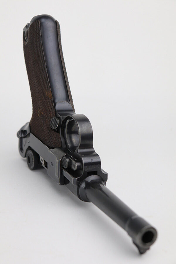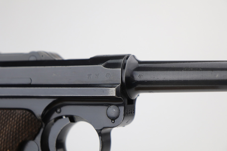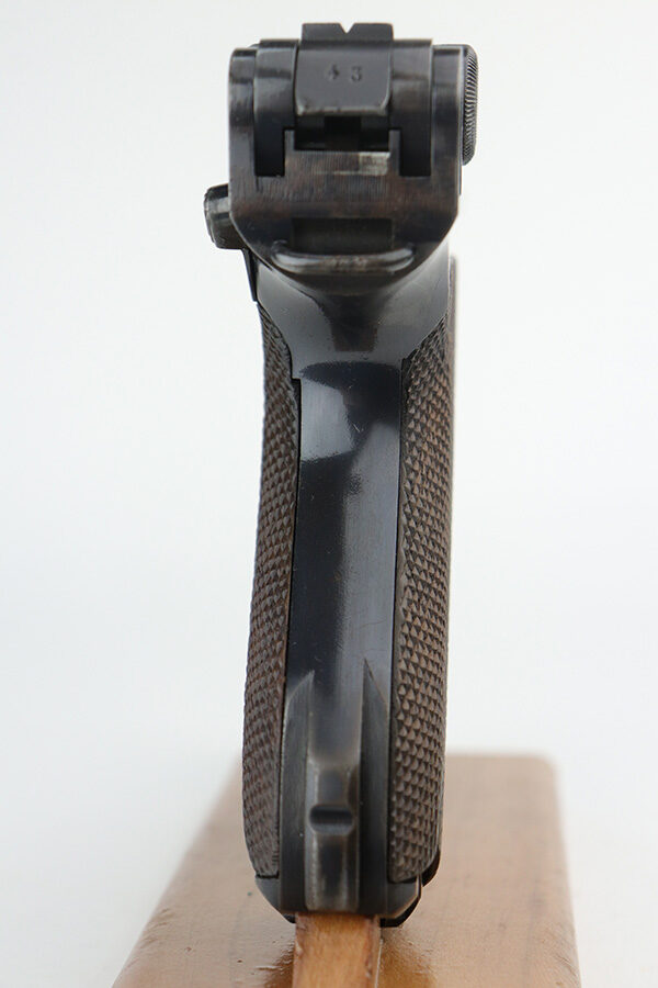 9/24/21 – This is an excellent example of a Mauser Luger issued to the Nazi military in 1938. It is all matching and has the proper “Eagle 63” military proofs. It has retained about 96% of its original finish. There is very minor wear on the side plate and on the side rails. Minor wear and some minor pin-pricking around the muzzle. Minor thinning and spotty wear on the barrel. Some light scratching on the front strap. Comes with nice matching grips – some minor bruising. Also comes with a period-correct mismatched re-numbered magazine. The bore has good rifling with minor pin-pricking throughout.