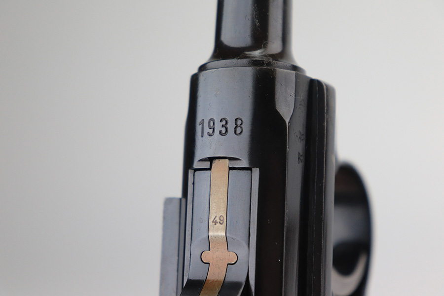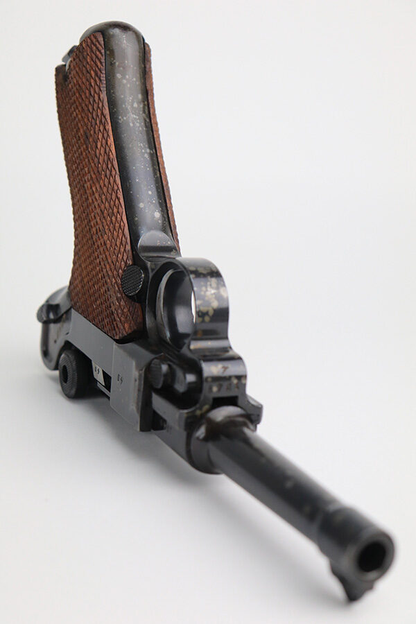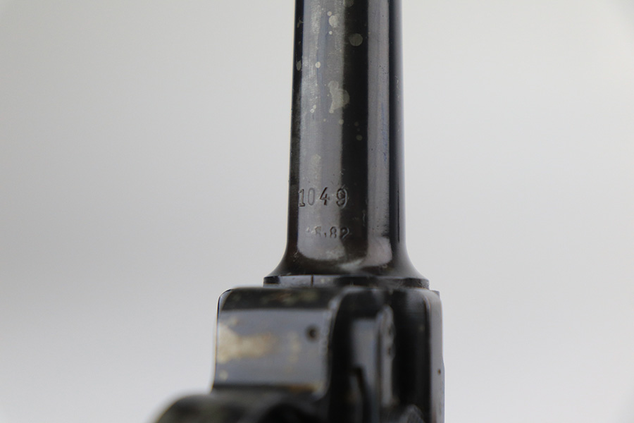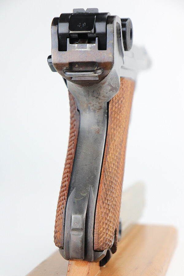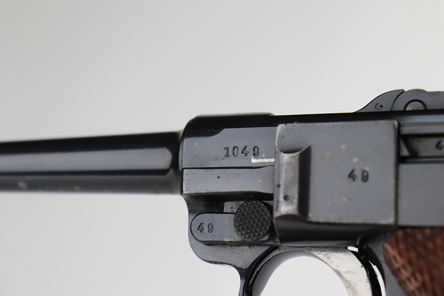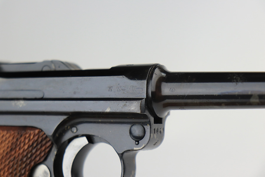 12/9/21 – This is a Mauser Luger that was issued to the Nazi military in 1938. It is all matching and has the proper “Eagle 63” Nazi military acceptance proofs on the right side of the slide. It has retained roughly 85% of its finish. We believe the gun has been refinished. There is some thinning and oxidation on the grips, but the most obvious sign of wear are dots of splotchy discoloration on the whole underside of the gun. These dots almost have the appearance of having been “splashed” onto the gun. There is also a little bit of this on the side plate and top of the back strap as well. A few small areas of discoloration and minor pitting along the right side rail. The gun comes with replacement wood grips and a post-war magazine. The bore has good rifling with minor pin-pricking throughout. This gun would make an excellent shooter.