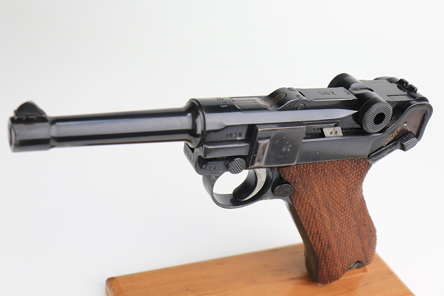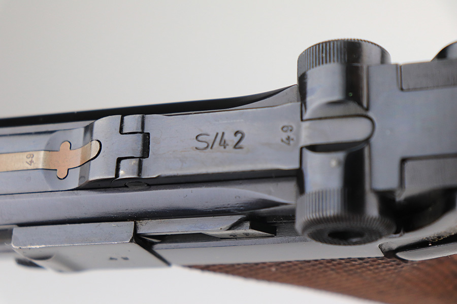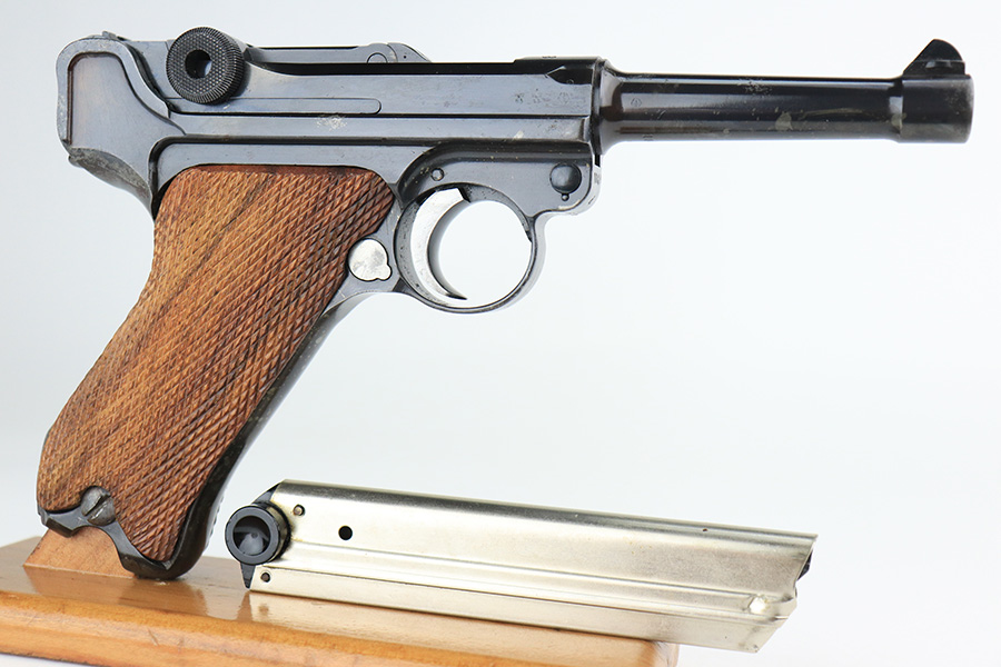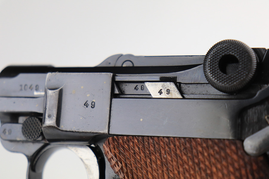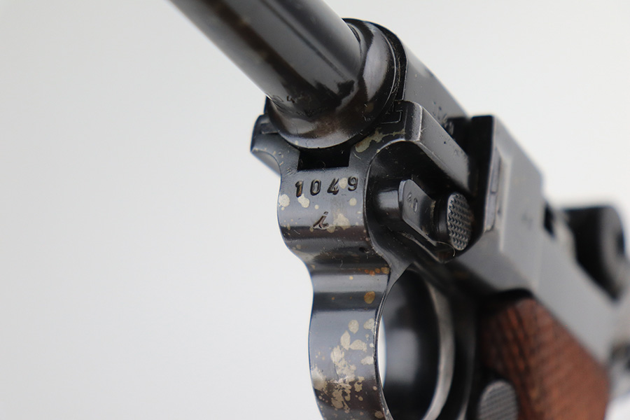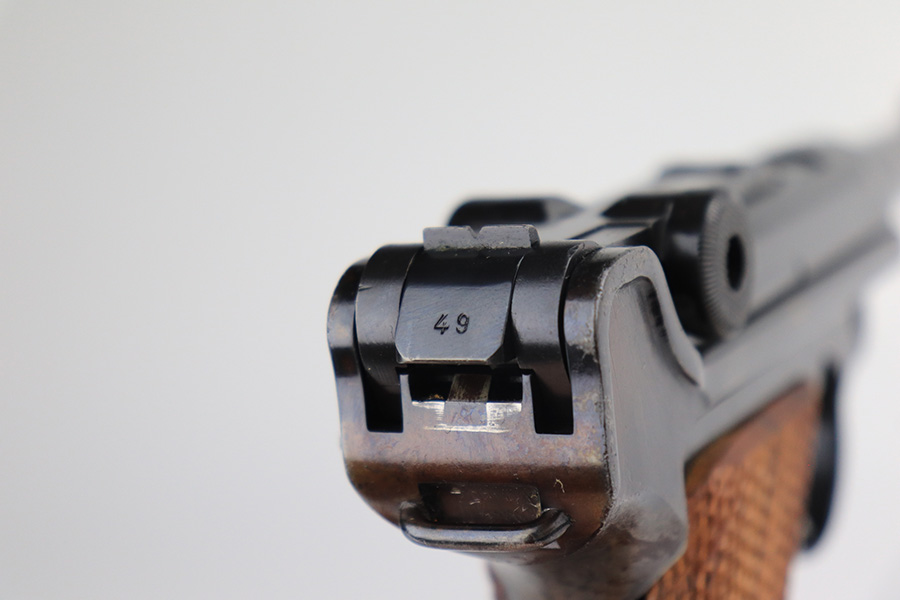 12/9/21 – This is a Mauser Luger that was issued to the Nazi military in 1938. It is all matching and has the proper “Eagle 63” Nazi military acceptance proofs on the right side of the slide. It has retained roughly 85% of its finish. We believe the gun has been refinished. There is some thinning and oxidation on the grips, but the most obvious sign of wear are dots of splotchy discoloration on the whole underside of the gun. These dots almost have the appearance of having been “splashed” onto the gun. There is also a little bit of this on the side plate and top of the back strap as well. A few small areas of discoloration and minor pitting along the right side rail. The gun comes with replacement wood grips and a post-war magazine. The bore has good rifling with minor pin-pricking throughout. This gun would make an excellent shooter.