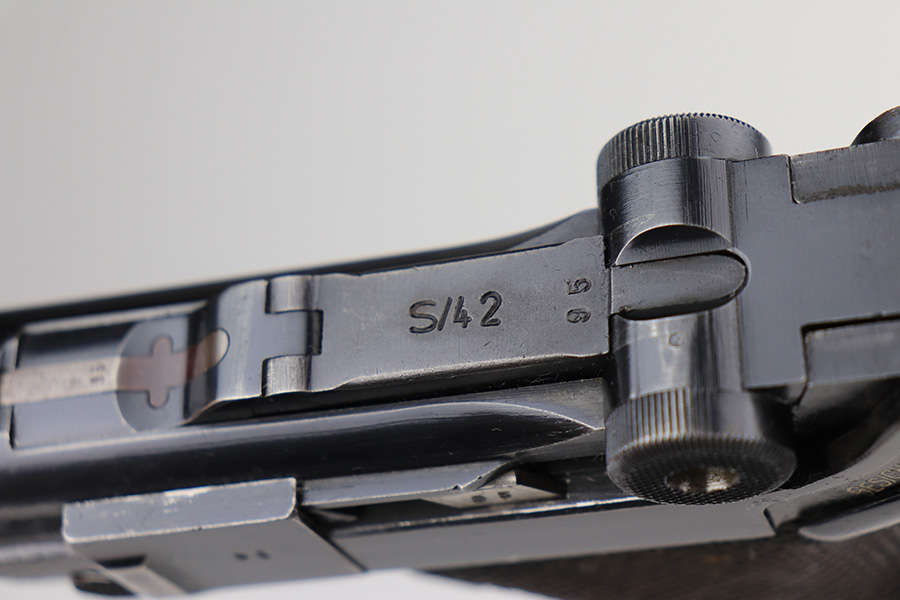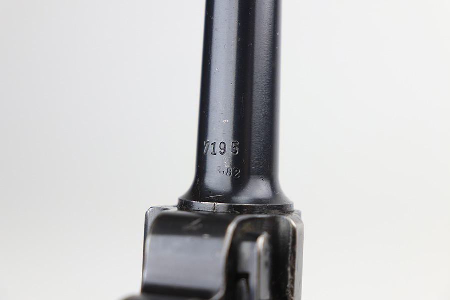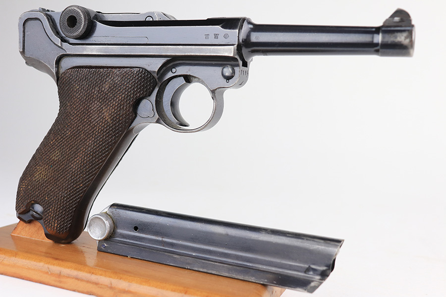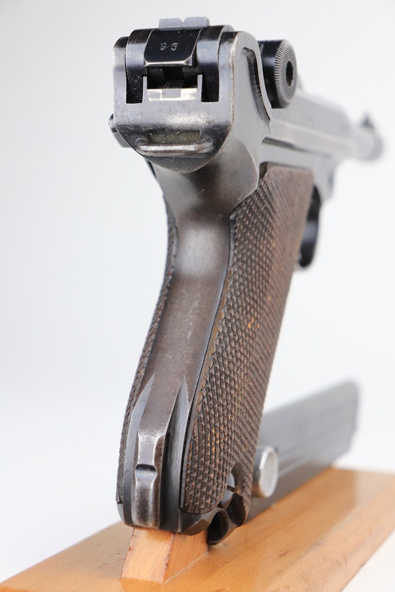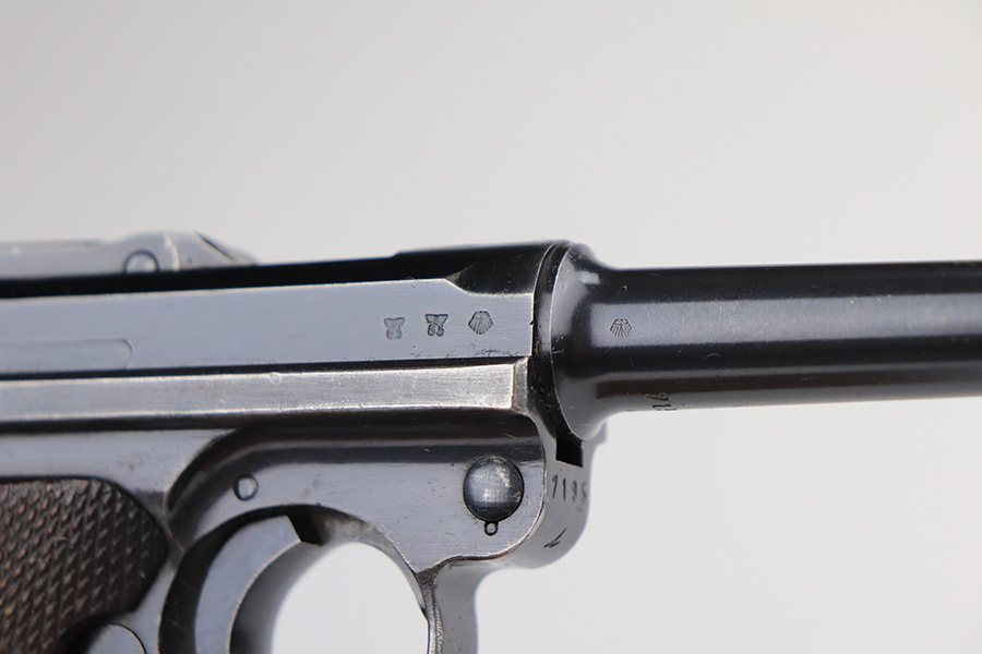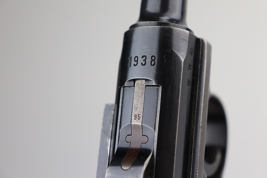 5/17/22 – This is a matching and original Nazi Mauser Luger from 1938. It has 85-90% of the original blue remaining. Some patina and thinning on the grip straps, and some finish loss on the rails, muzzle and sideplate. Has the original, matching grips. Generally sharp checkering but the common chip under the safety. Excellent bore. Period original but mismatched magazine.