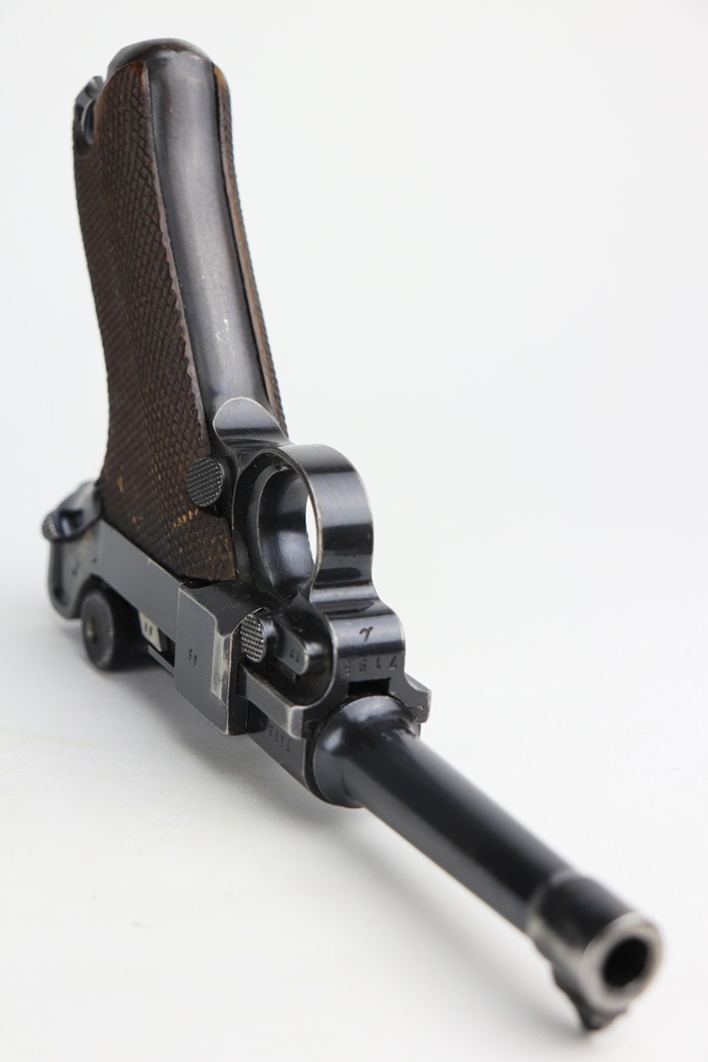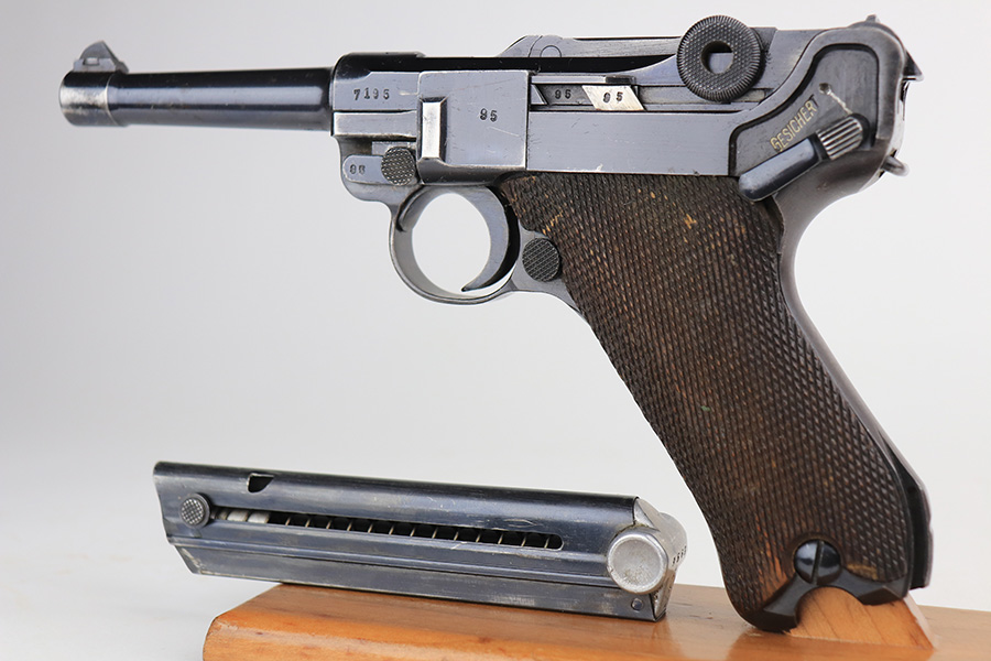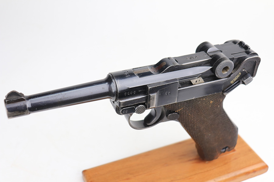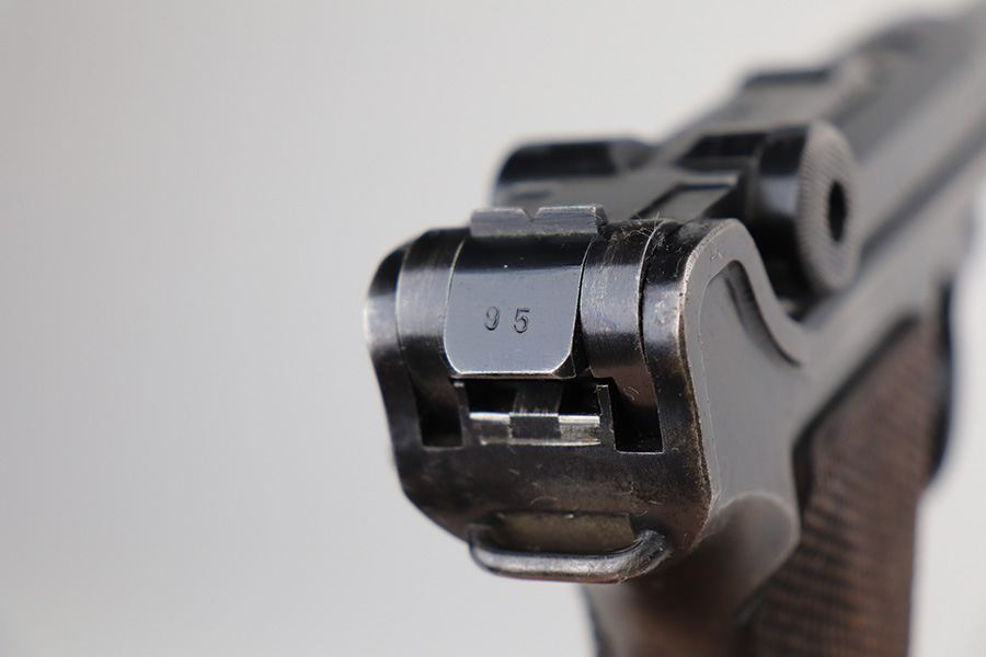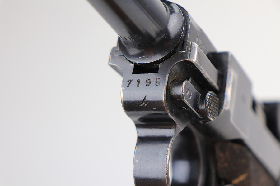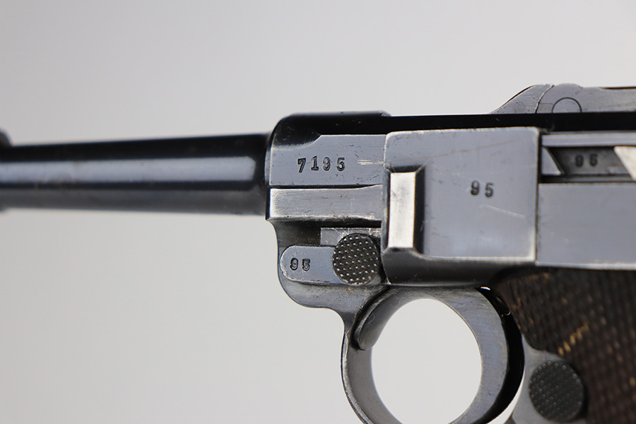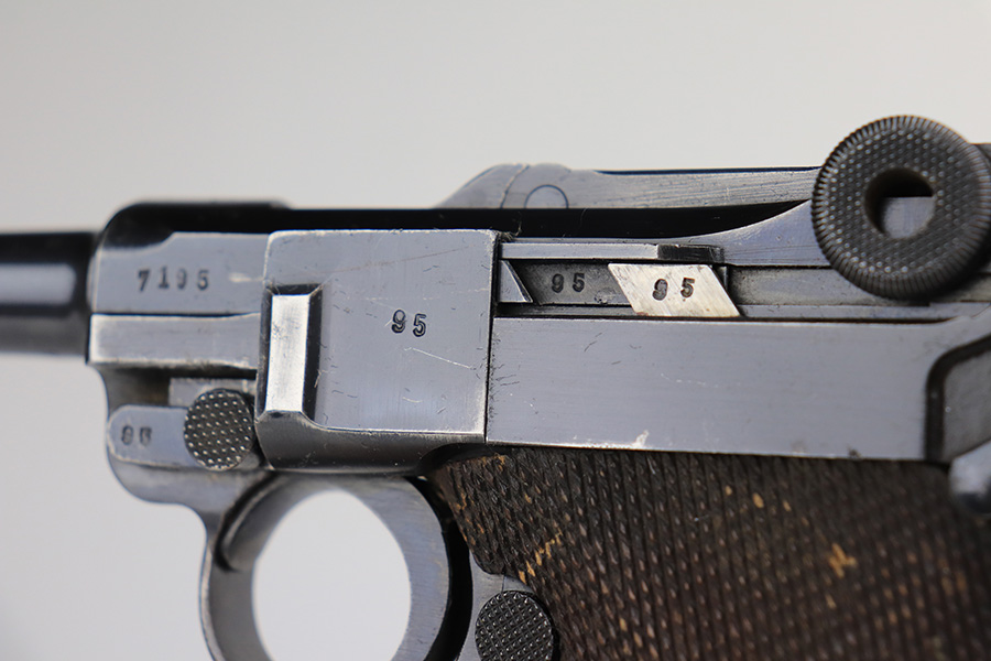 5/17/22 – This is a matching and original Nazi Mauser Luger from 1938. It has 85-90% of the original blue remaining. Some patina and thinning on the grip straps, and some finish loss on the rails, muzzle and sideplate. Has the original, matching grips. Generally sharp checkering but the common chip under the safety. Excellent bore. Period original but mismatched magazine.