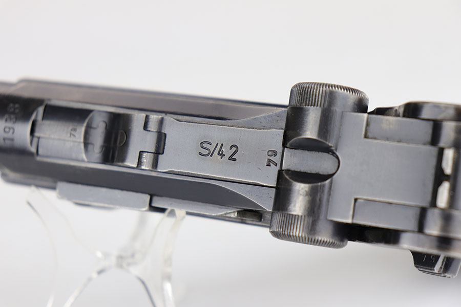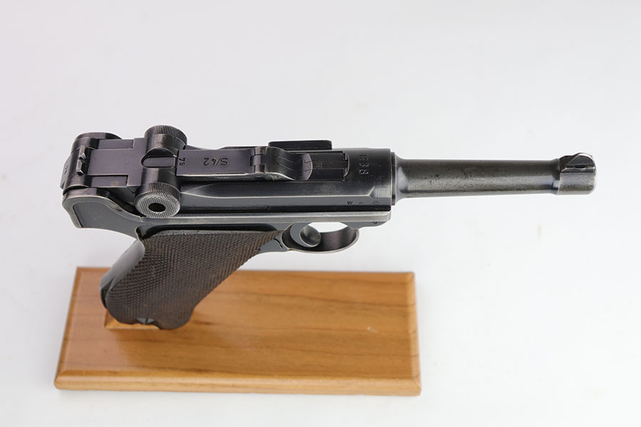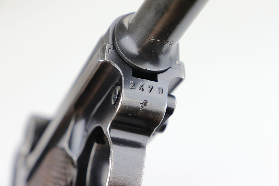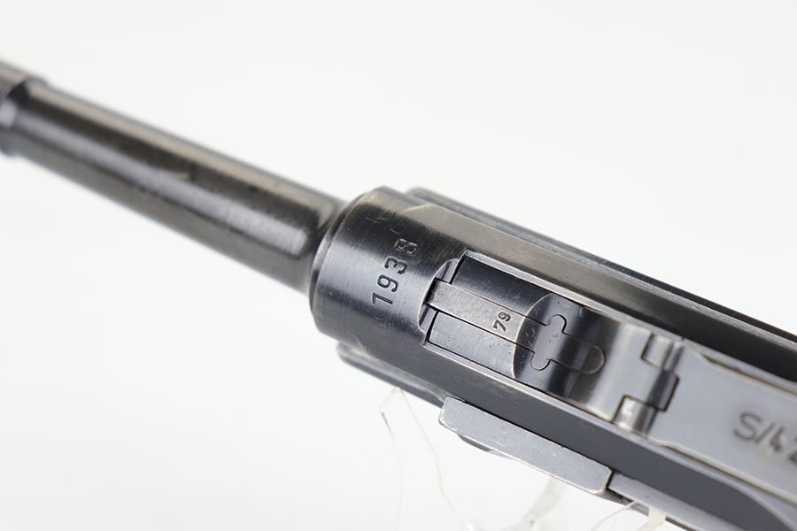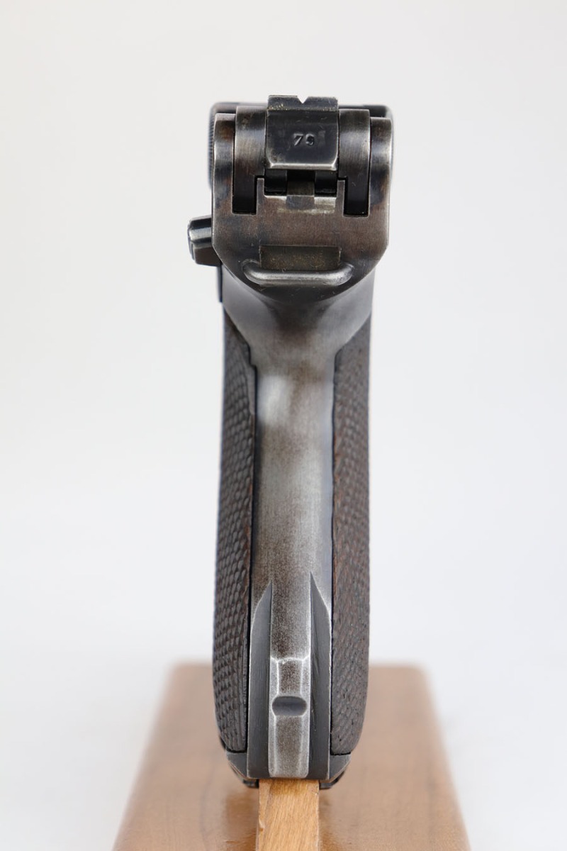 4/10/20 – This is an all matching and original Mauser Luger from 1938, including the original grips. The pistol shows some thinning in all areas, especially the straps and barrel. No corrosion or otherwise major defects though. Left grip panel has the common chip under the safety. Period original but mismatched magazine. Excellent bore.