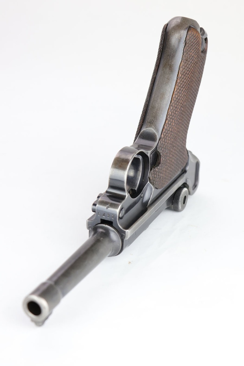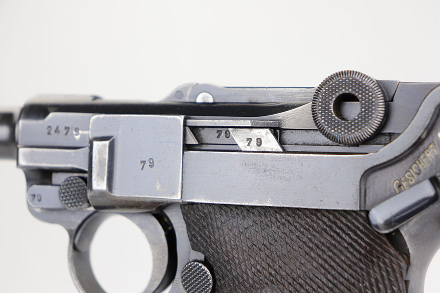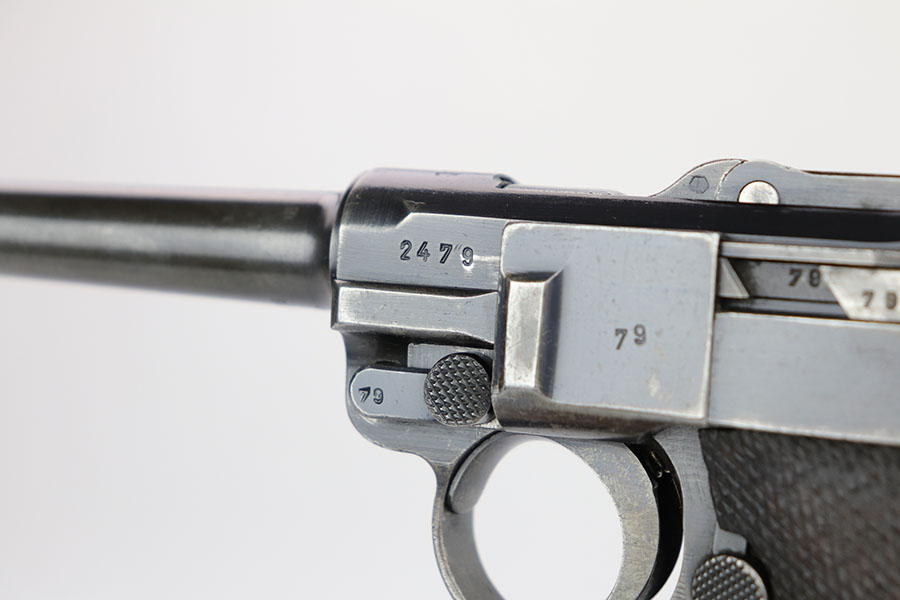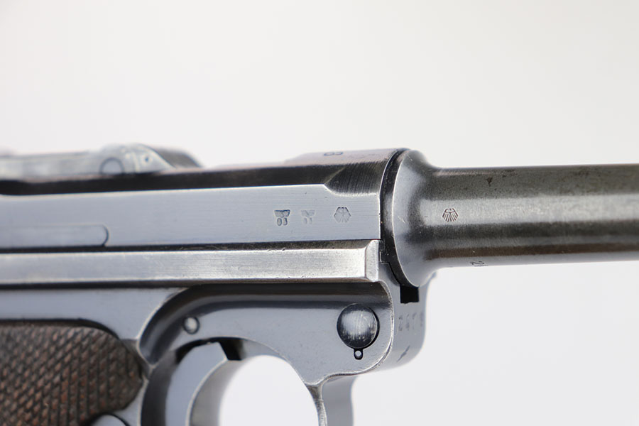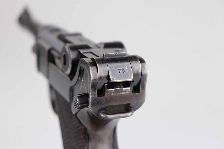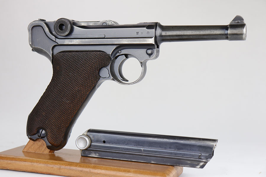 4/10/20 – This is an all matching and original Mauser Luger from 1938, including the original grips. The pistol shows some thinning in all areas, especially the straps and barrel. No corrosion or otherwise major defects though. Left grip panel has the common chip under the safety. Period original but mismatched magazine. Excellent bore.