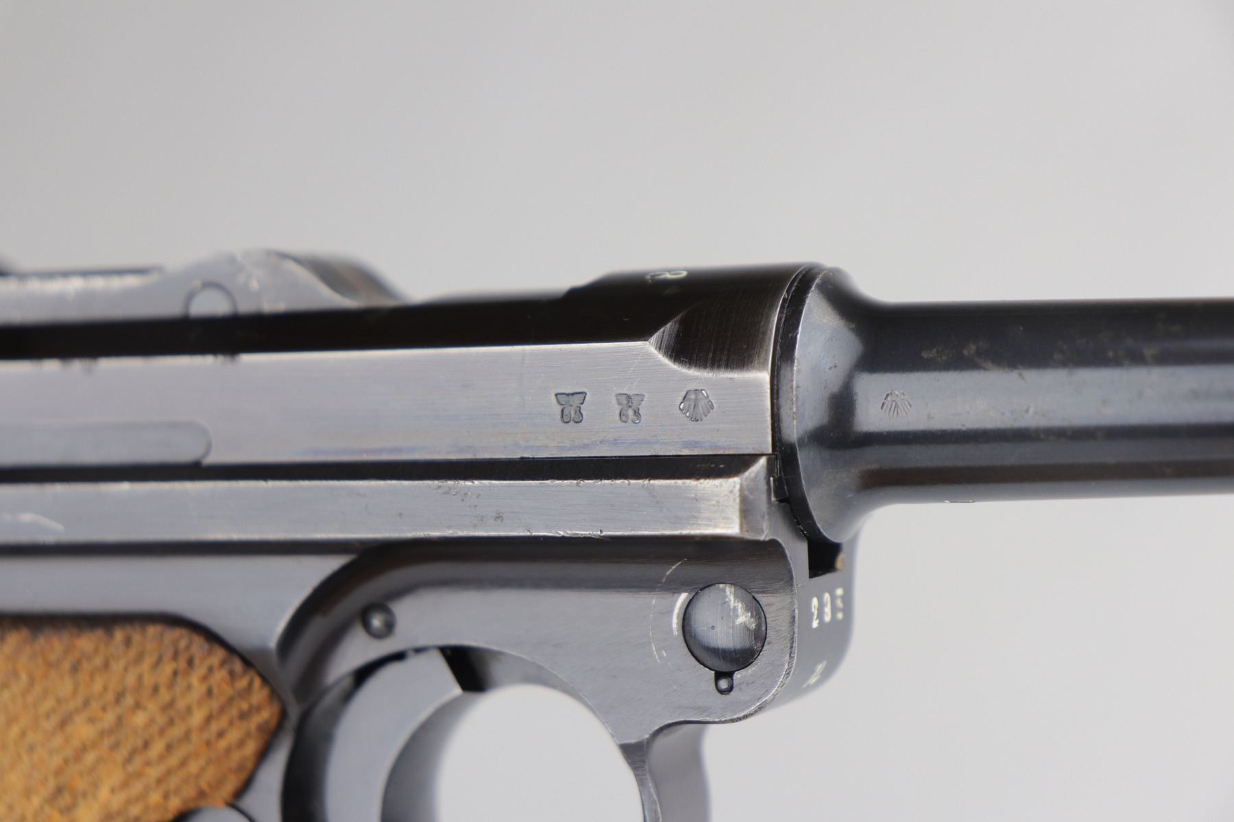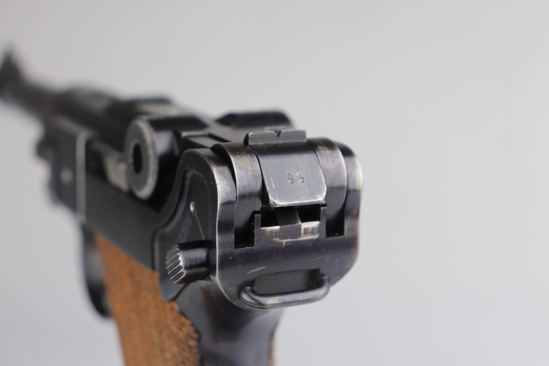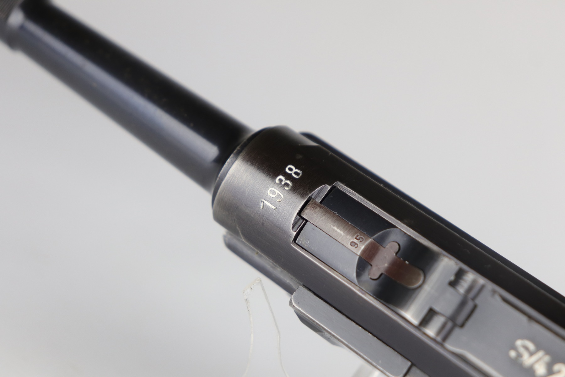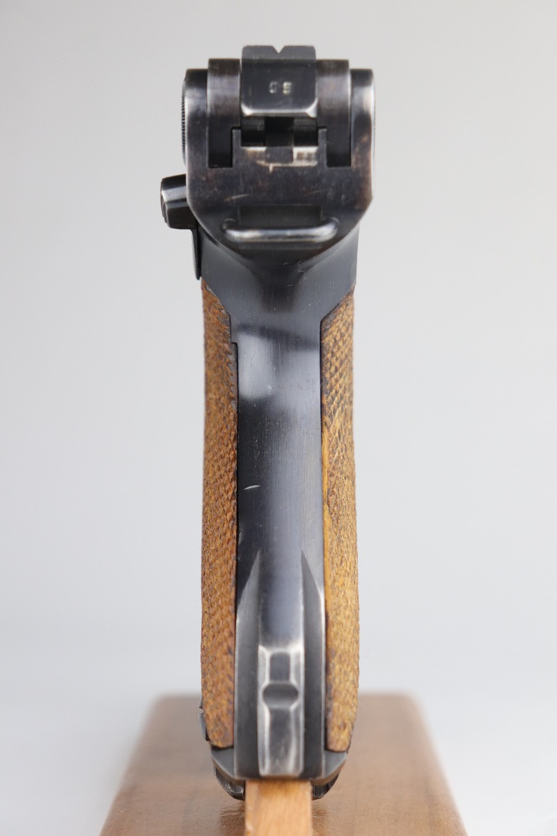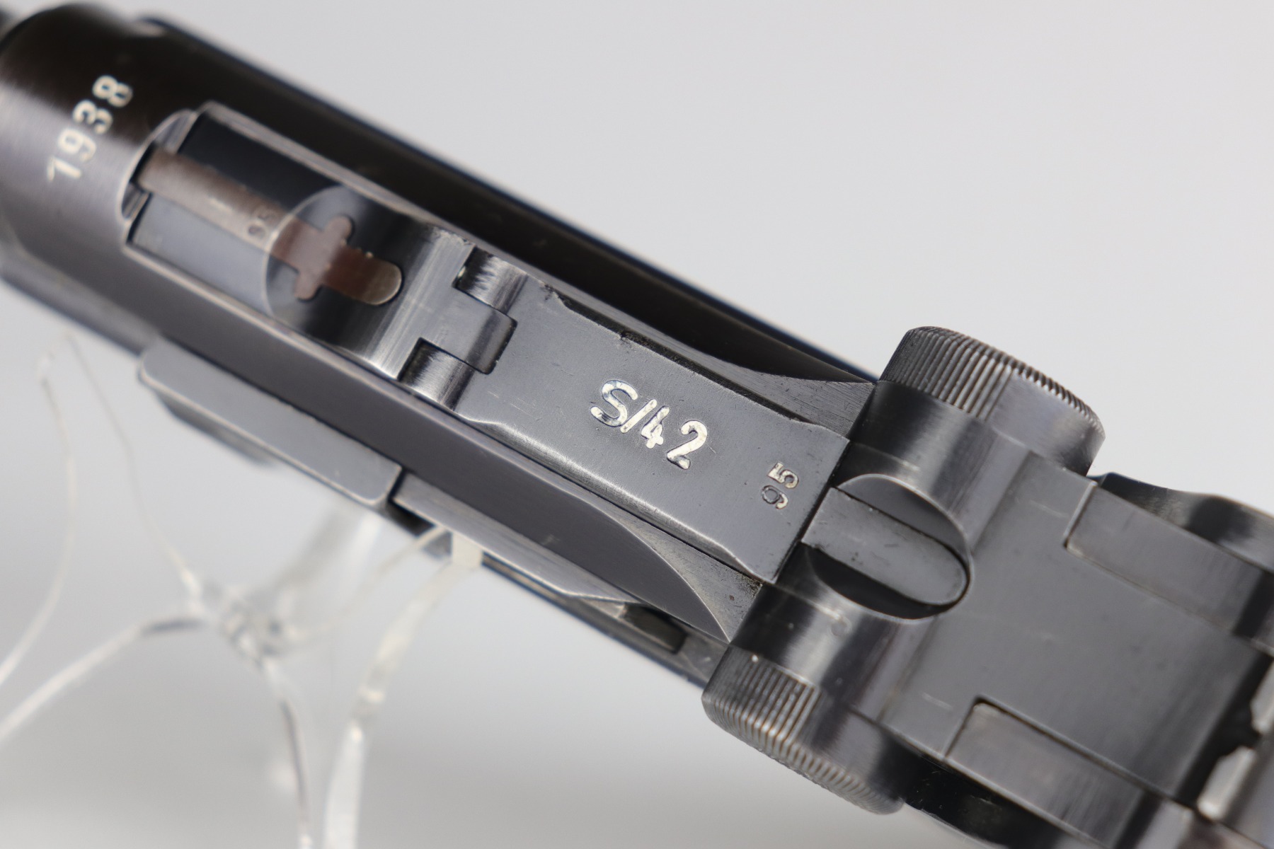 7/28/20 – This is a WW2 Mauser Luger P.08 issued to the Nazi military in 1938. The chamber is dated in 1938, and the toggle has the Mauser factory code “S/42”. The right side of the slide is the proper “Eagle 63” Nazi military acceptance proofs. All numbered parts are matching. This gun has retained about 92-94% of its original finish. There is very minor thinning on the straps, but most of the wear is minor muzzle and high edge wear (especially on the side plate). There is very light spotty wear on the barrel and a very small ding on the underside. There is another very small ding on the very bottom of the front strap. The grips are excellent and matching to the gun. The bore is very nice with only very minor frosting. It comes with a period-correct magazine that has the proper “Eagle 63” proof but is not numbered to the gun.