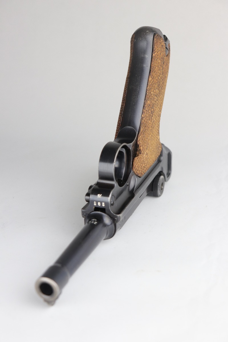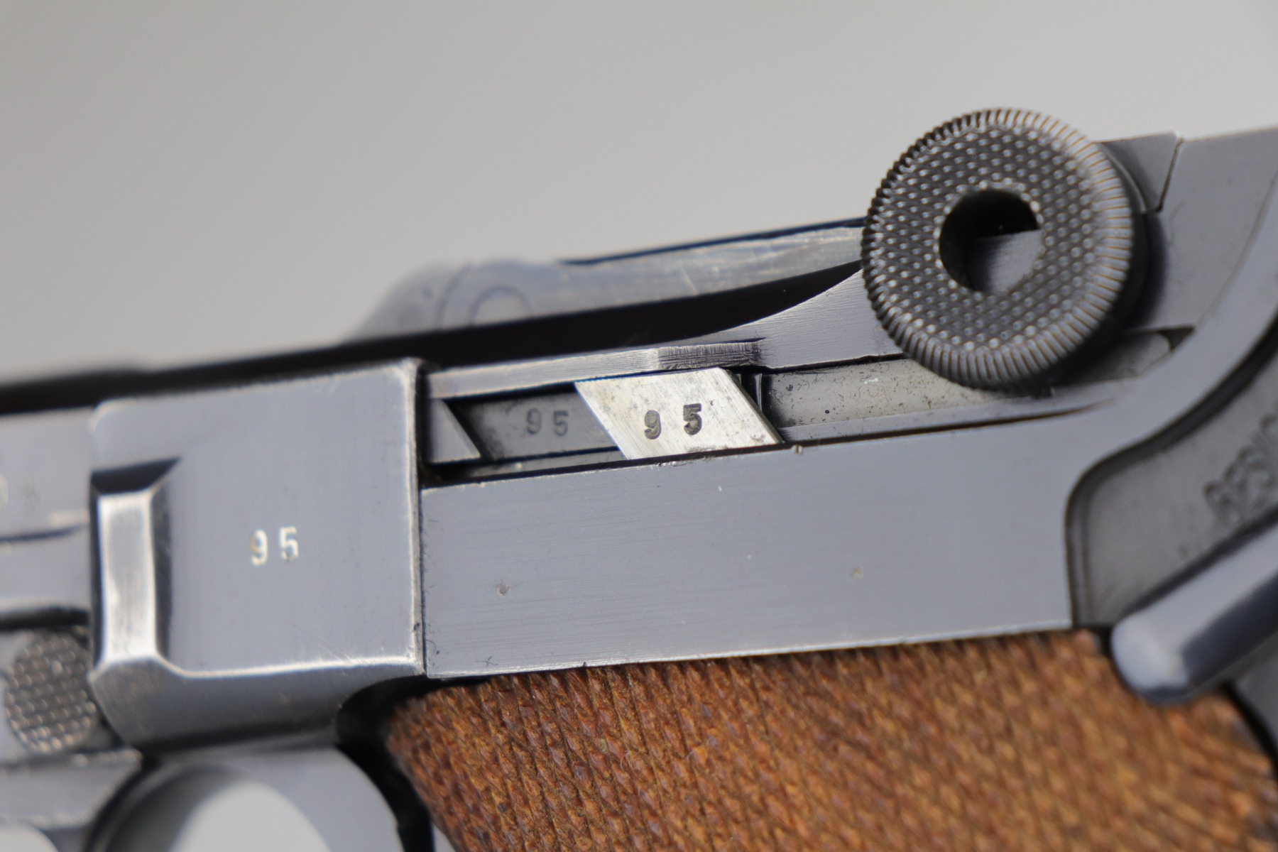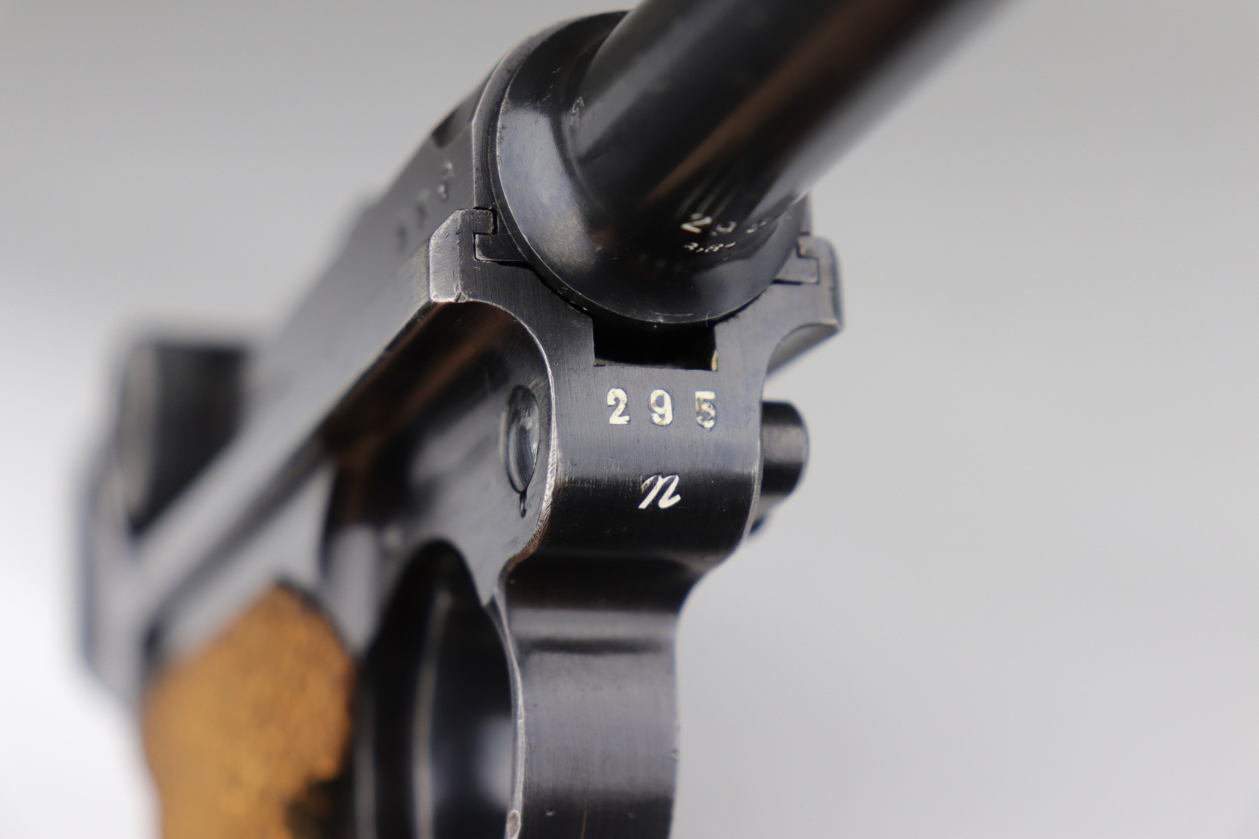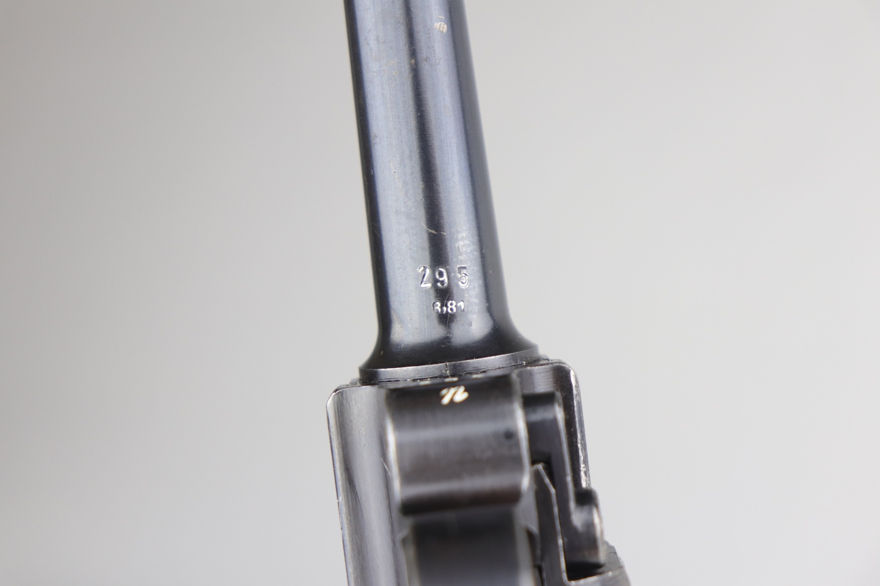 7/28/20 – This is a WW2 Mauser Luger P.08 issued to the Nazi military in 1938. The chamber is dated in 1938, and the toggle has the Mauser factory code “S/42”. The right side of the slide is the proper “Eagle 63” Nazi military acceptance proofs. All numbered parts are matching. This gun has retained about 92-94% of its original finish. There is very minor thinning on the straps, but most of the wear is minor muzzle and high edge wear (especially on the side plate). There is very light spotty wear on the barrel and a very small ding on the underside. There is another very small ding on the very bottom of the front strap. The grips are excellent and matching to the gun. The bore is very nice with only very minor frosting. It comes with a period-correct magazine that has the proper “Eagle 63” proof but is not numbered to the gun.