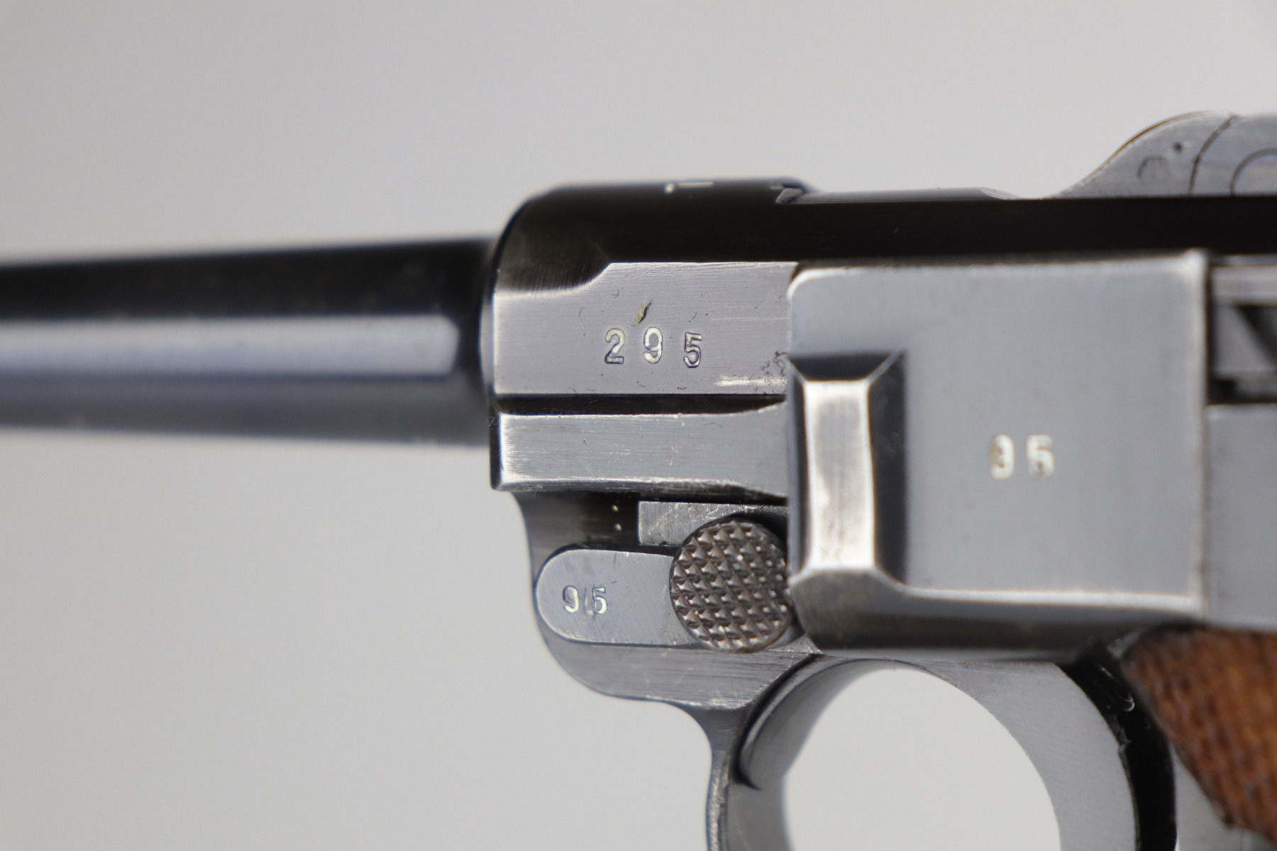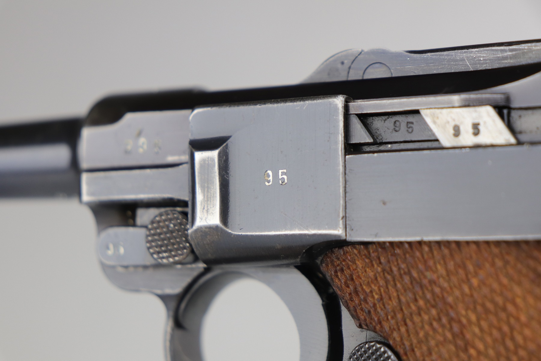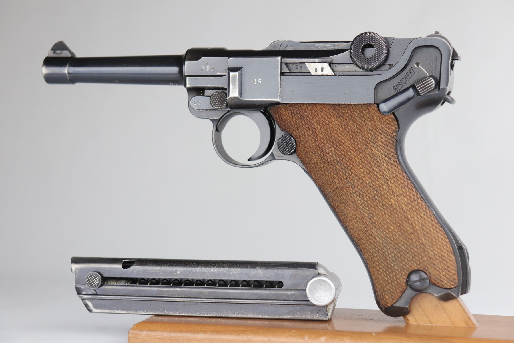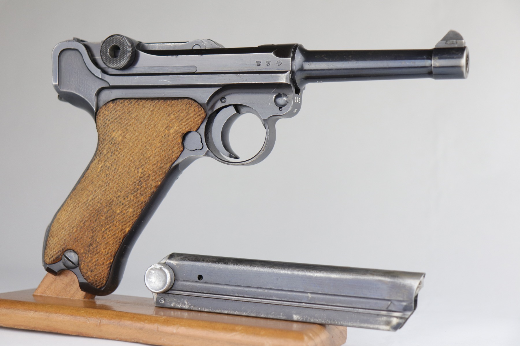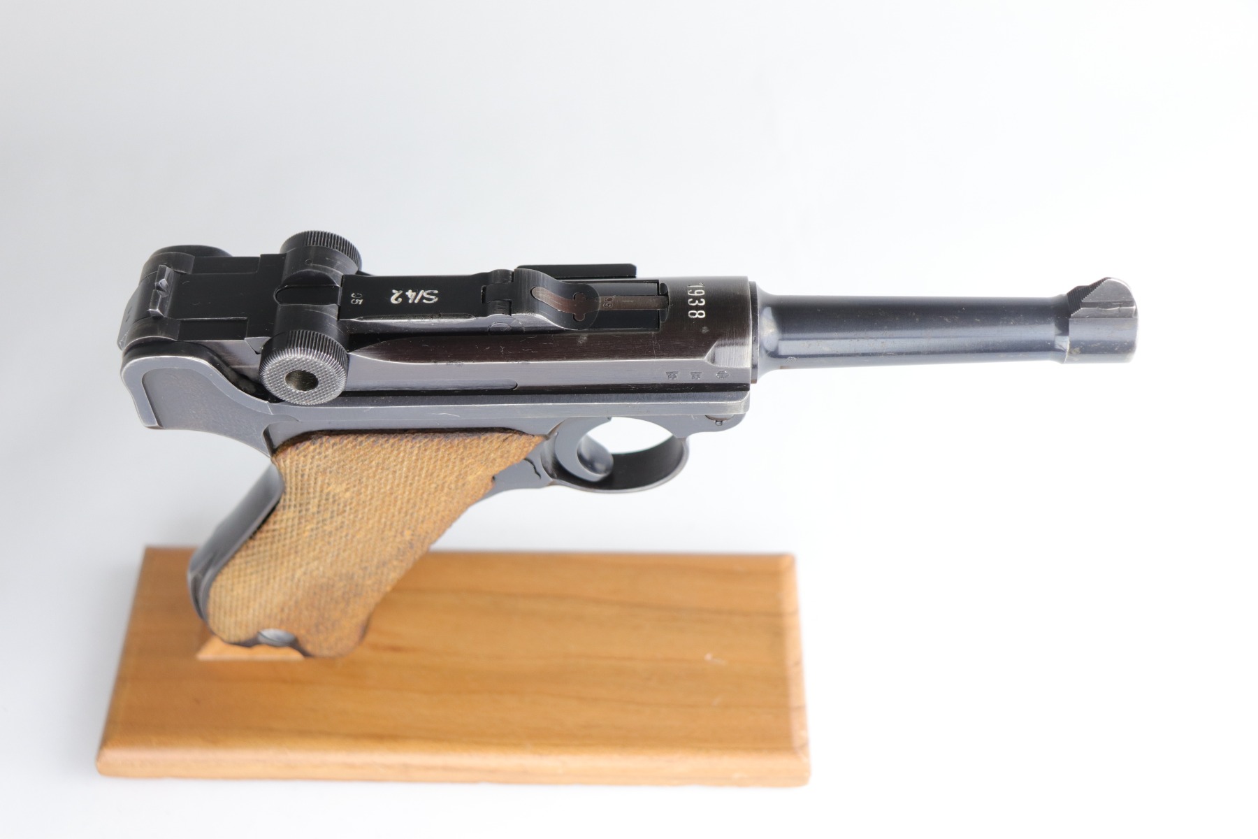 7/28/20 – This is a WW2 Mauser Luger P.08 issued to the Nazi military in 1938. The chamber is dated in 1938, and the toggle has the Mauser factory code “S/42”. The right side of the slide is the proper “Eagle 63” Nazi military acceptance proofs. All numbered parts are matching. This gun has retained about 92-94% of its original finish. There is very minor thinning on the straps, but most of the wear is minor muzzle and high edge wear (especially on the side plate). There is very light spotty wear on the barrel and a very small ding on the underside. There is another very small ding on the very bottom of the front strap. The grips are excellent and matching to the gun. The bore is very nice with only very minor frosting. It comes with a period-correct magazine that has the proper “Eagle 63” proof but is not numbered to the gun.