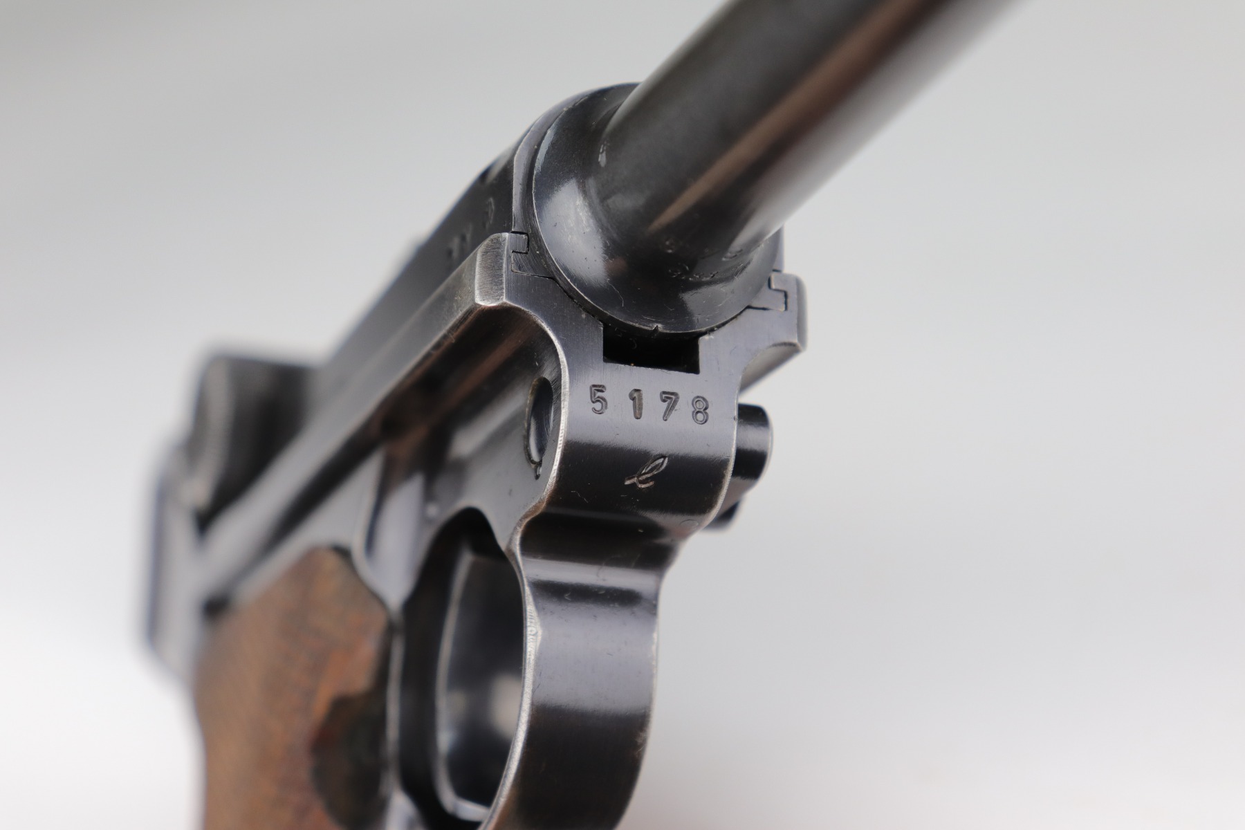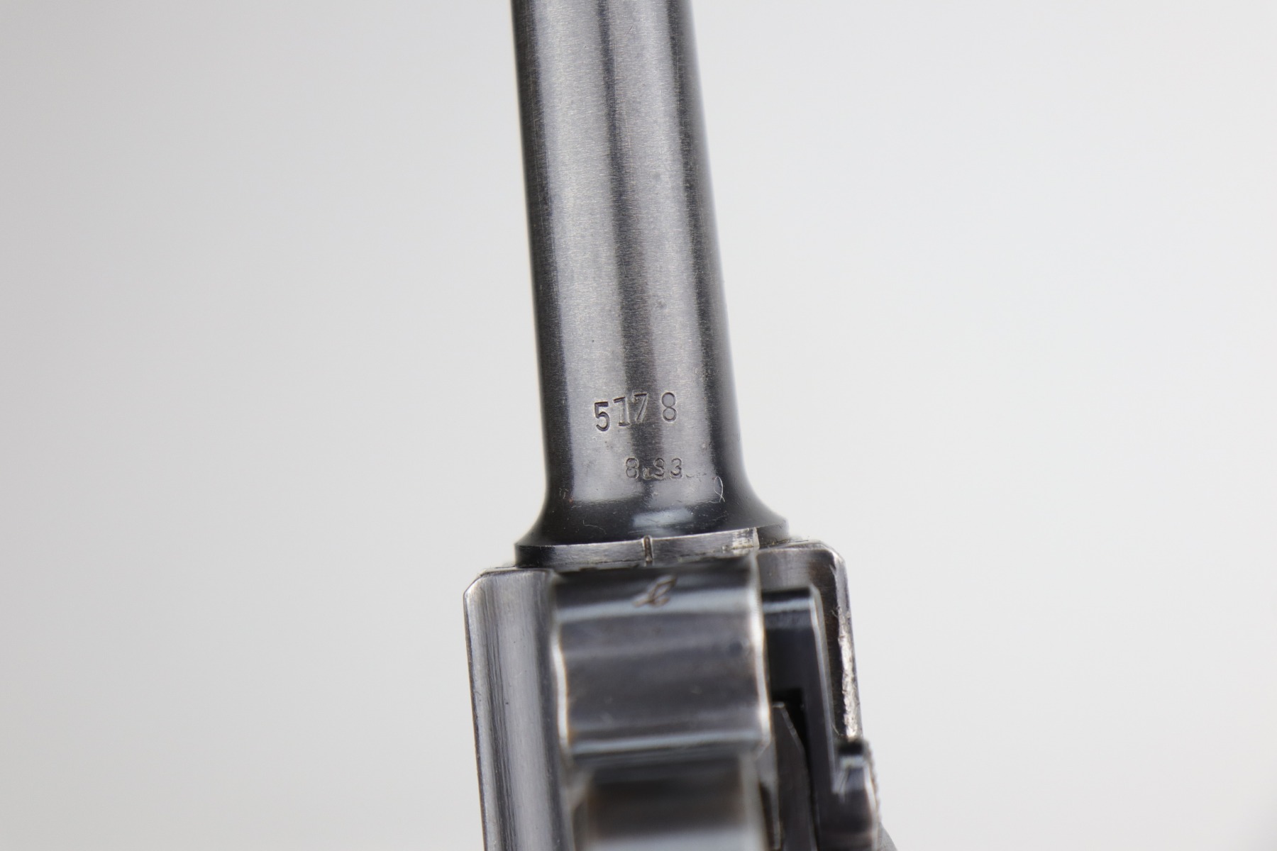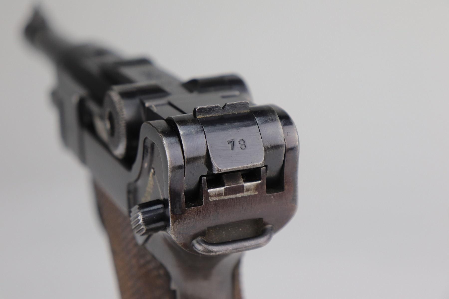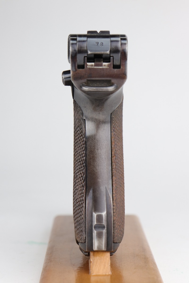 12/23/21- This is a nice example of a Mauser Luger issued to the Nazi military in 1938. It is all matching and has the proper “Eagle 63” Nazi military acceptance proofs. It has retained roughly 75% of its original bluing. There is thinning on both straps and on the barrel and minor wear around the muzzle, on some of the high edges of the slide and frame, and on the side plate. A few areas of very minor oxidation. Excellent grips – one is matching and the other is un-numbered. It comes with a mismatched period-correct magazine. The bore has decent rifling, but there is pitting throughout.