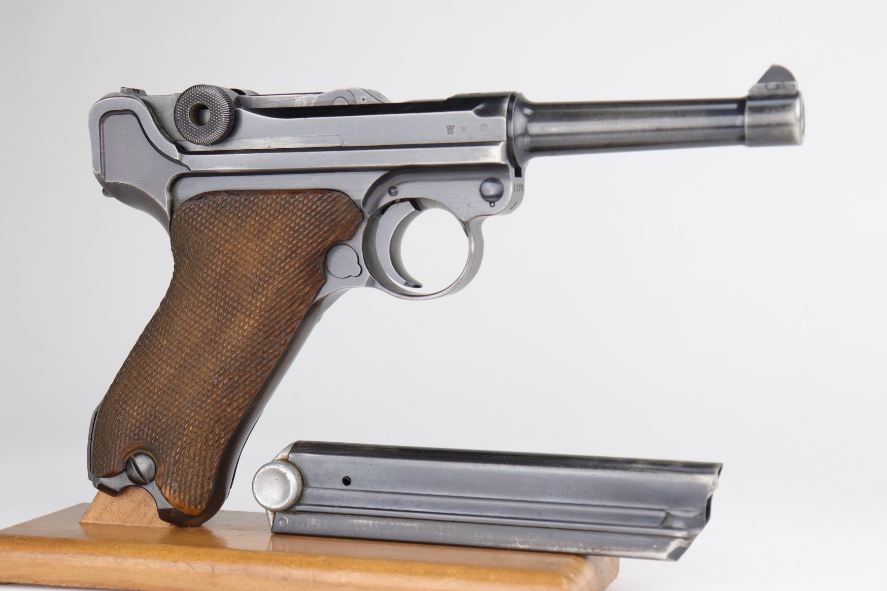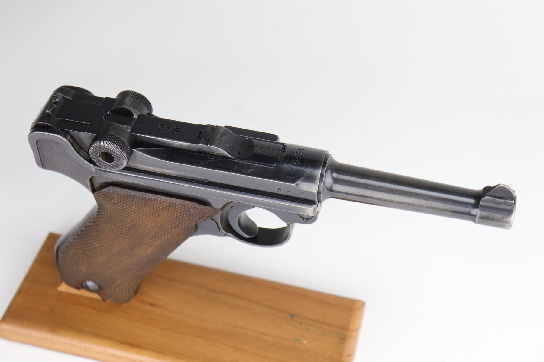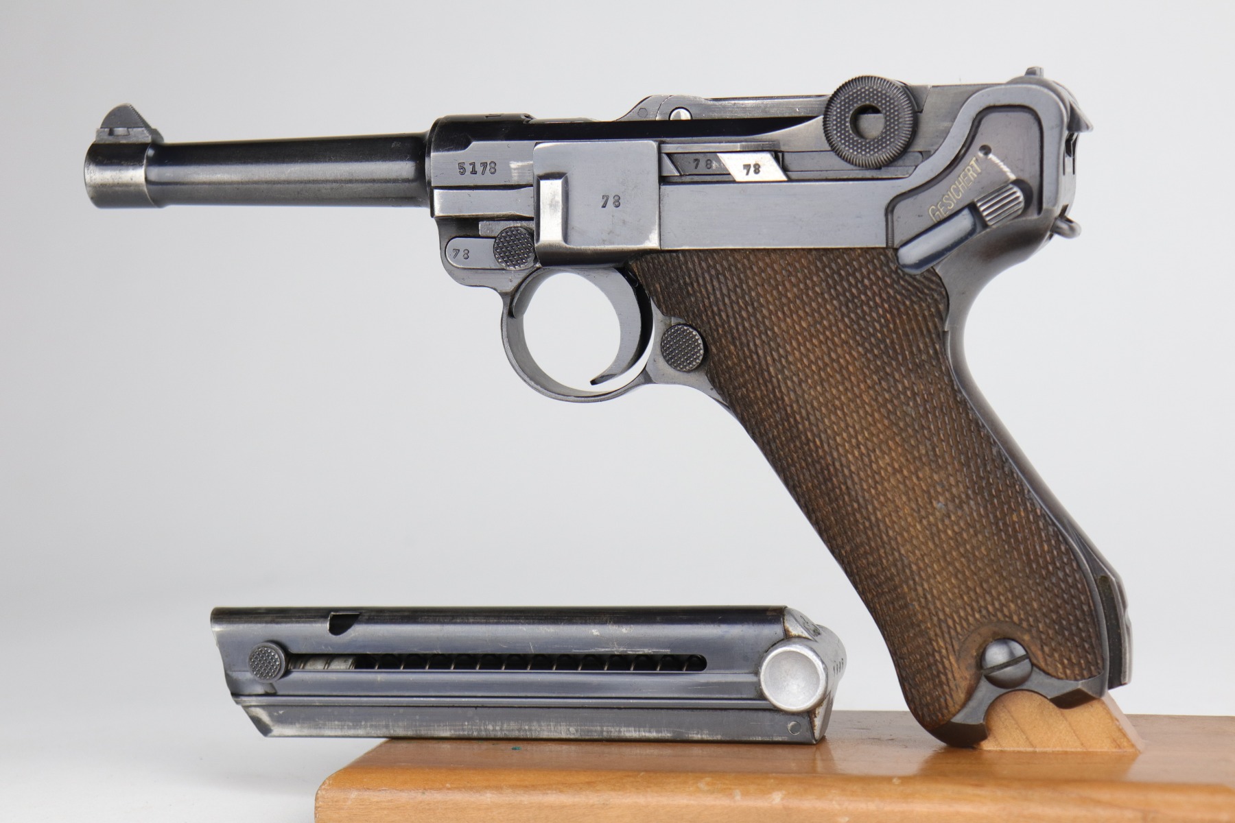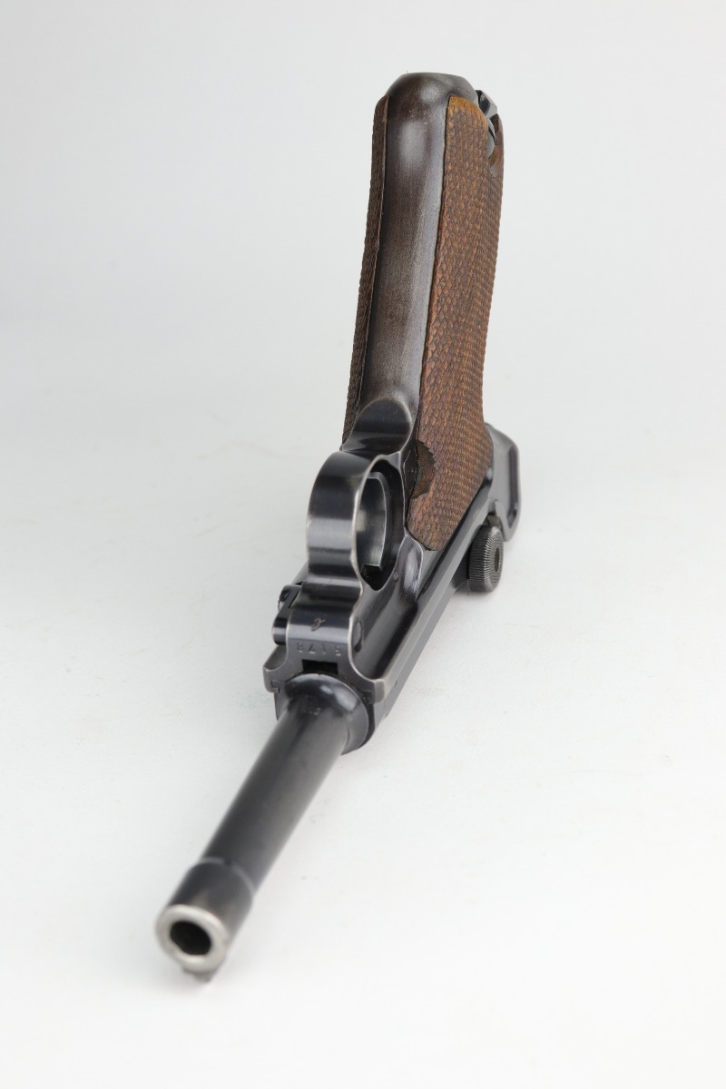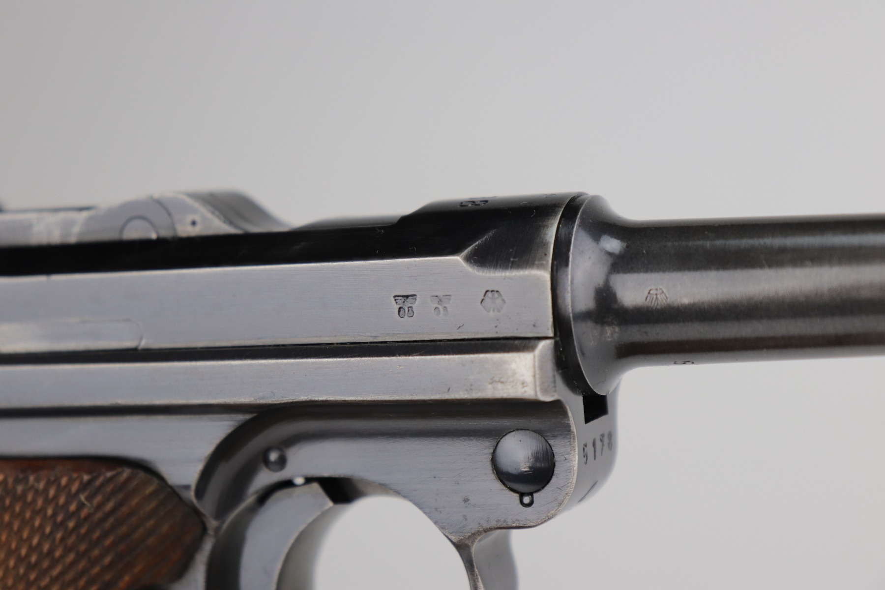 12/23/21- This is a nice example of a Mauser Luger issued to the Nazi military in 1938. It is all matching and has the proper “Eagle 63” Nazi military acceptance proofs. It has retained roughly 75% of its original bluing. There is thinning on both straps and on the barrel and minor wear around the muzzle, on some of the high edges of the slide and frame, and on the side plate. A few areas of very minor oxidation. Excellent grips – one is matching and the other is un-numbered. It comes with a mismatched period-correct magazine. The bore has decent rifling, but there is pitting throughout.