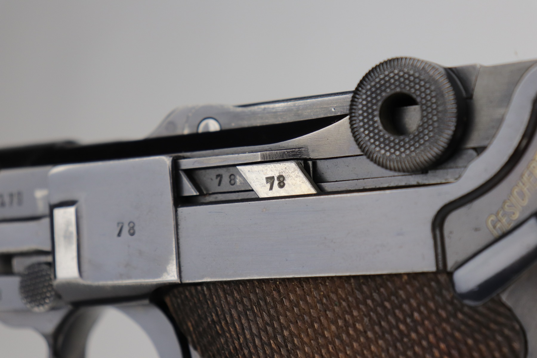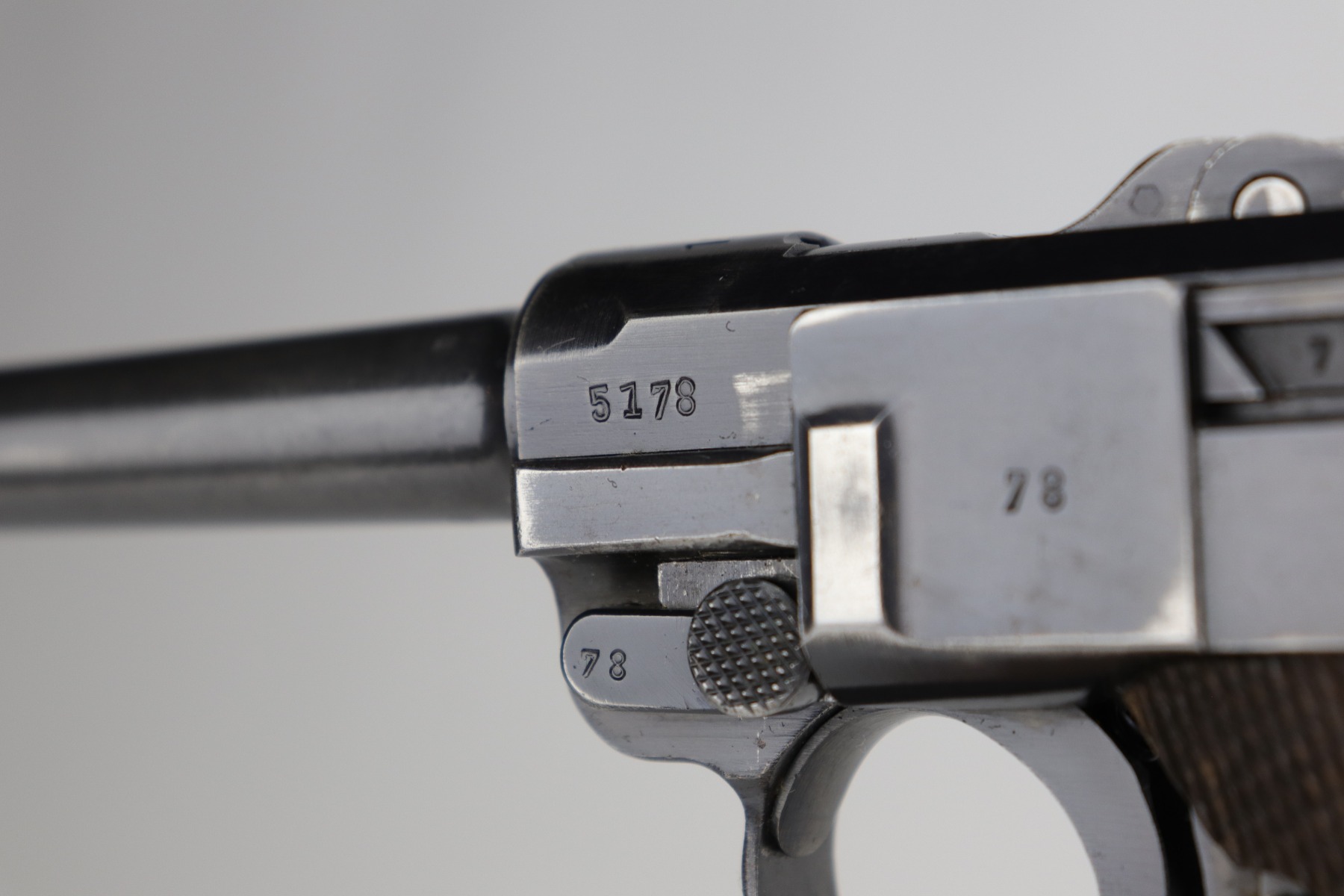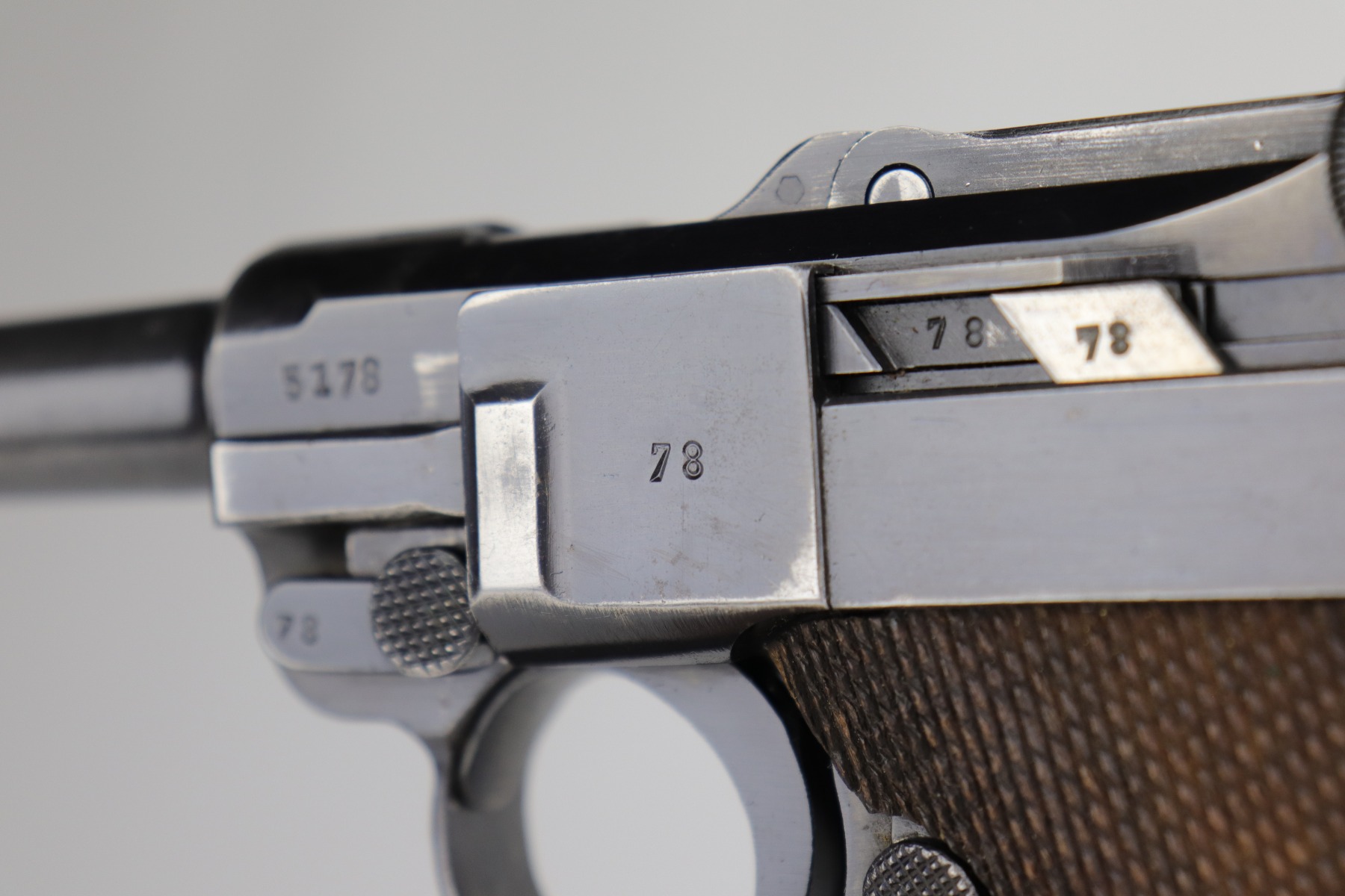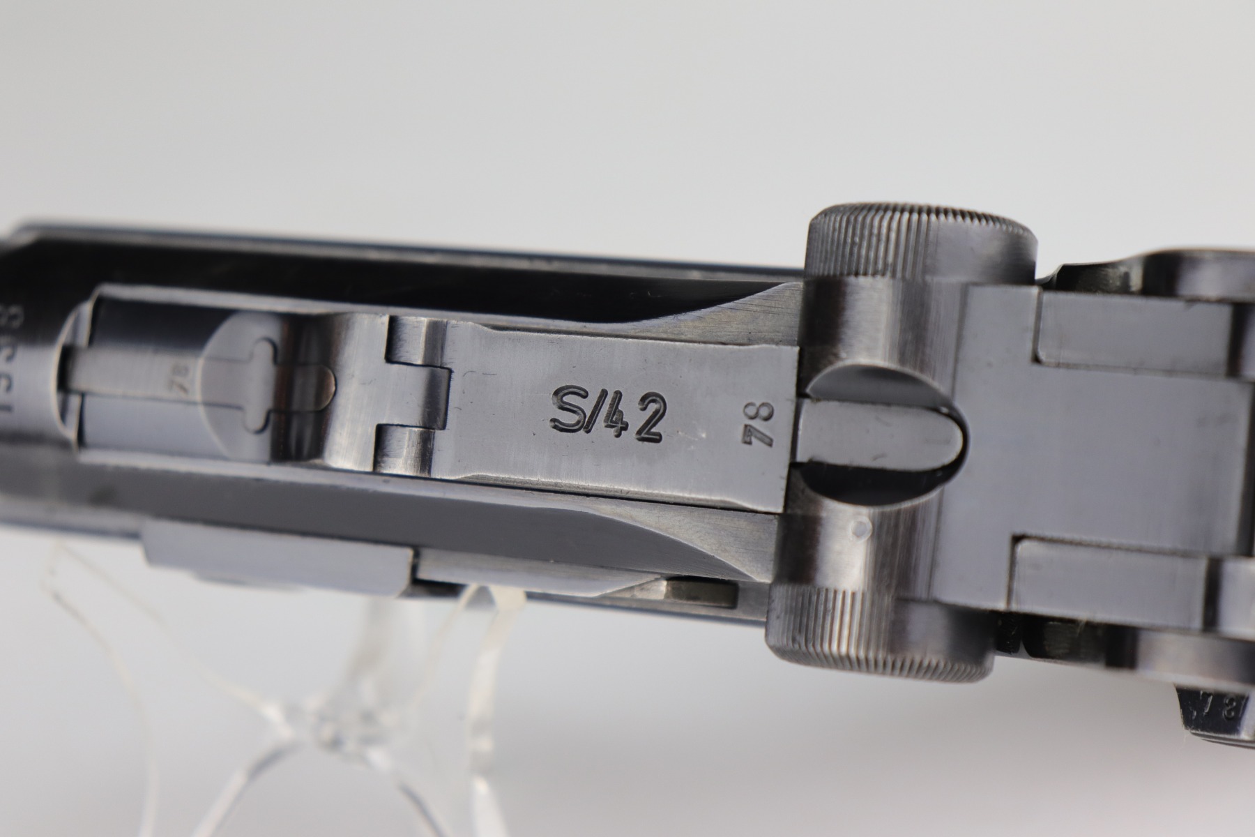 12/23/21- This is a nice example of a Mauser Luger issued to the Nazi military in 1938. It is all matching and has the proper “Eagle 63” Nazi military acceptance proofs. It has retained roughly 75% of its original bluing. There is thinning on both straps and on the barrel and minor wear around the muzzle, on some of the high edges of the slide and frame, and on the side plate. A few areas of very minor oxidation. Excellent grips – one is matching and the other is un-numbered. It comes with a mismatched period-correct magazine. The bore has decent rifling, but there is pitting throughout.