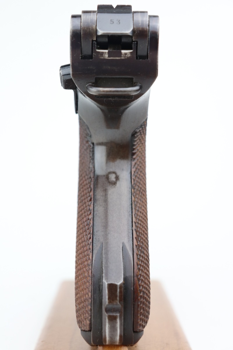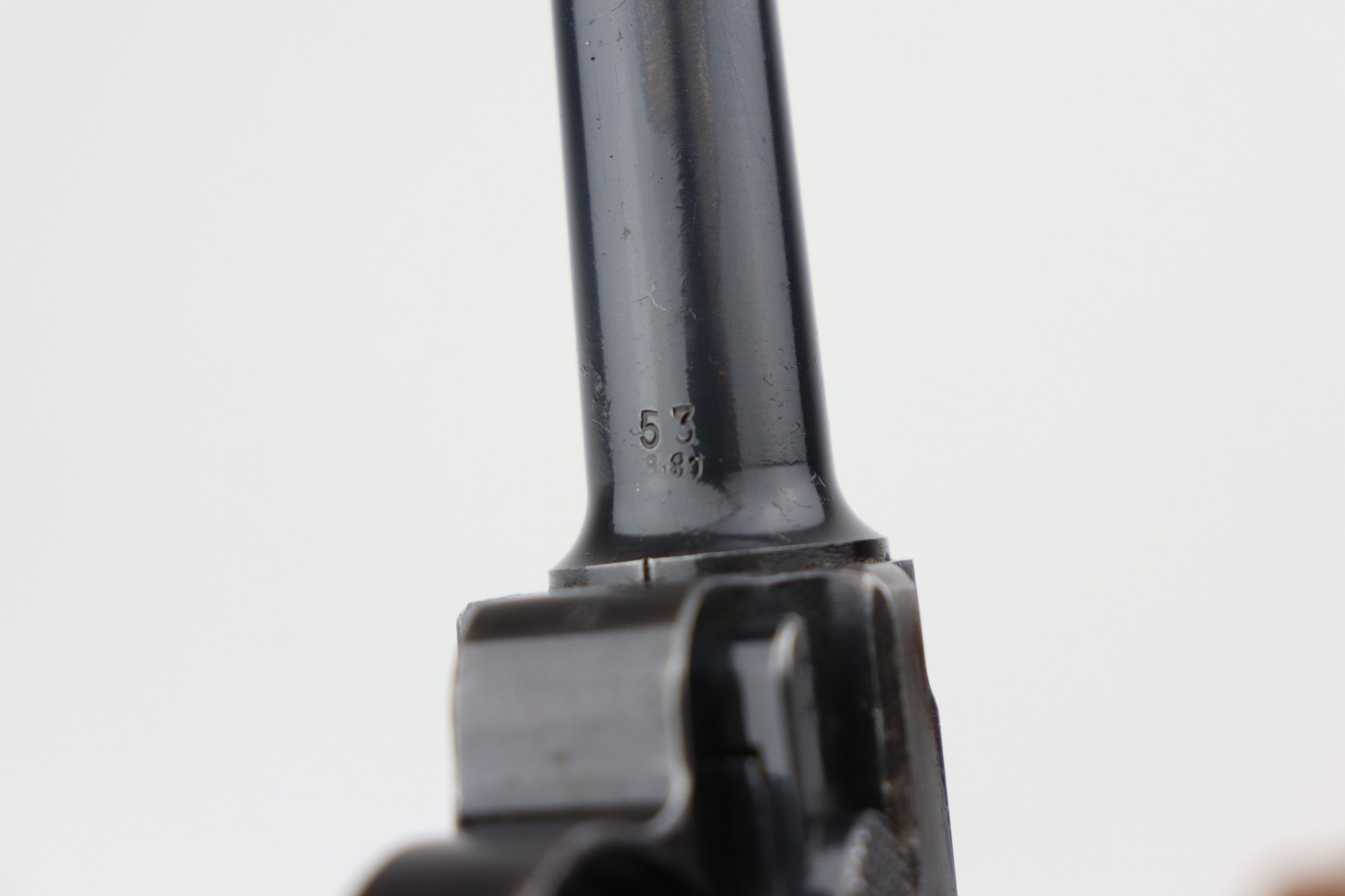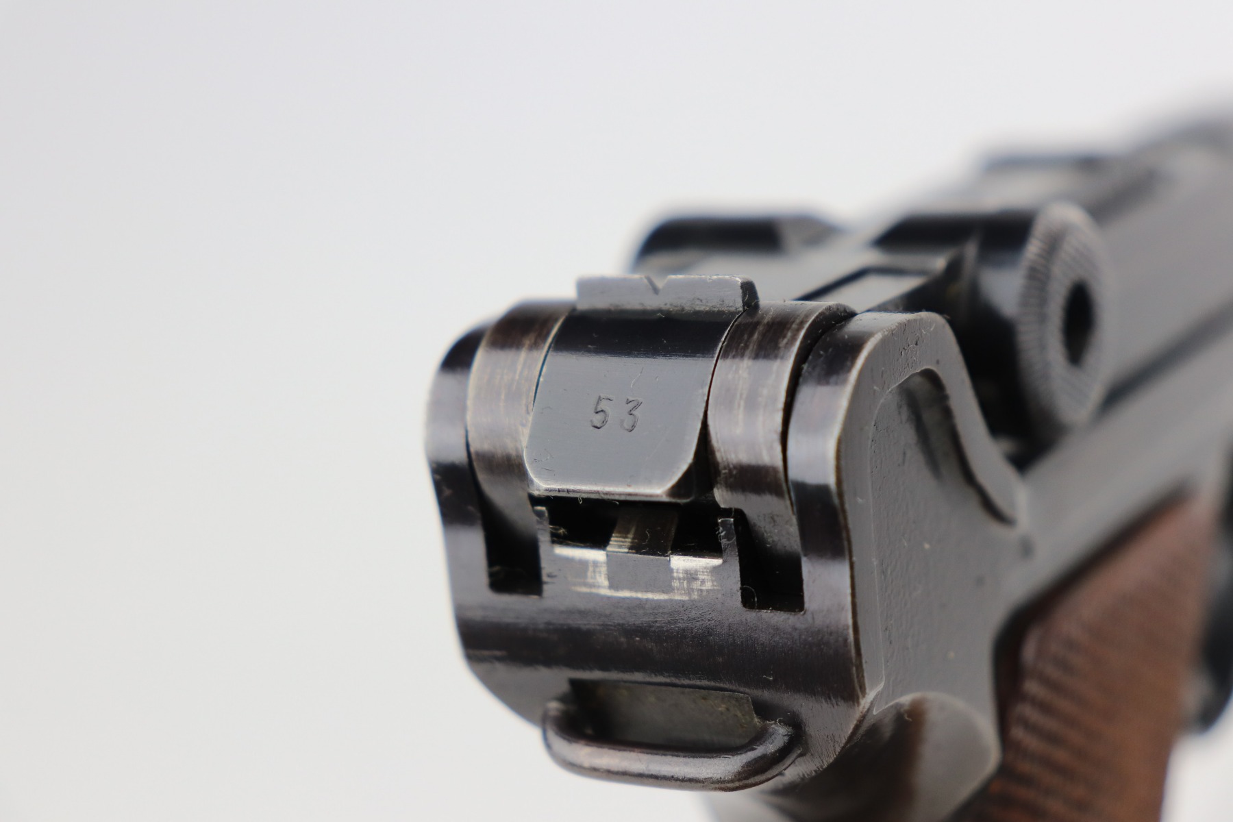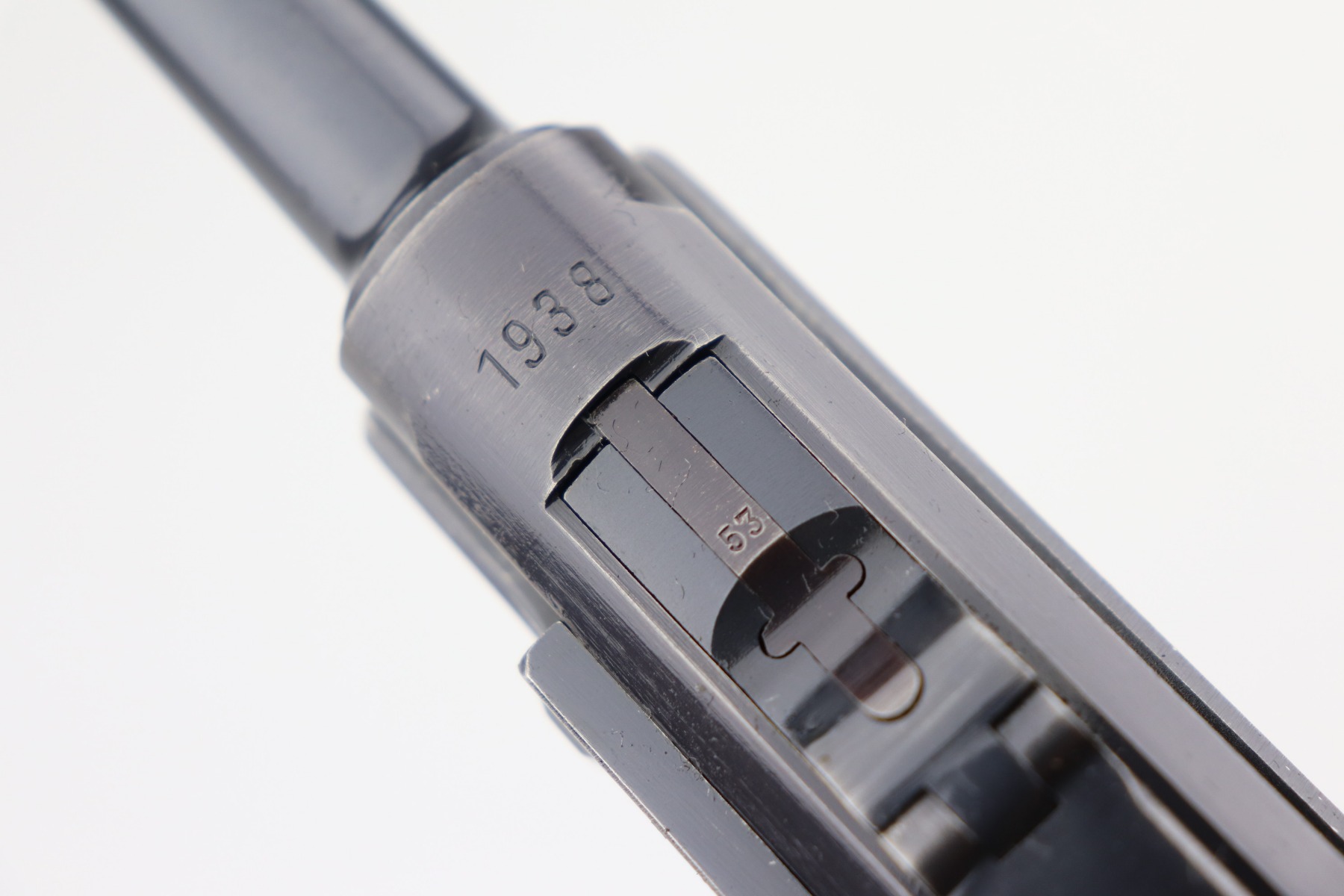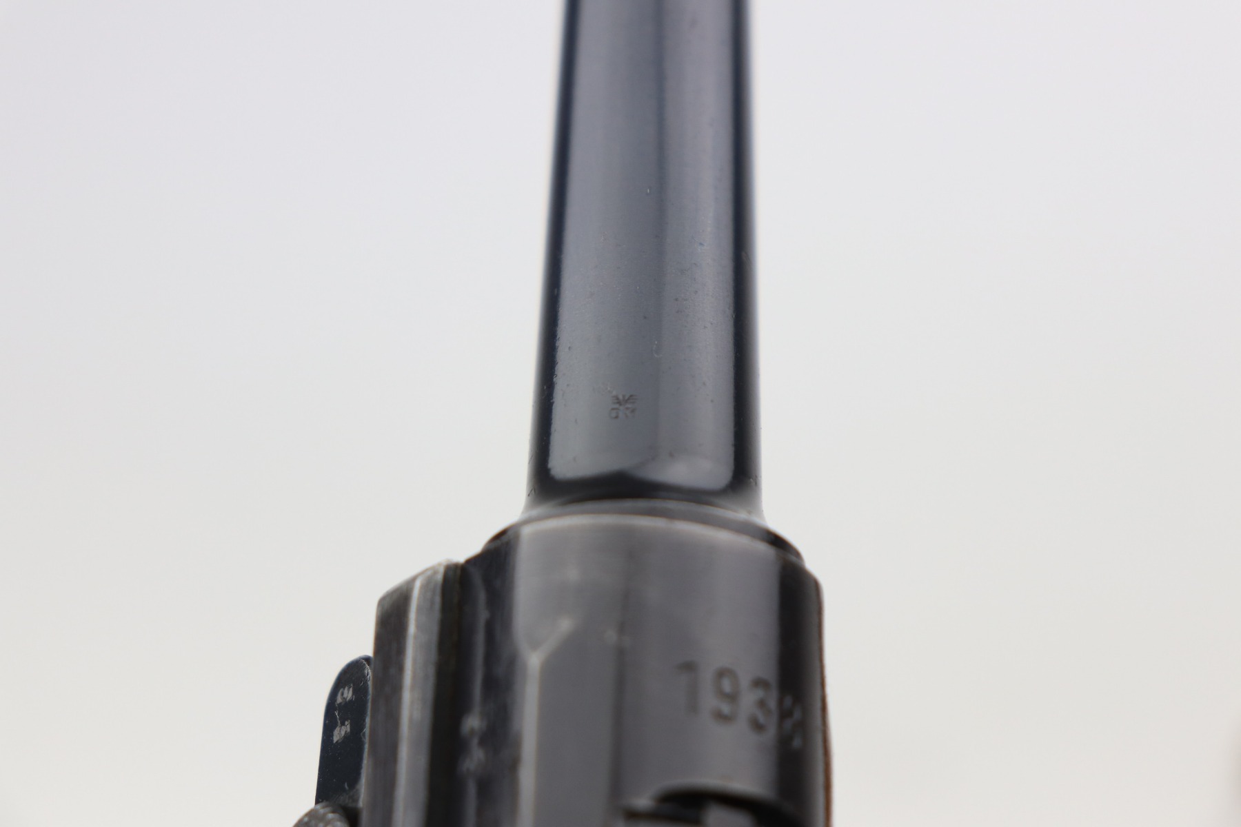 3/3/21 – This is a very nice example of a Mauser Luger issued to the Nazi military in 1938. It is all matching and has the proper “Eagle 63” military proofs. It has retained about 93% of its original bluing. There is minor wear around the muzzle, side plate, and front edges of the frame. Very minor thinning and brown patina on the straps. Excellent un-numbered grips – small chip in the bottom corner of the right panel. Comes with a mismatched period-correct magazine. The bore is excellent – shiny with strong rifling and minor freckling toward the muzzle end.
