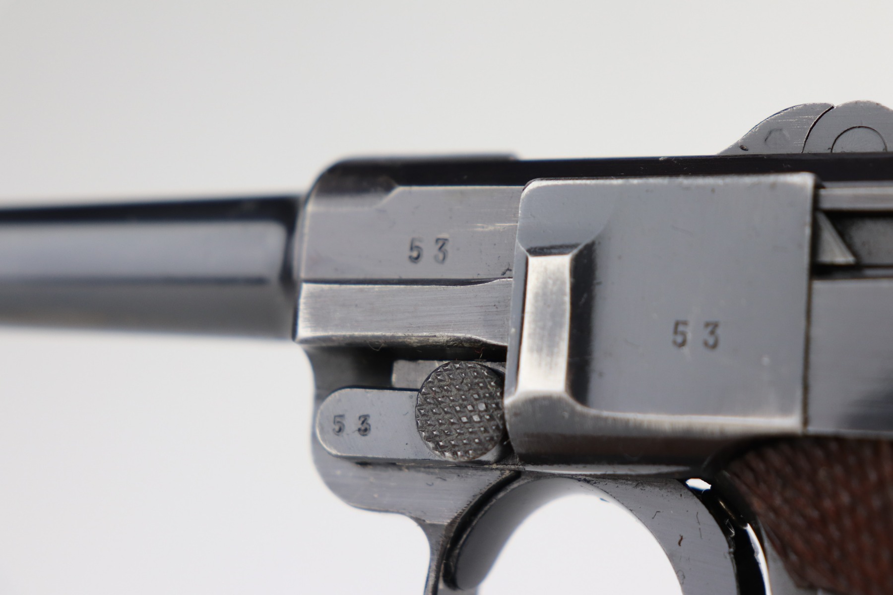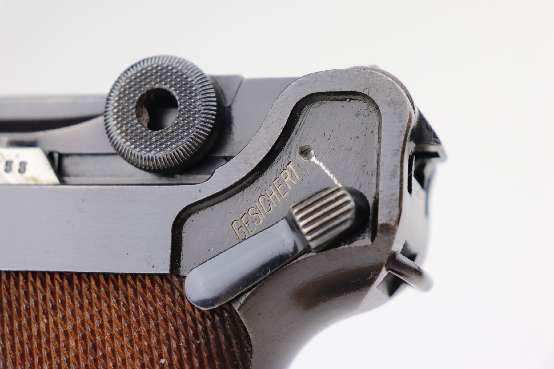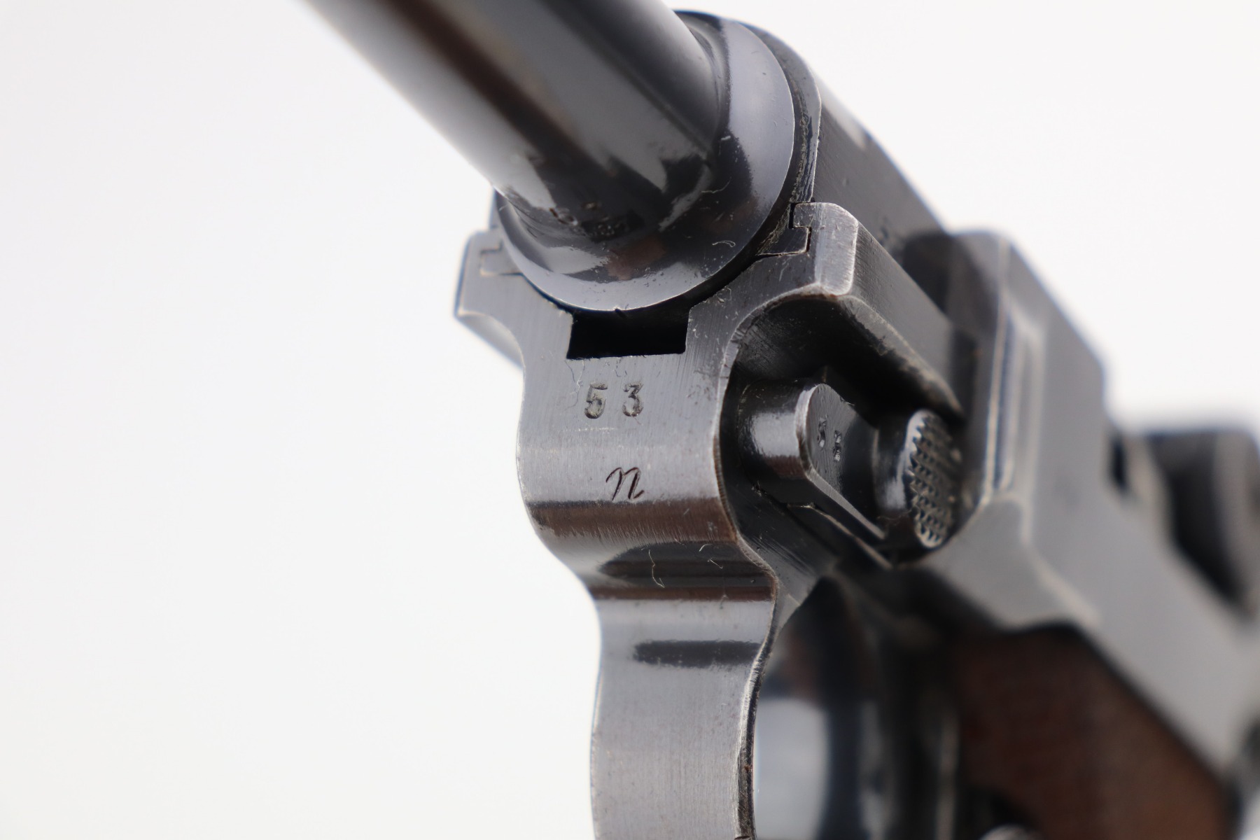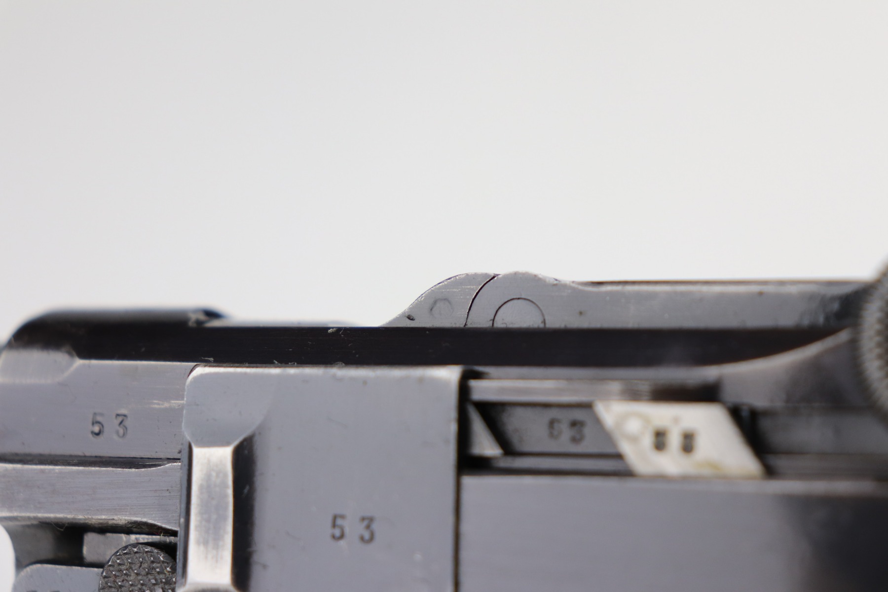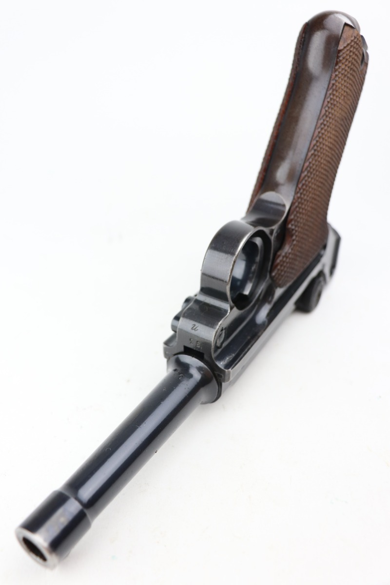3/3/21 – This is a very nice example of a Mauser Luger issued to the Nazi military in 1938. It is all matching and has the proper “Eagle 63” military proofs. It has retained about 93% of its original bluing. There is minor wear around the muzzle, side plate, and front edges of the frame. Very minor thinning and brown patina on the straps. Excellent un-numbered grips – small chip in the bottom corner of the right panel. Comes with a mismatched period-correct magazine. The bore is excellent – shiny with strong rifling and minor freckling toward the muzzle end.