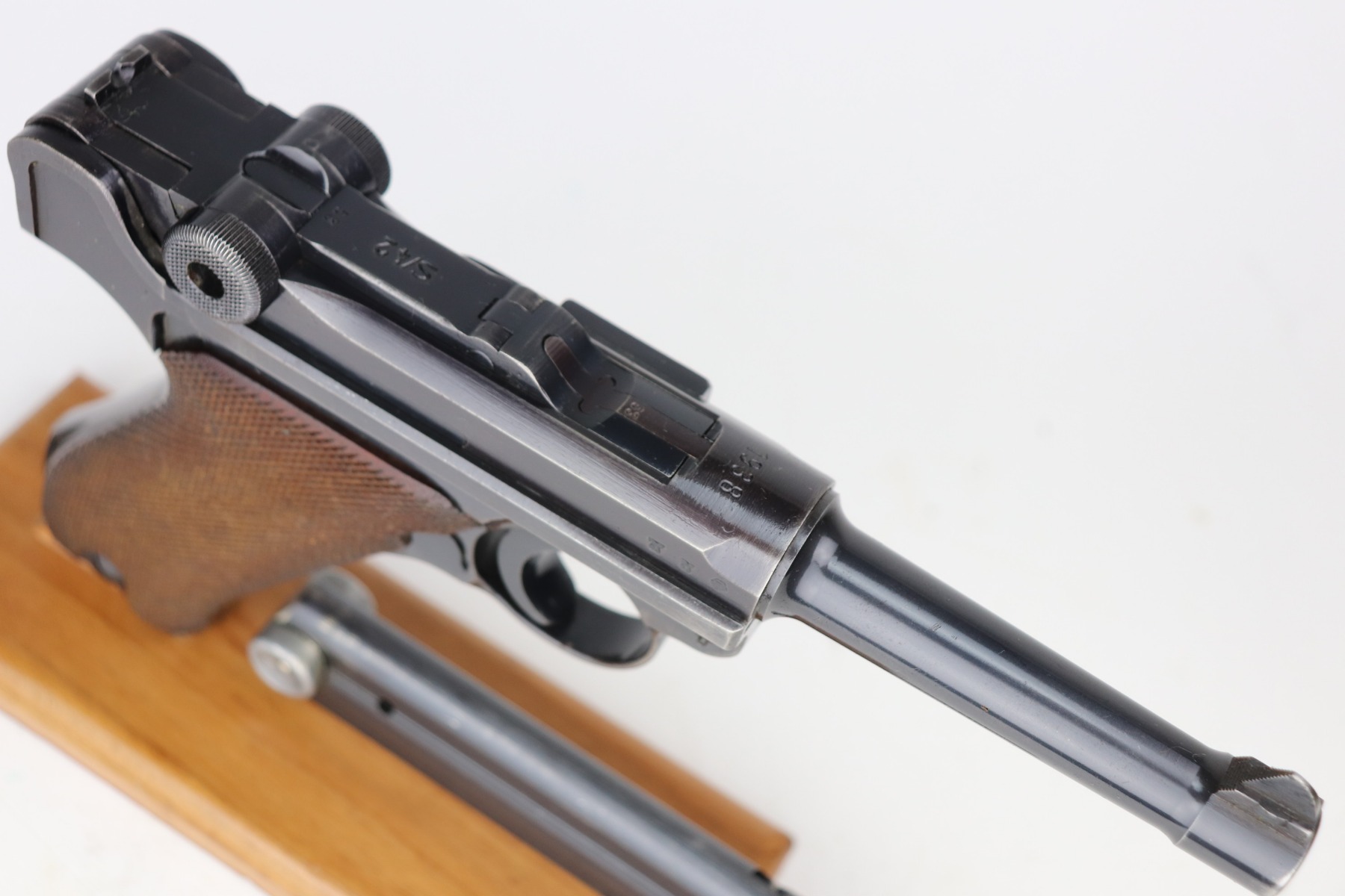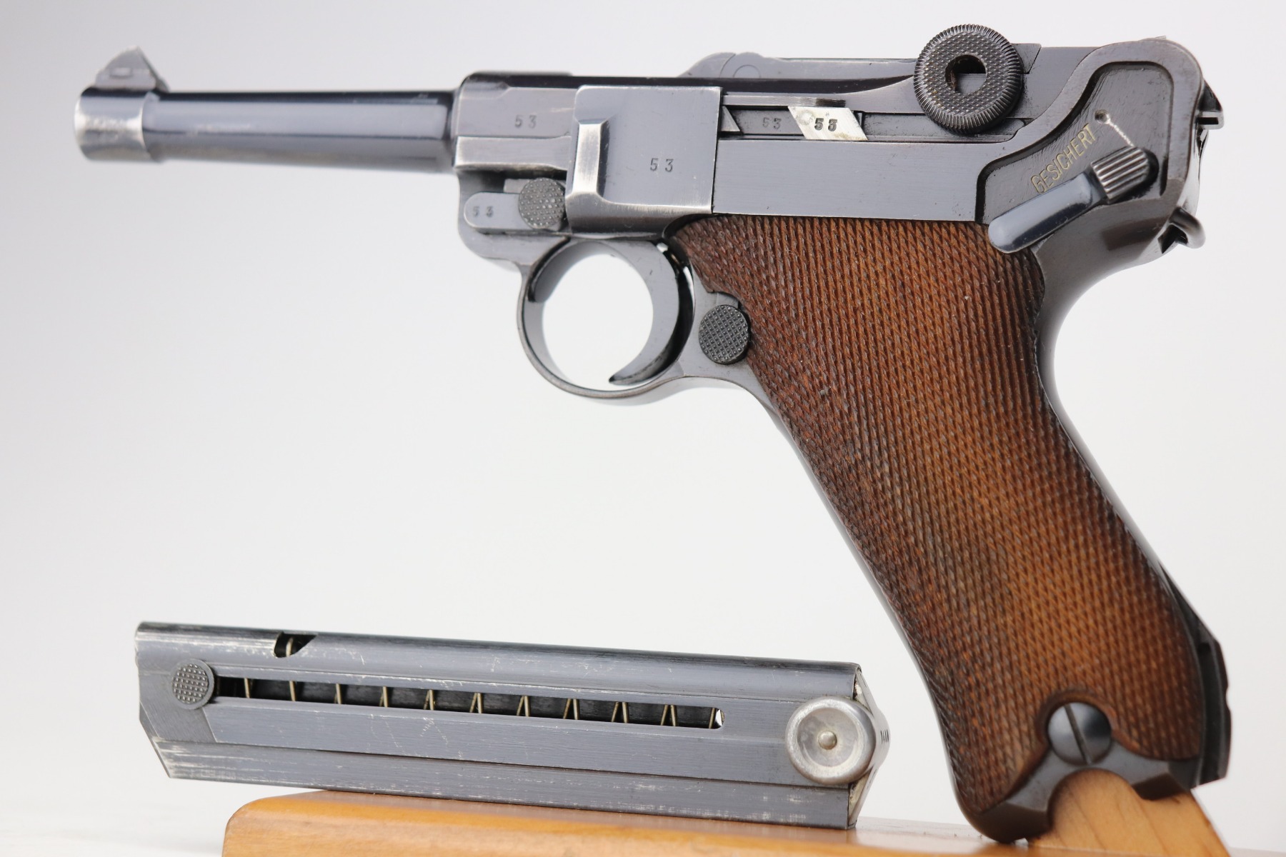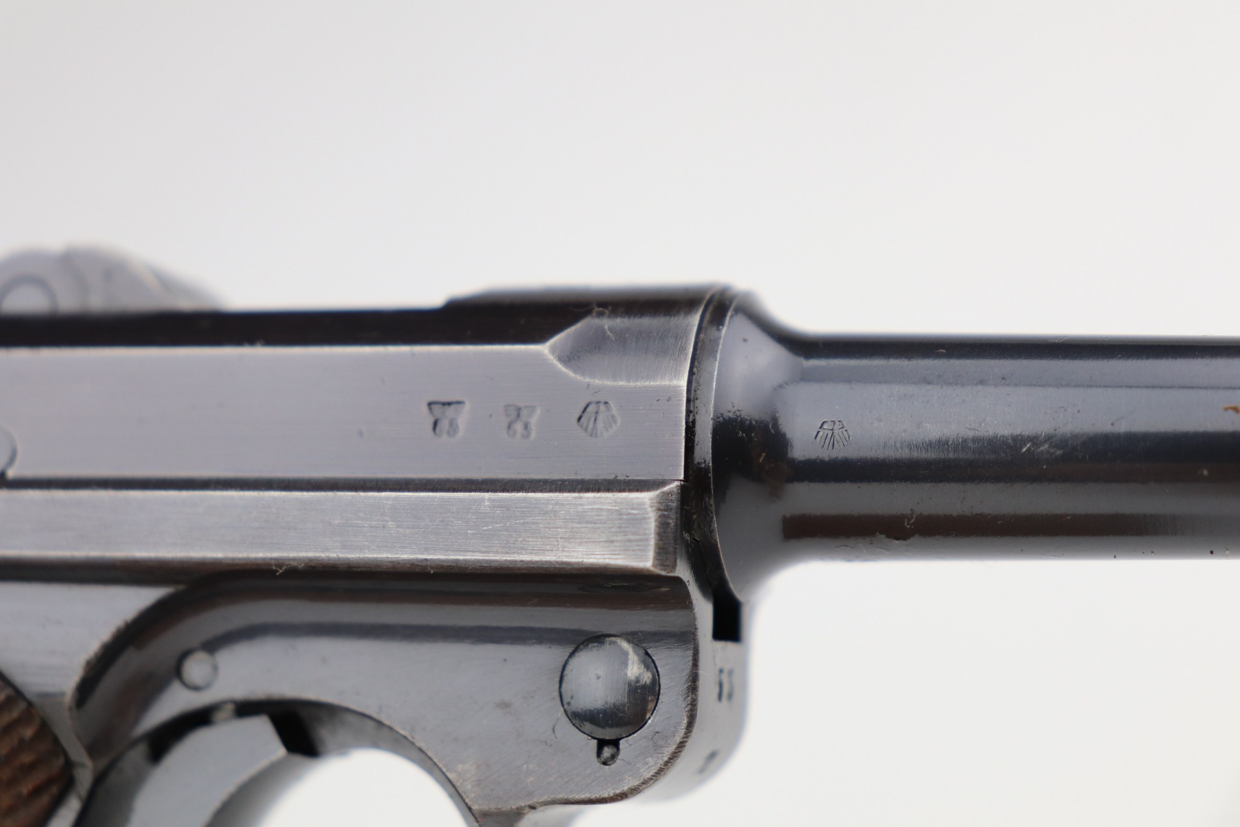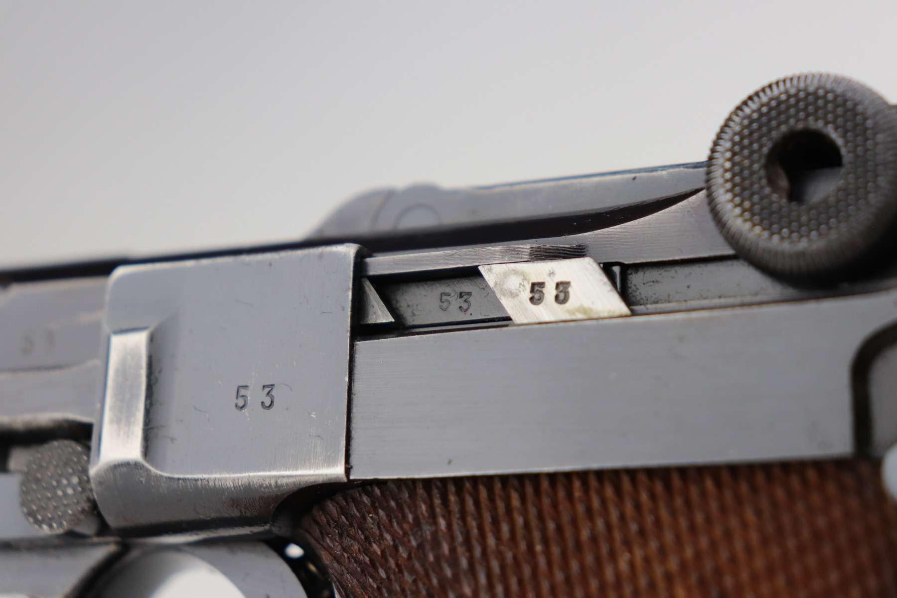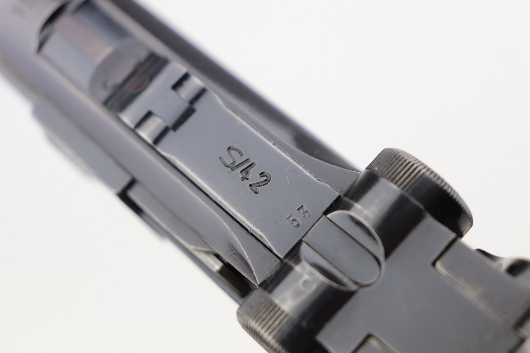 3/3/21 – This is a very nice example of a Mauser Luger issued to the Nazi military in 1938. It is all matching and has the proper “Eagle 63” military proofs. It has retained about 93% of its original bluing. There is minor wear around the muzzle, side plate, and front edges of the frame. Very minor thinning and brown patina on the straps. Excellent un-numbered grips – small chip in the bottom corner of the right panel. Comes with a mismatched period-correct magazine. The bore is excellent – shiny with strong rifling and minor freckling toward the muzzle end.