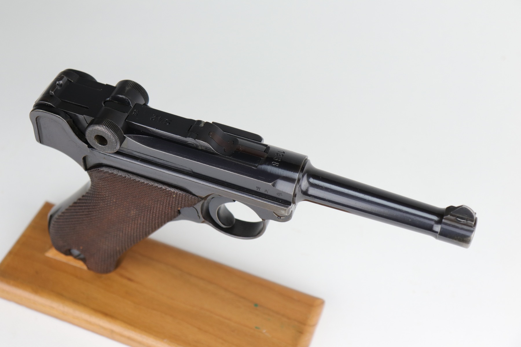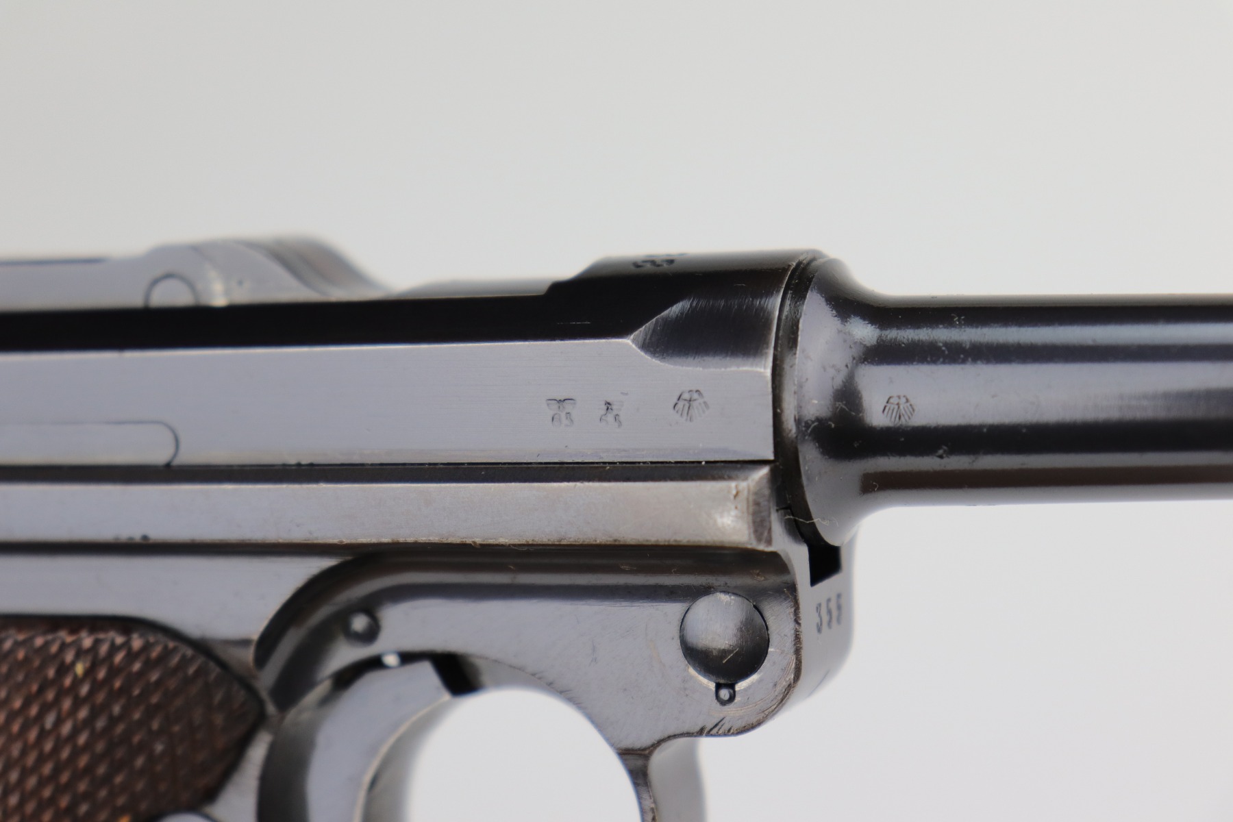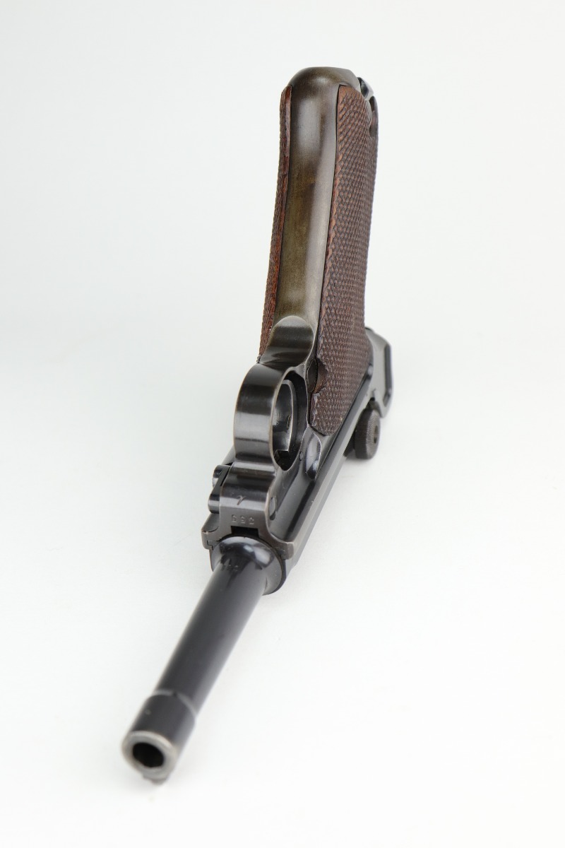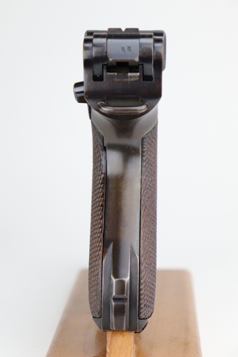 12/2/20 – This is a very nice example of a Mauser P.08 issued to the Nazi military in 1938. It is all matching and has the proper “Eagle 63” Nazi military proofs. It also comes with one original matching magazine. The nature of the finish loss on the straps makes the bluing difficult to rate, but we estimate it has retained about 90%. There is thinning and patina on both straps and minor wear around the muzzle, high edges of the slide, and on the side plate. The bore is excellent – shiny with strong rifling. It comes with excellent period-correct grips.