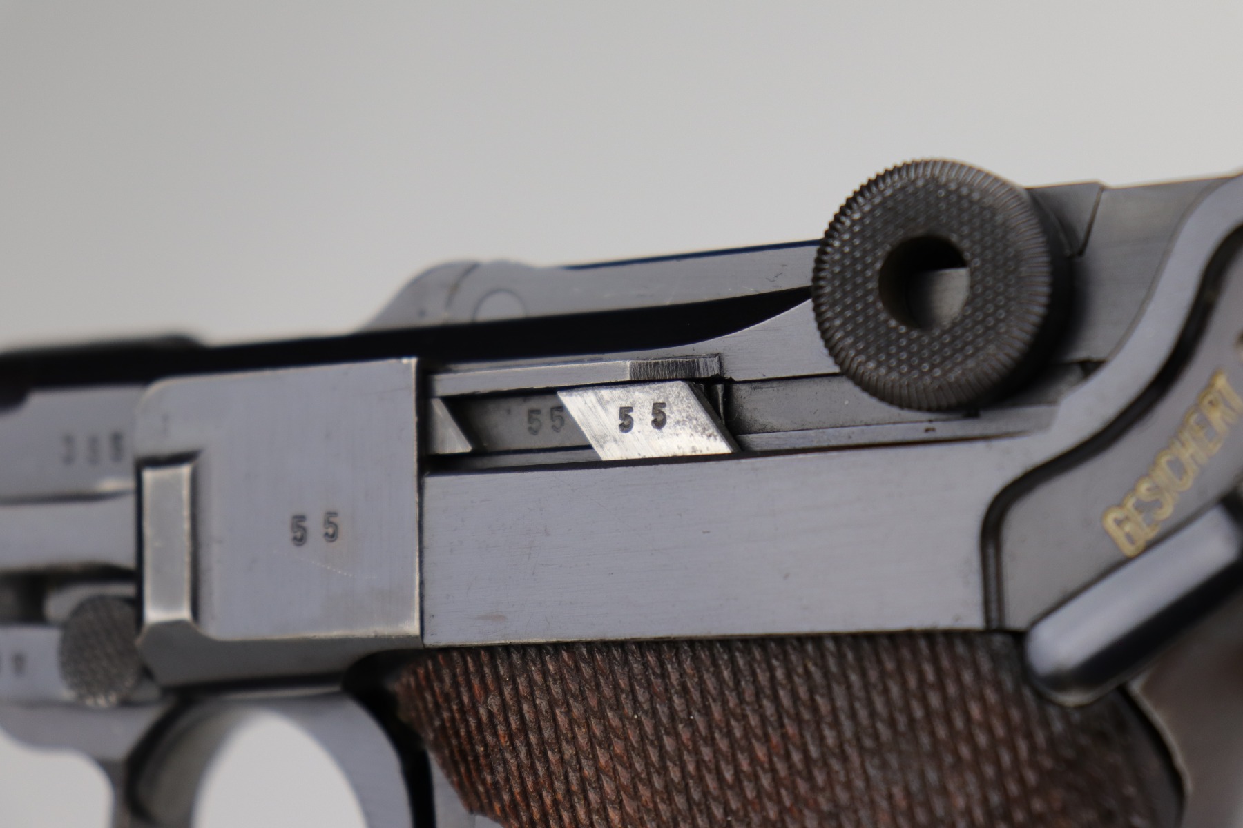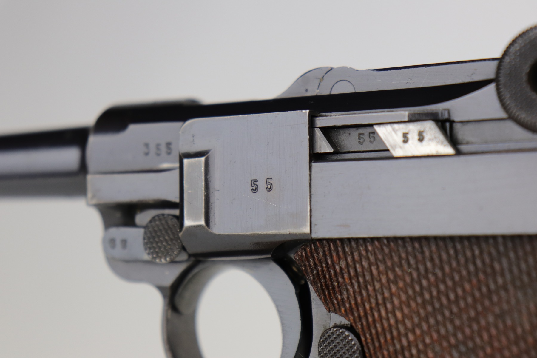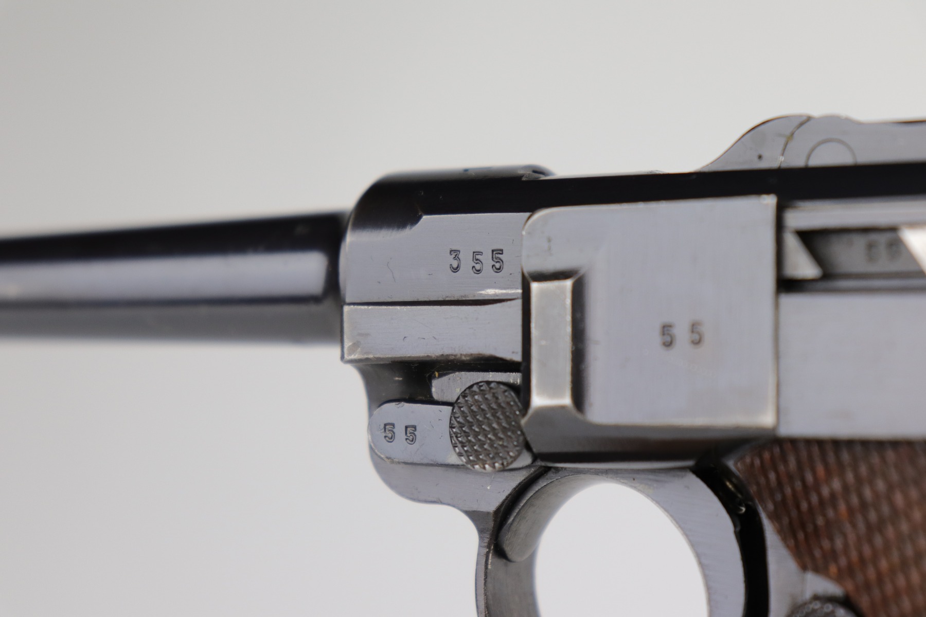 12/2/20 – This is a very nice example of a Mauser P.08 issued to the Nazi military in 1938. It is all matching and has the proper “Eagle 63” Nazi military proofs. It also comes with one original matching magazine. The nature of the finish loss on the straps makes the bluing difficult to rate, but we estimate it has retained about 90%. There is thinning and patina on both straps and minor wear around the muzzle, high edges of the slide, and on the side plate. The bore is excellent – shiny with strong rifling. It comes with excellent period-correct grips.
