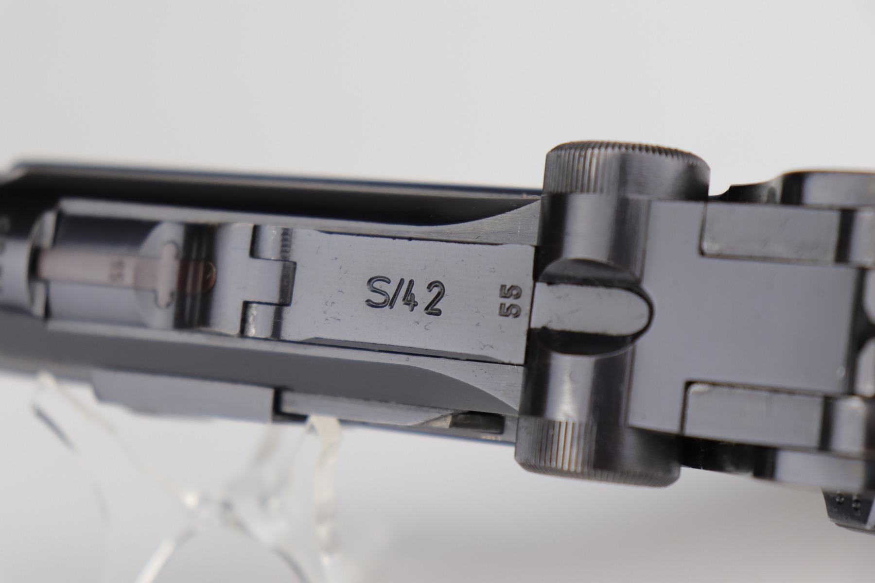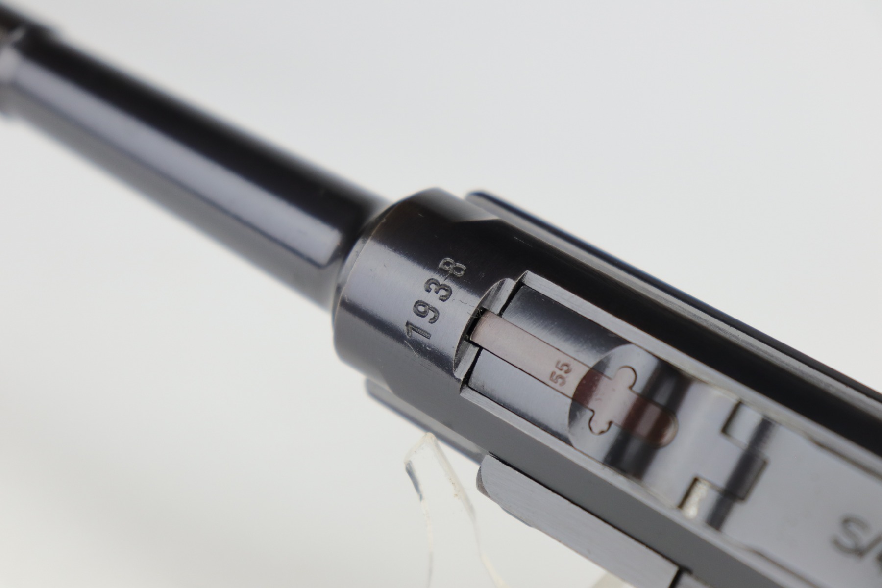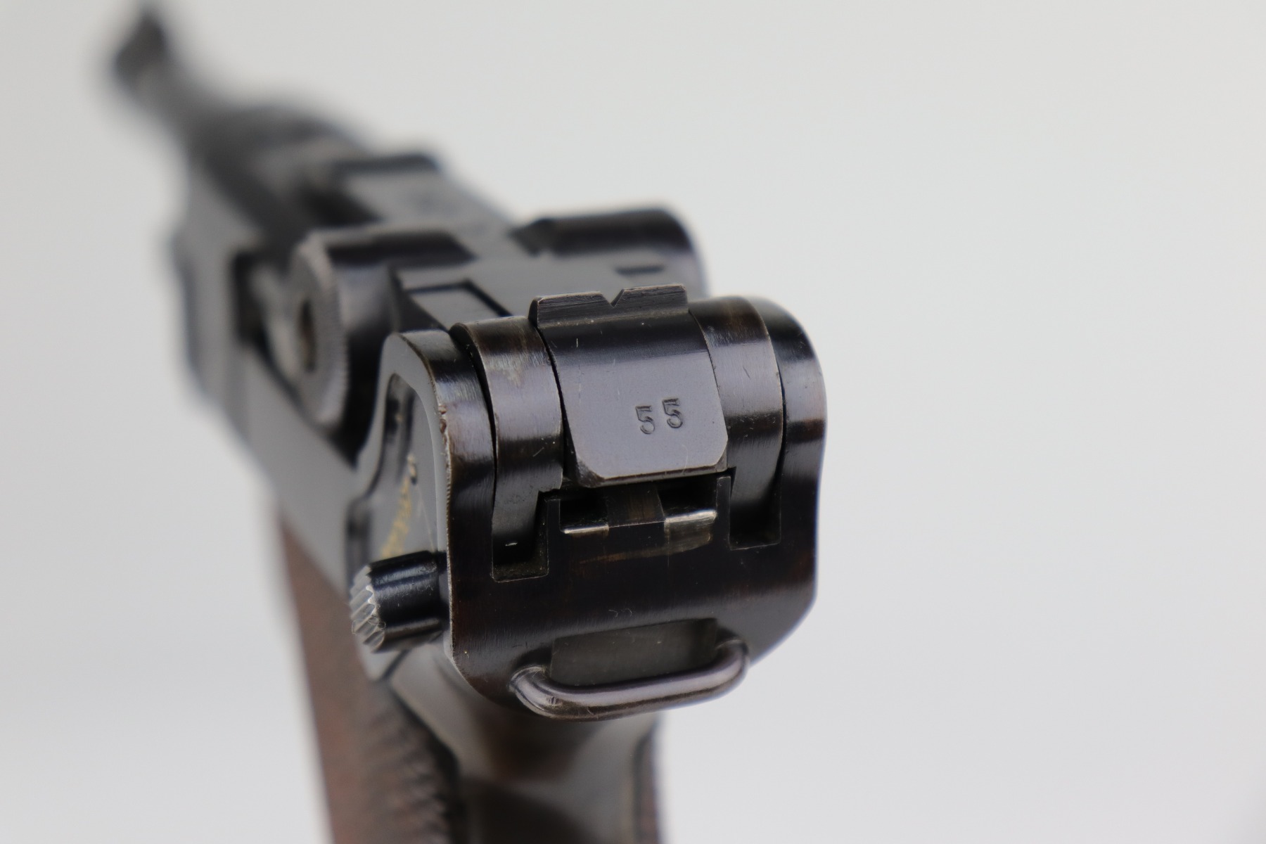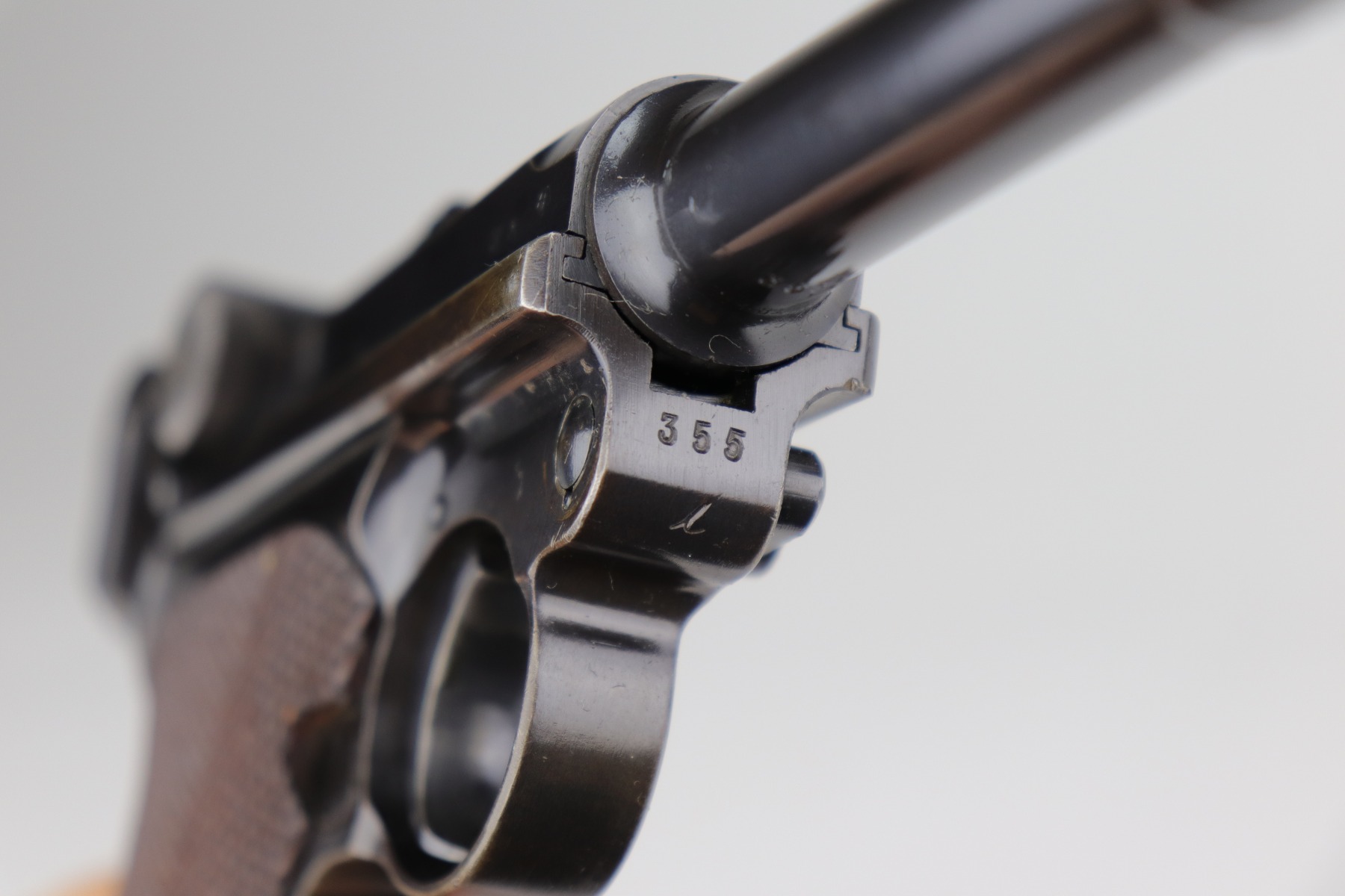 12/2/20 – This is a very nice example of a Mauser P.08 issued to the Nazi military in 1938. It is all matching and has the proper “Eagle 63” Nazi military proofs. It also comes with one original matching magazine. The nature of the finish loss on the straps makes the bluing difficult to rate, but we estimate it has retained about 90%. There is thinning and patina on both straps and minor wear around the muzzle, high edges of the slide, and on the side plate. The bore is excellent – shiny with strong rifling. It comes with excellent period-correct grips.