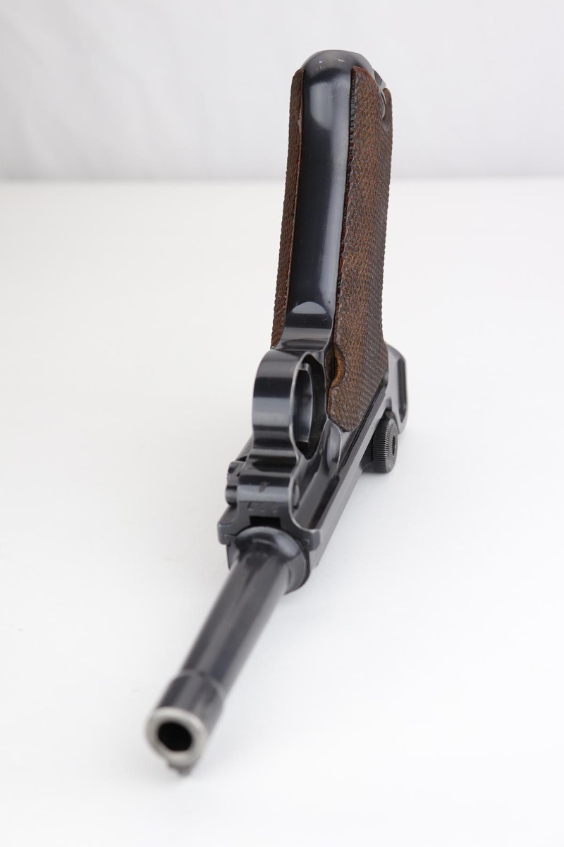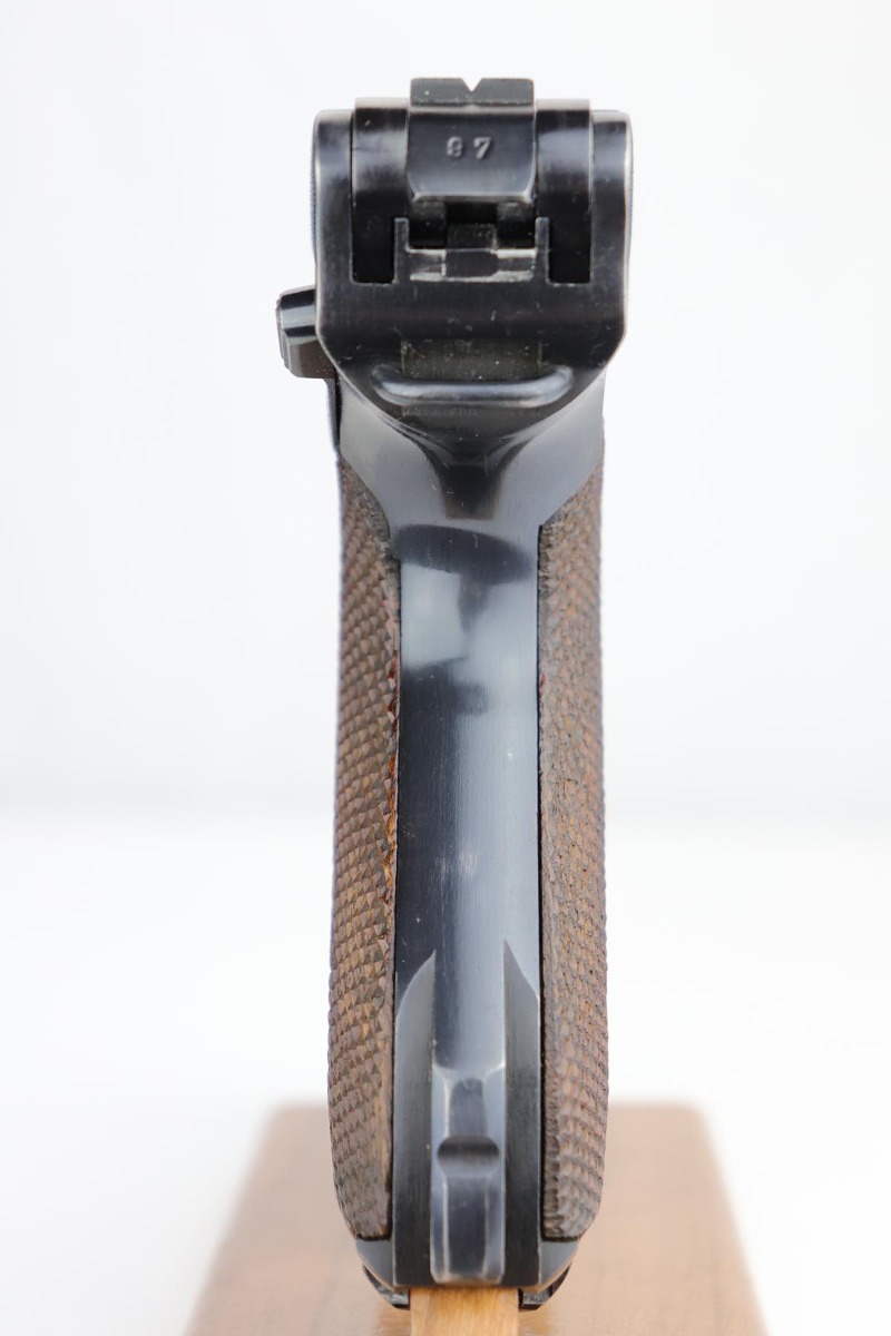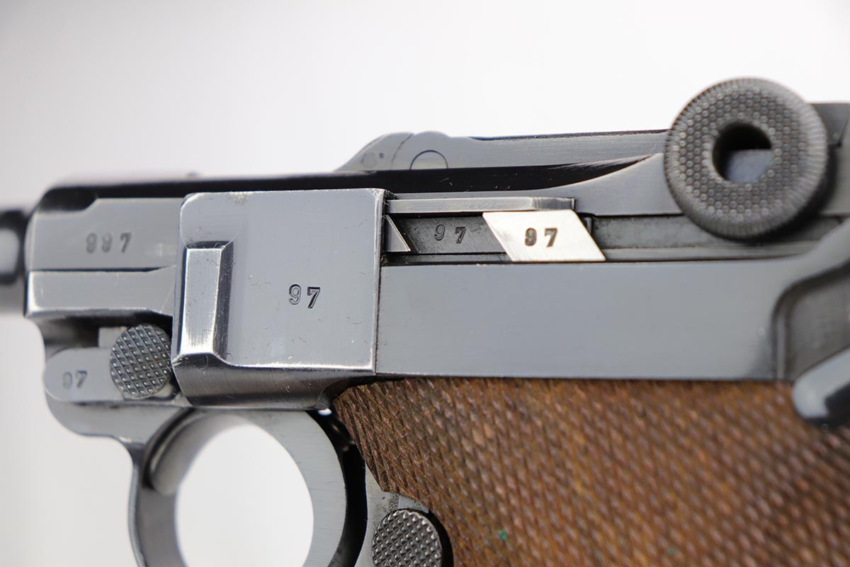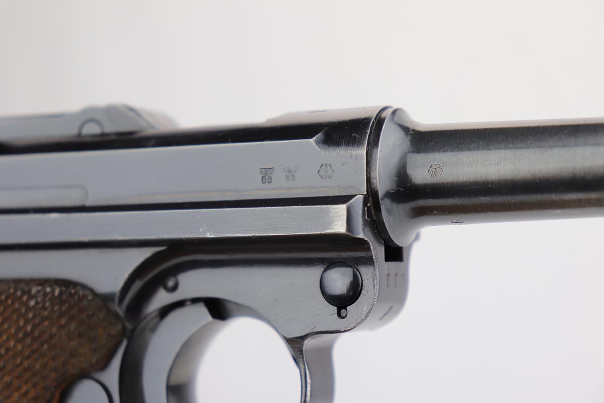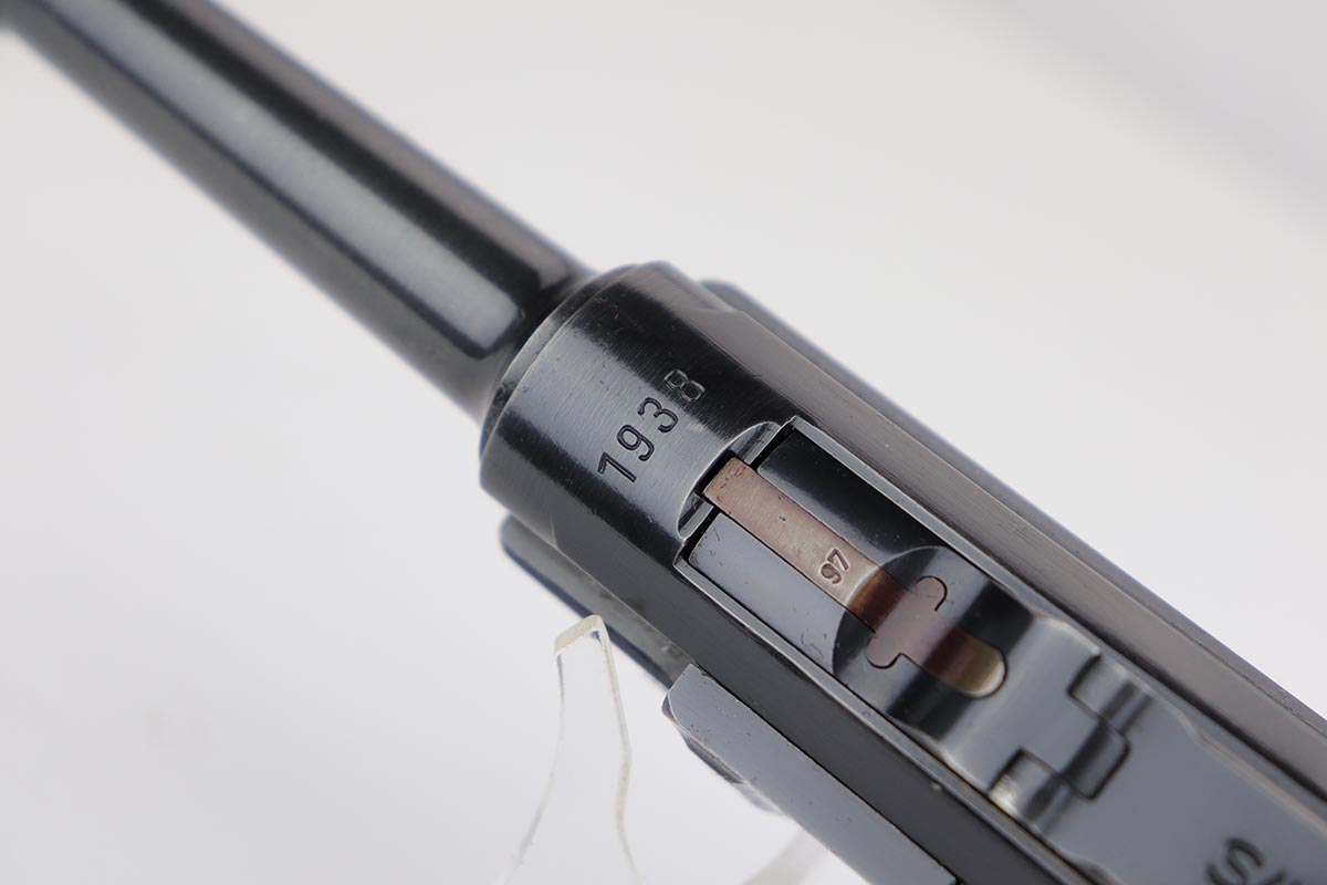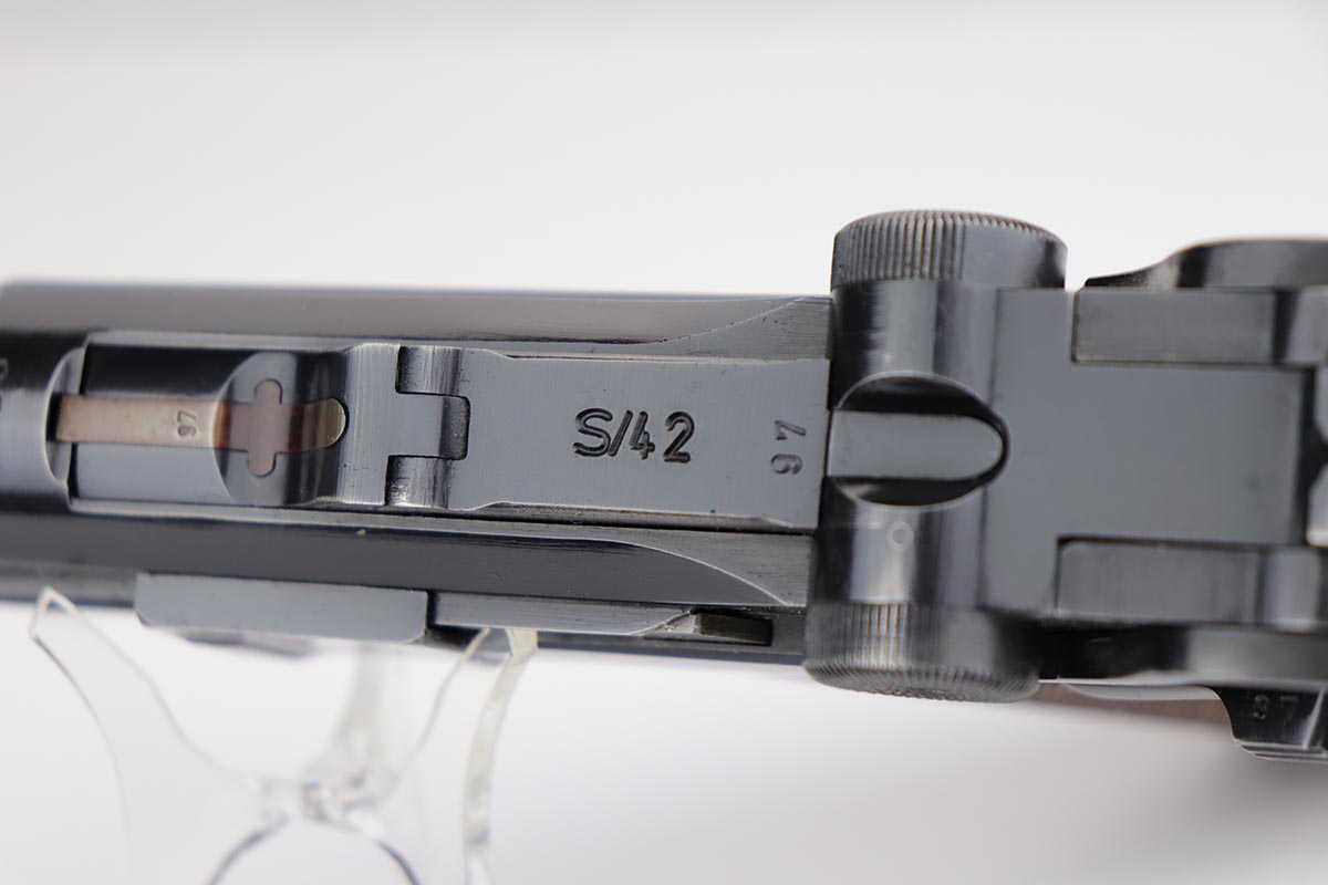 10/21/19 – This is an excellent example of a WW2 Nazi Mauser Luger, chambered for 9mm. The top of the chamber is dated 1938 and it is marked with the “S/42” factory code. The right side of the slide is properly “Eagle 63” waffenamt. Overall, this gun is in excellent condition. We’d rate the finish about 96-97%. There is some minor muzzle wear, minor thinning on the barrel, high-edge wear on the side plate. and very minor thinning on the back strap. All numbered parts are matching. The wooden grips are original and match the gun as well. No import marks. The gun comes with an original, period-correct, “Eagle 63” marked magazine that is not numbered to the gun. The bore is mint. The gun is fully functional. C&R eligible.