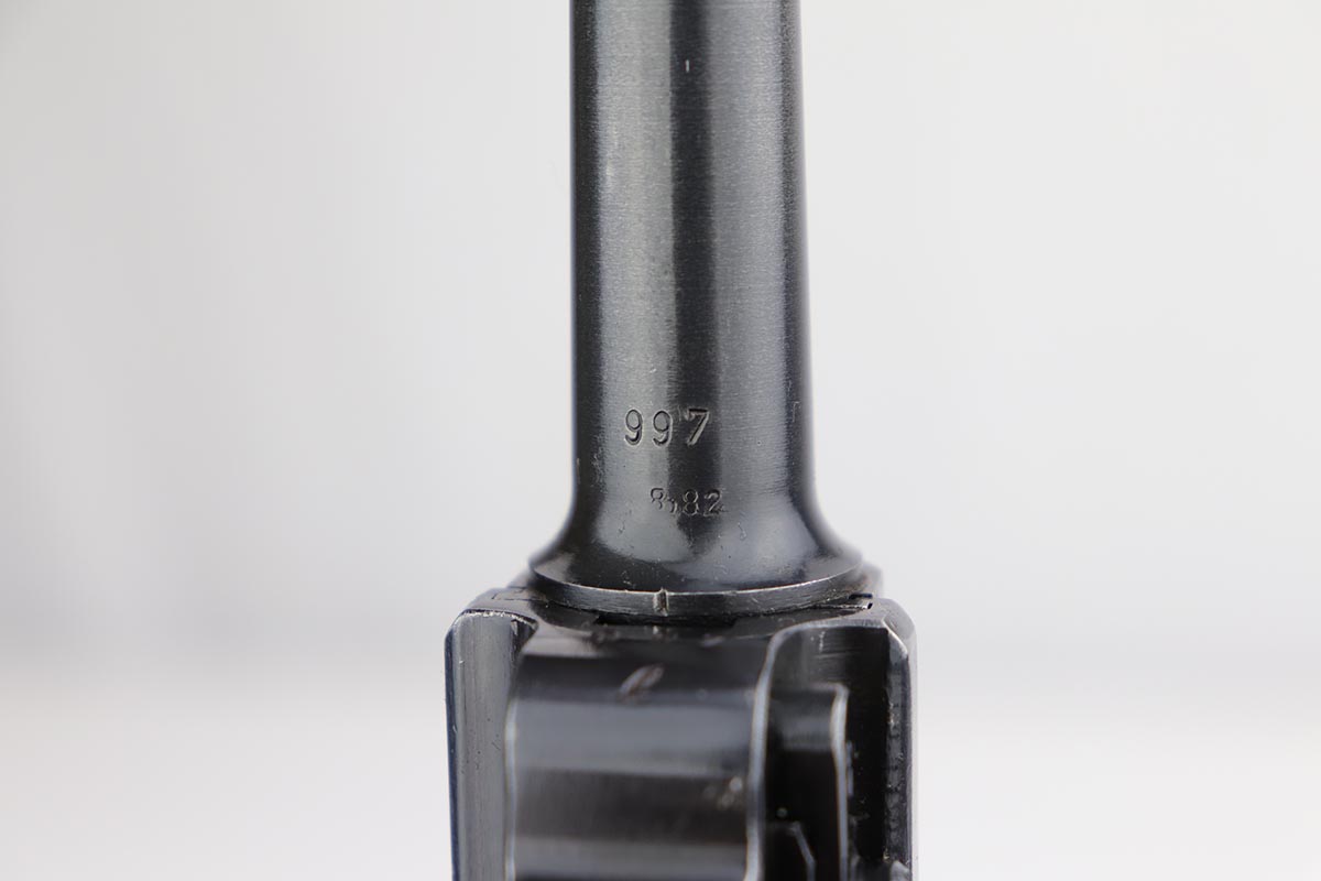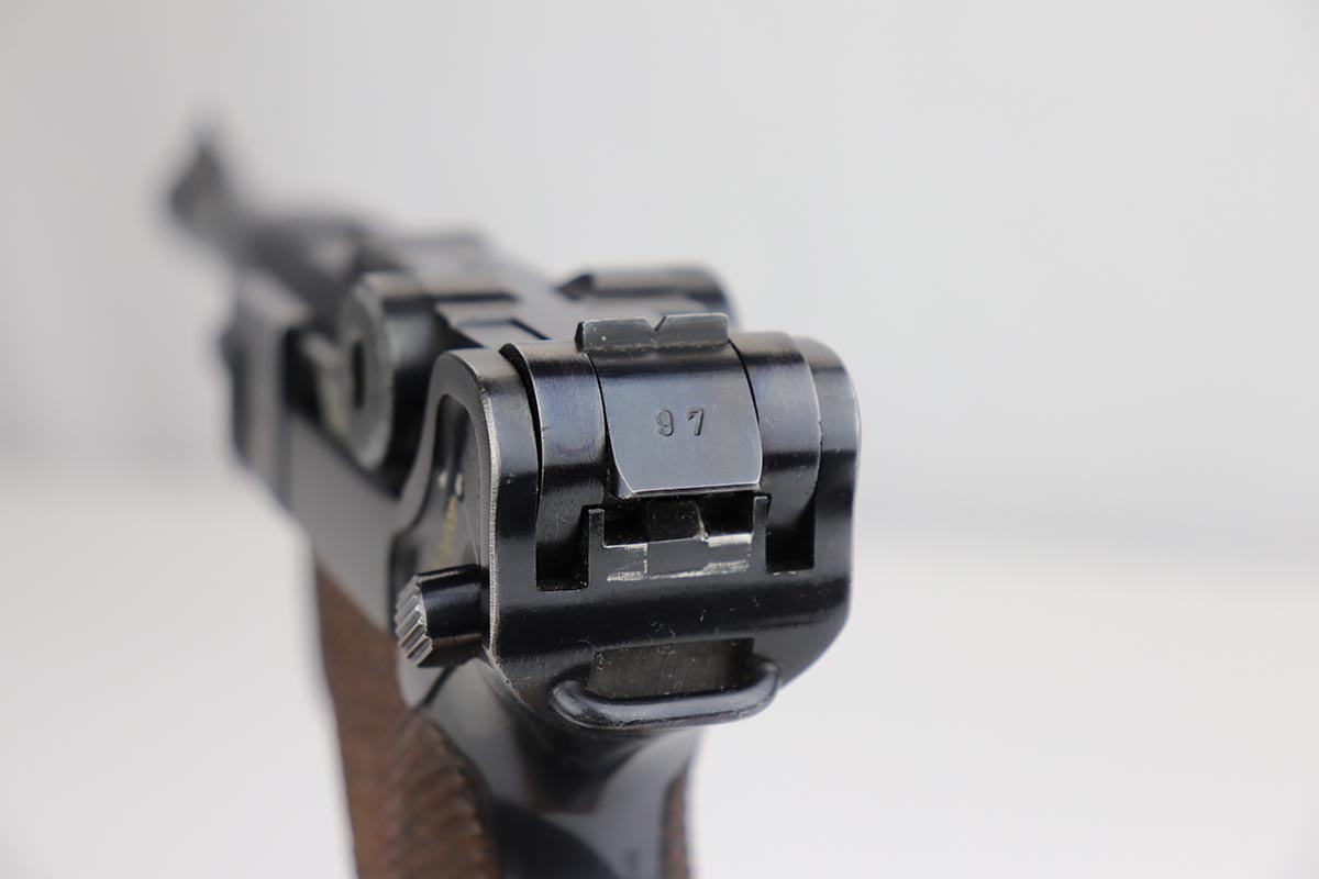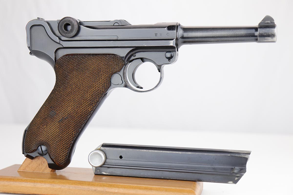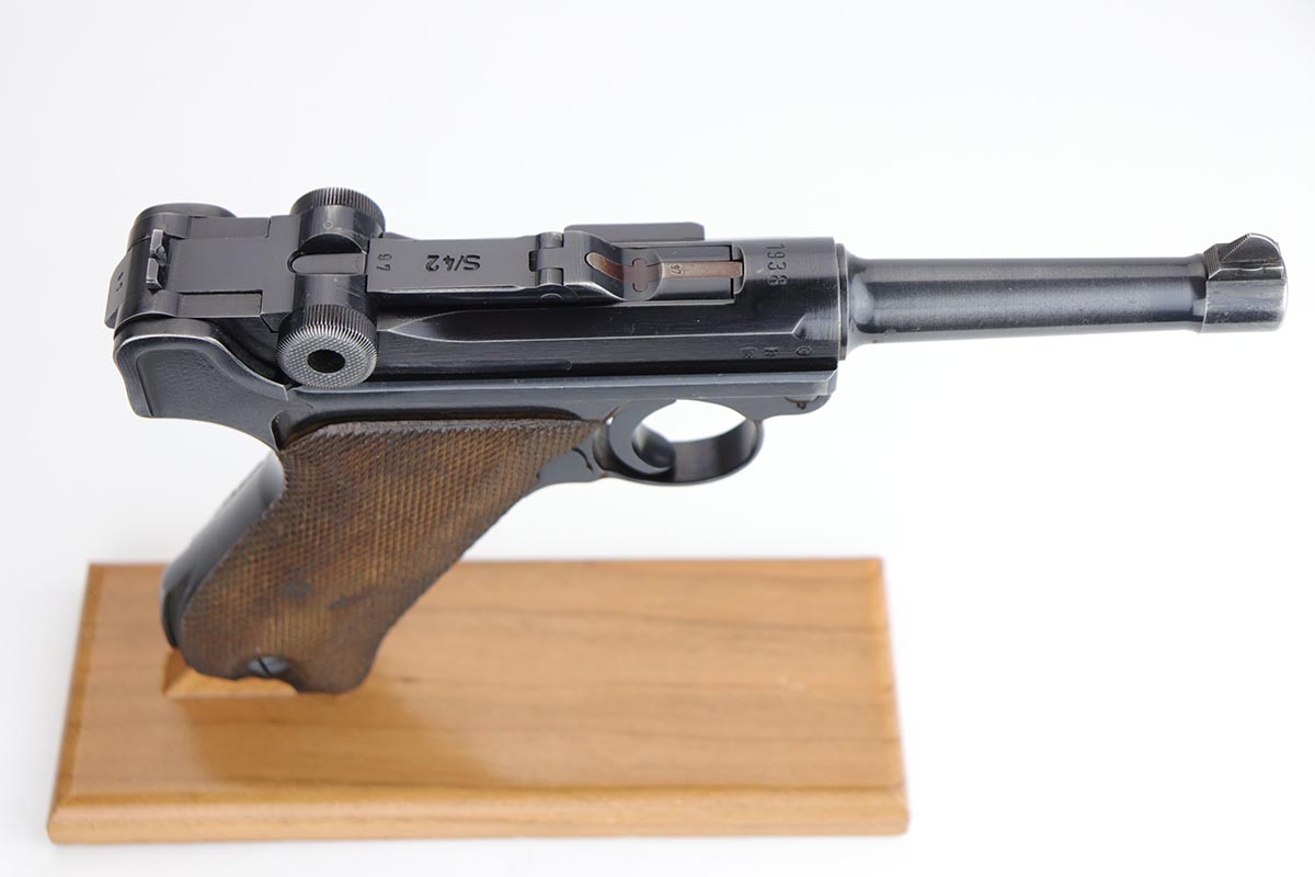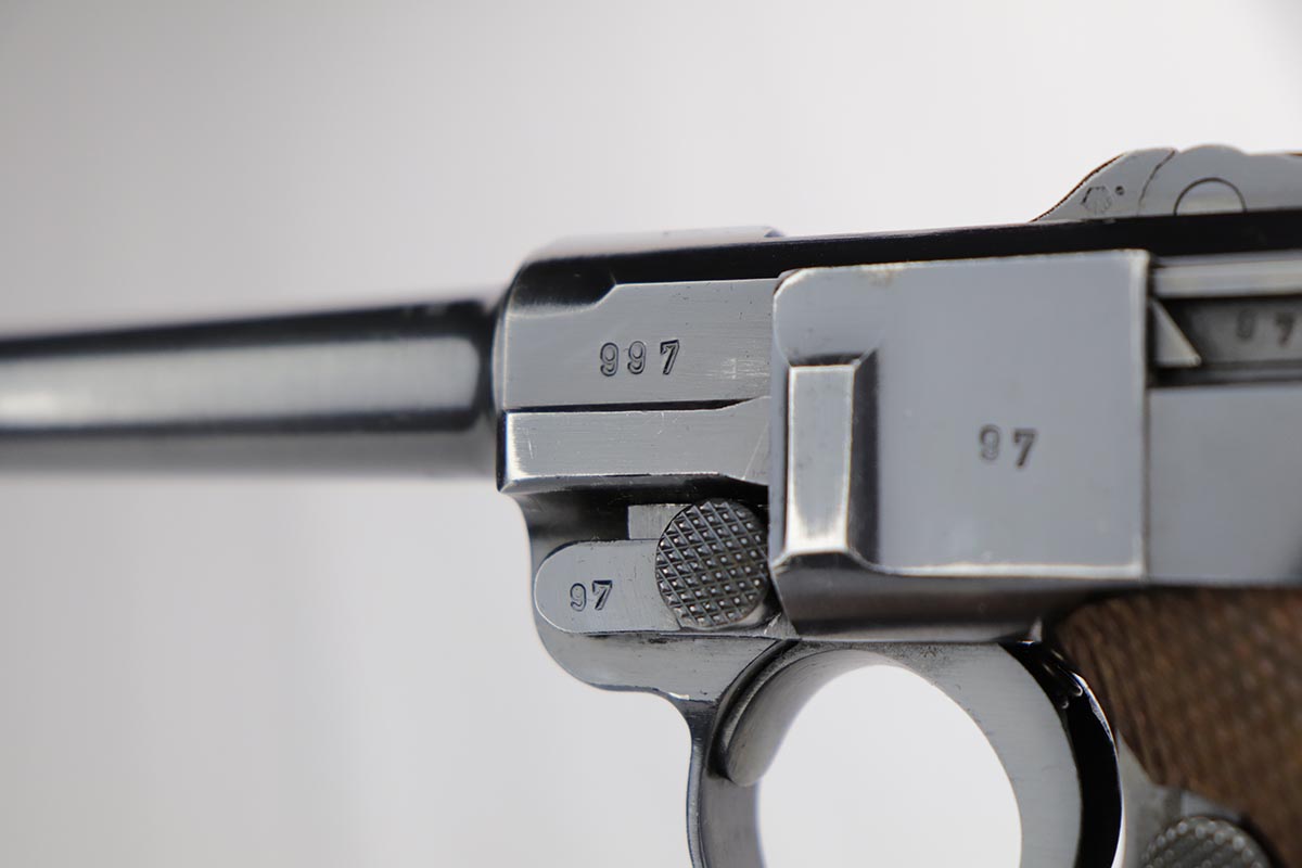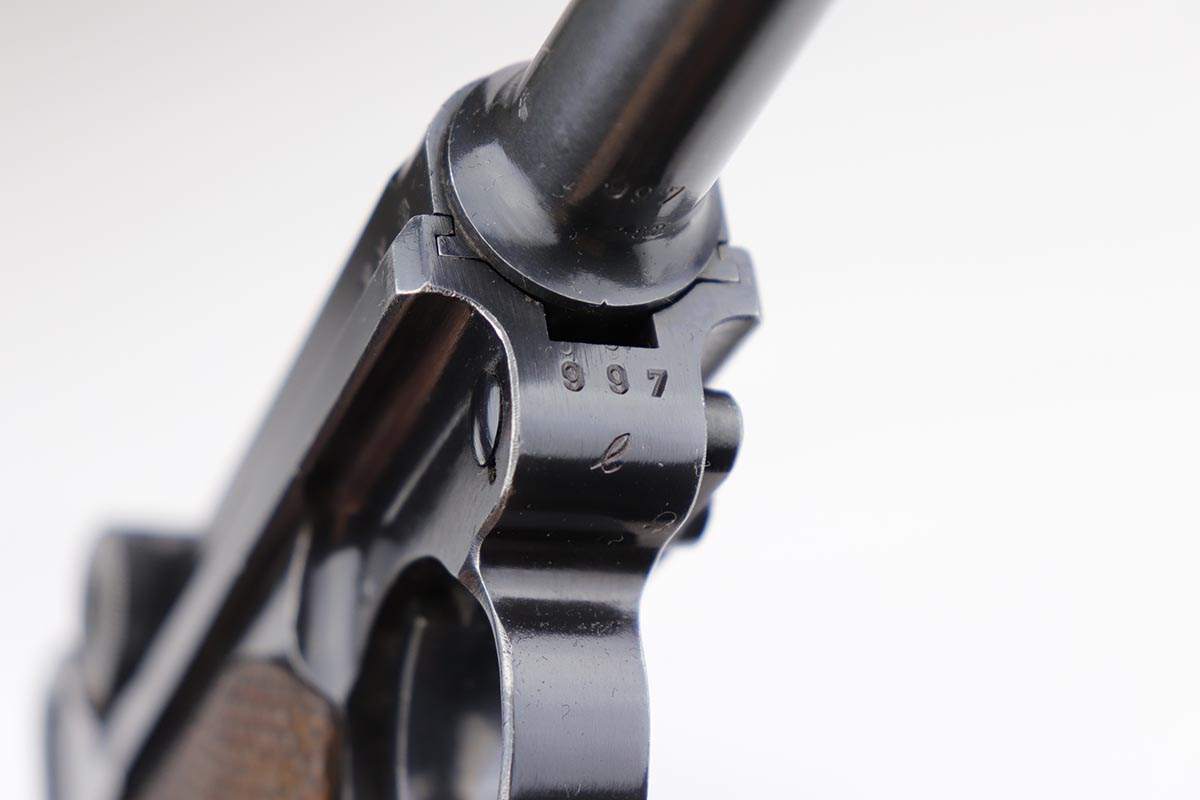 10/21/19 – This is an excellent example of a WW2 Nazi Mauser Luger, chambered for 9mm. The top of the chamber is dated 1938 and it is marked with the “S/42” factory code. The right side of the slide is properly “Eagle 63” waffenamt. Overall, this gun is in excellent condition. We’d rate the finish about 96-97%. There is some minor muzzle wear, minor thinning on the barrel, high-edge wear on the side plate. and very minor thinning on the back strap. All numbered parts are matching. The wooden grips are original and match the gun as well. No import marks. The gun comes with an original, period-correct, “Eagle 63” marked magazine that is not numbered to the gun. The bore is mint. The gun is fully functional. C&R eligible.
