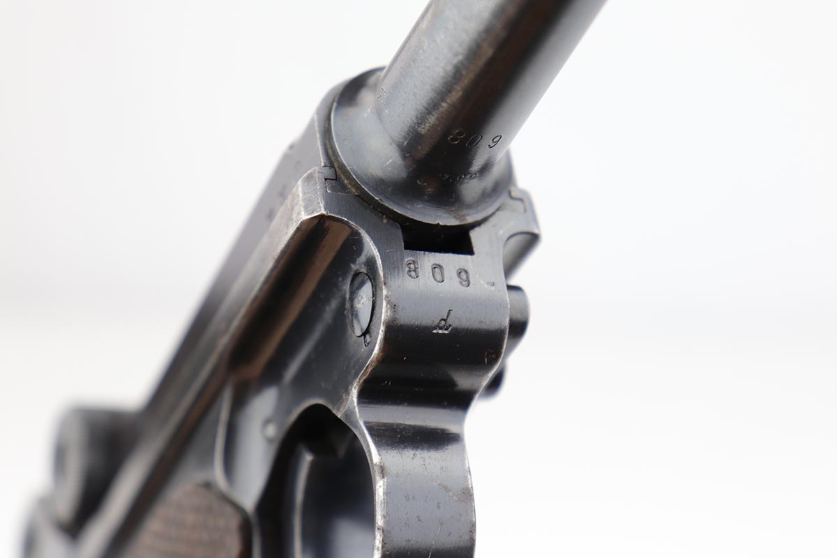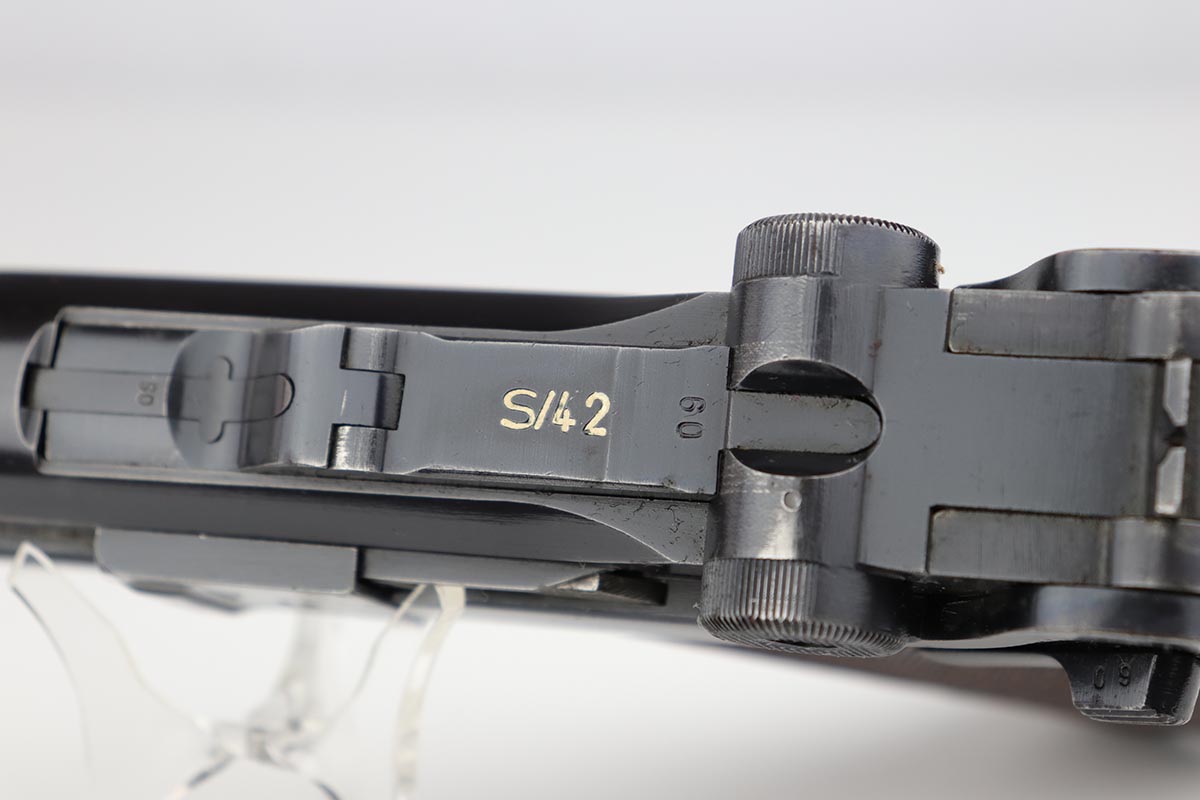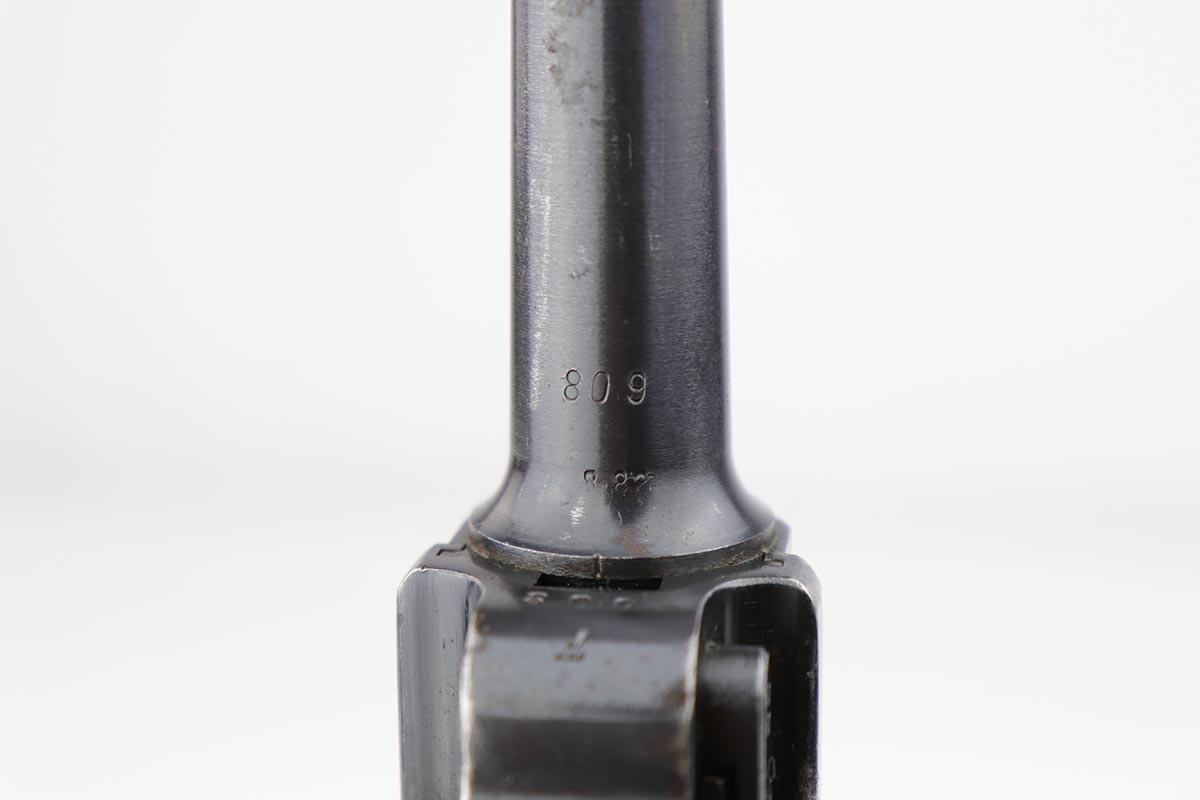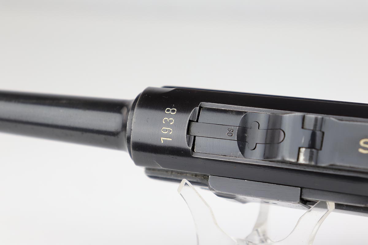 5/14/19 – This is a complete Nazi Mauser Luger rig from 1938 with holster, tool and both matching magazines! The pistol is all matching and original with about 90% blue remaining, showing the majority of finish loss on the barrel, high edges and bottom of the straps. There are also a few small areas of freckling on the sideplate, right side rail, left side frame and trigger guard. The pistol has both original magazines and also has the original, matching grips. Bore has strong rifling and shiny throughout with only minor signs of use. Correct, original tool with Eagle over 63 proof. The rig is completed by an exceptional 1938 dated holster, in near-mint condition.