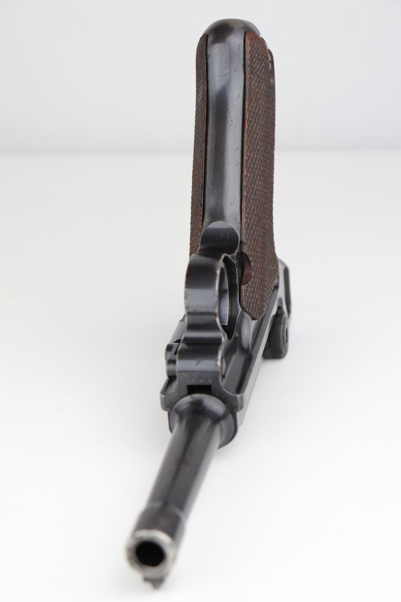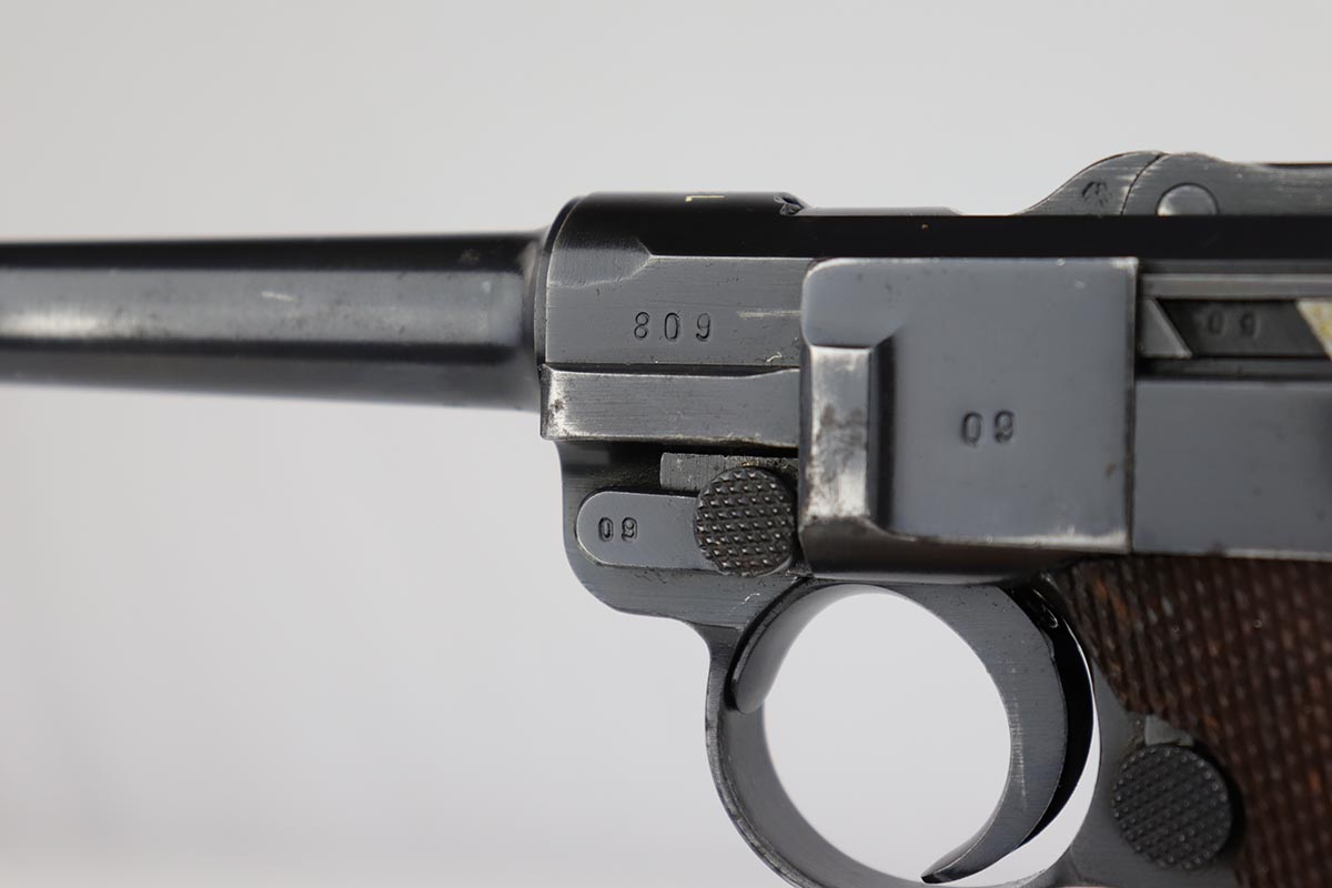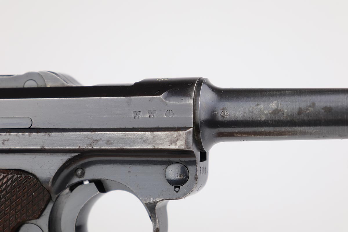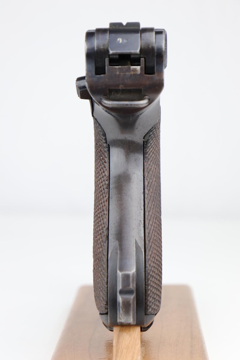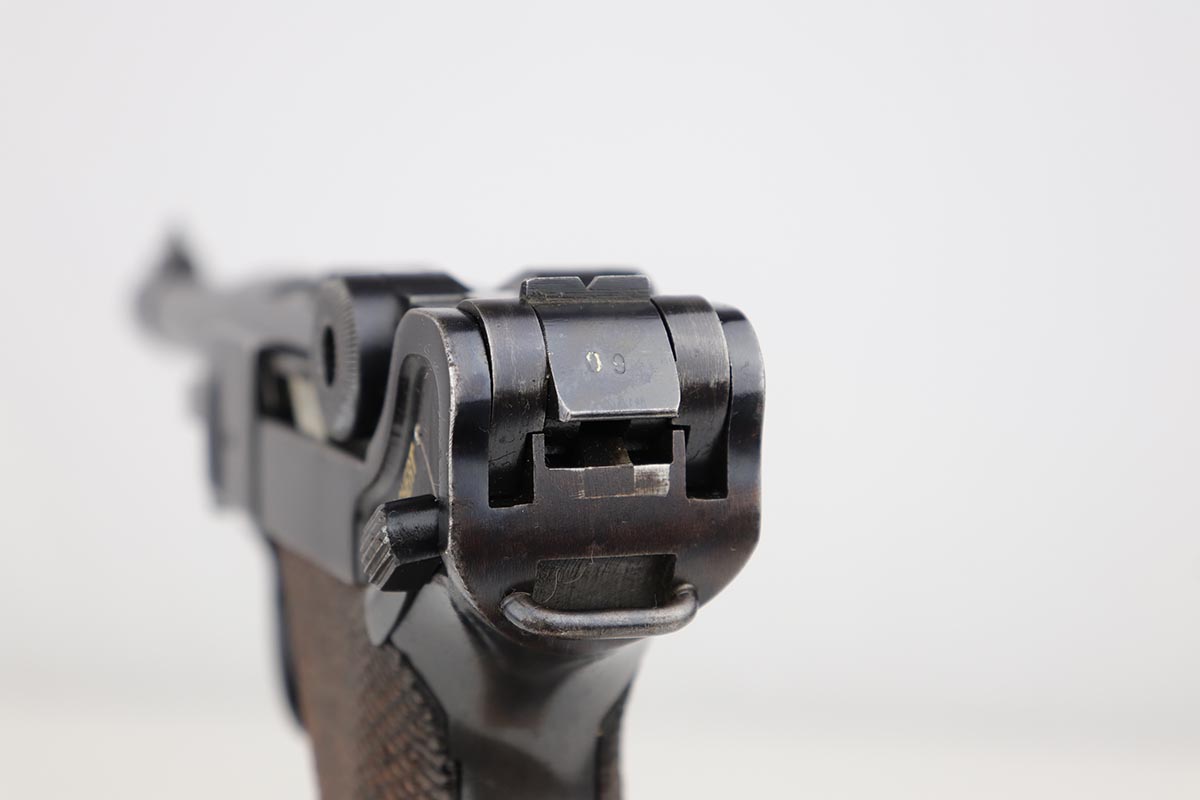 5/14/19 – This is a complete Nazi Mauser Luger rig from 1938 with holster, tool and both matching magazines! The pistol is all matching and original with about 90% blue remaining, showing the majority of finish loss on the barrel, high edges and bottom of the straps. There are also a few small areas of freckling on the sideplate, right side rail, left side frame and trigger guard. The pistol has both original magazines and also has the original, matching grips. Bore has strong rifling and shiny throughout with only minor signs of use. Correct, original tool with Eagle over 63 proof. The rig is completed by an exceptional 1938 dated holster, in near-mint condition.