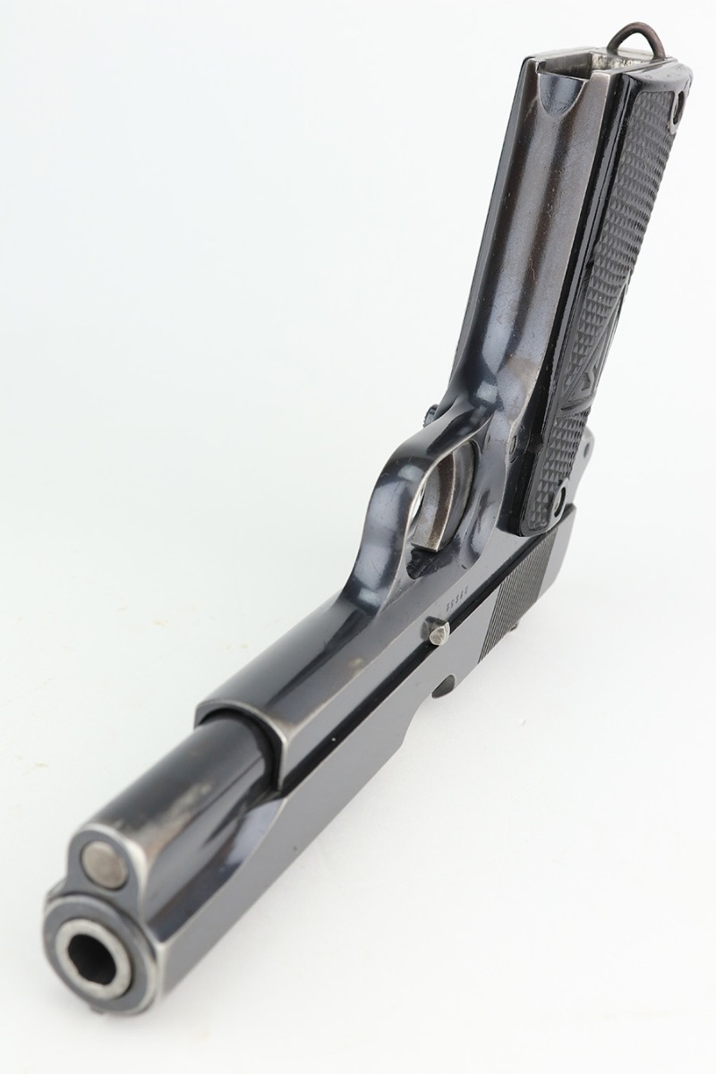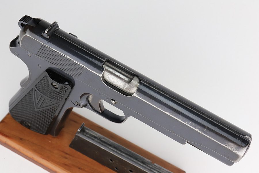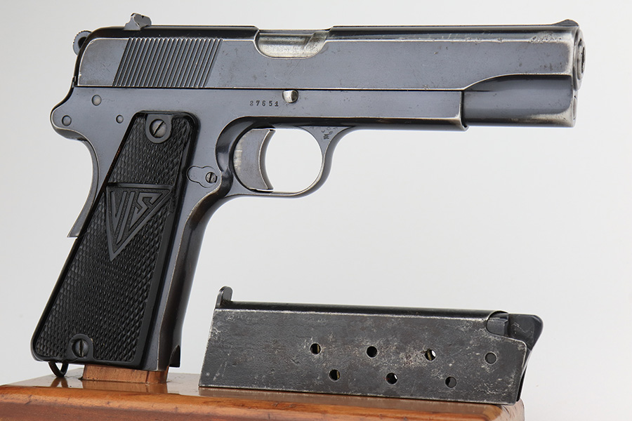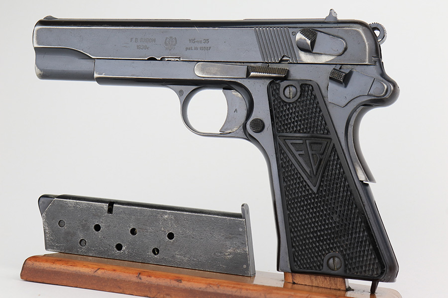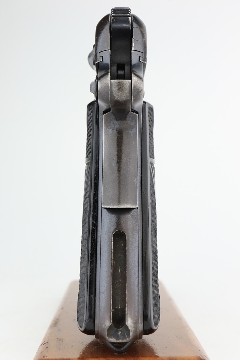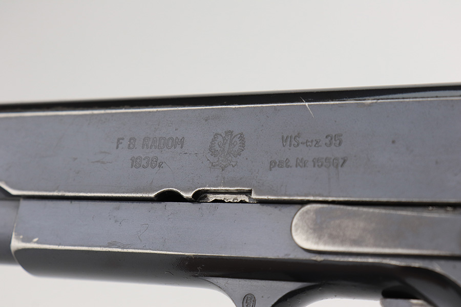 2/1/23 – This is a rare and desirable Polish Eagle Radom VIS Model 35 from 1938. All matching and original, these were considered some of the finest pistols produced in Europe in the ~WW2 era. This one has about 90% of the original blued finish remaining, with most of the wear on the forward edges of the slide, and some more on the rear of the frame/slide. Original grips with some scratches and dings but no cracks. The bore has decent rifling but frost and freckling in the grooves. Rare and original G2-marked magazine.