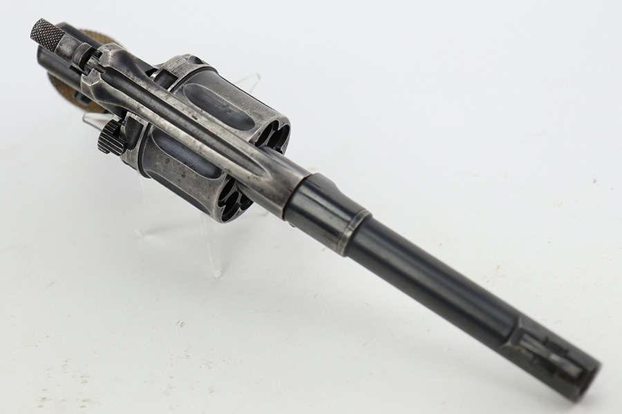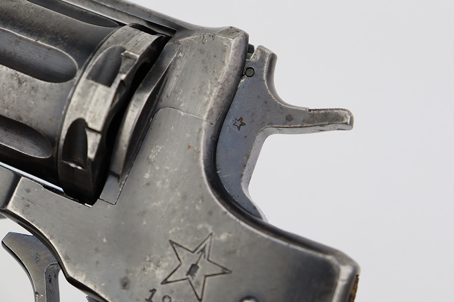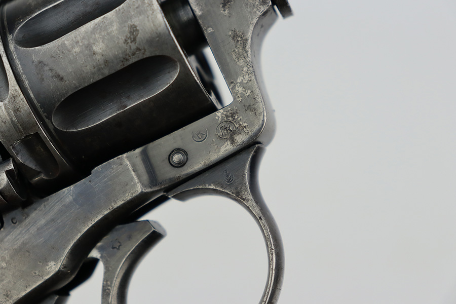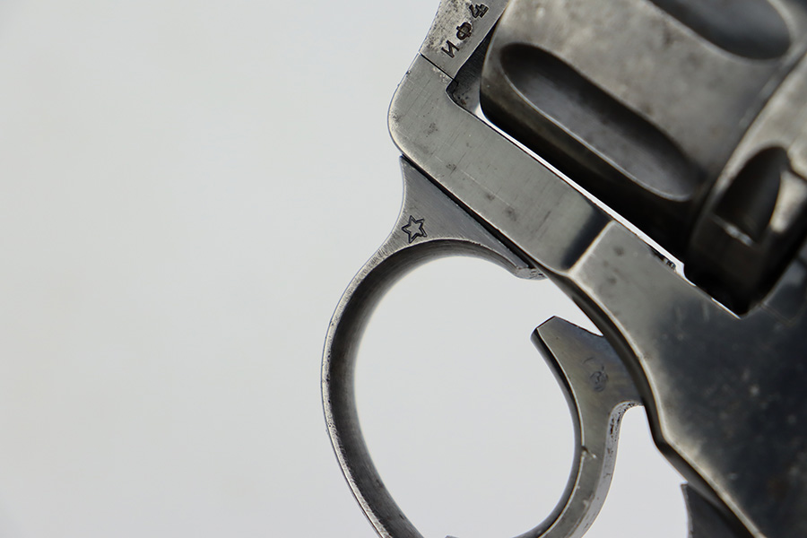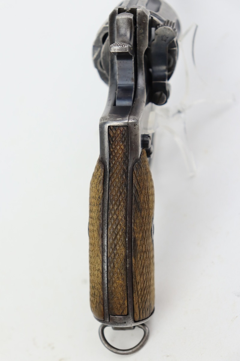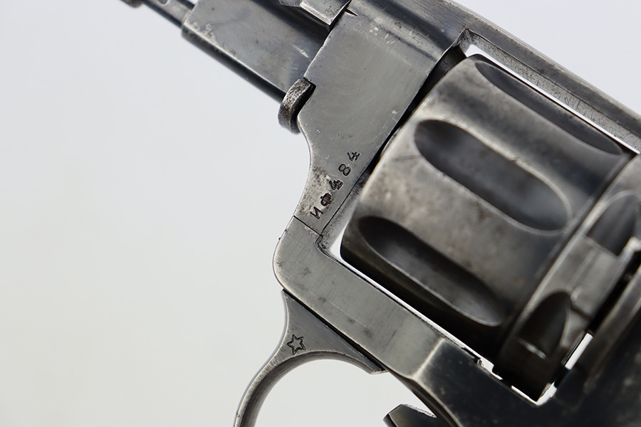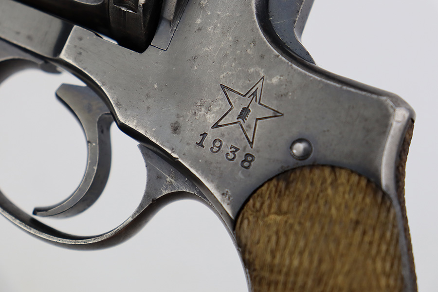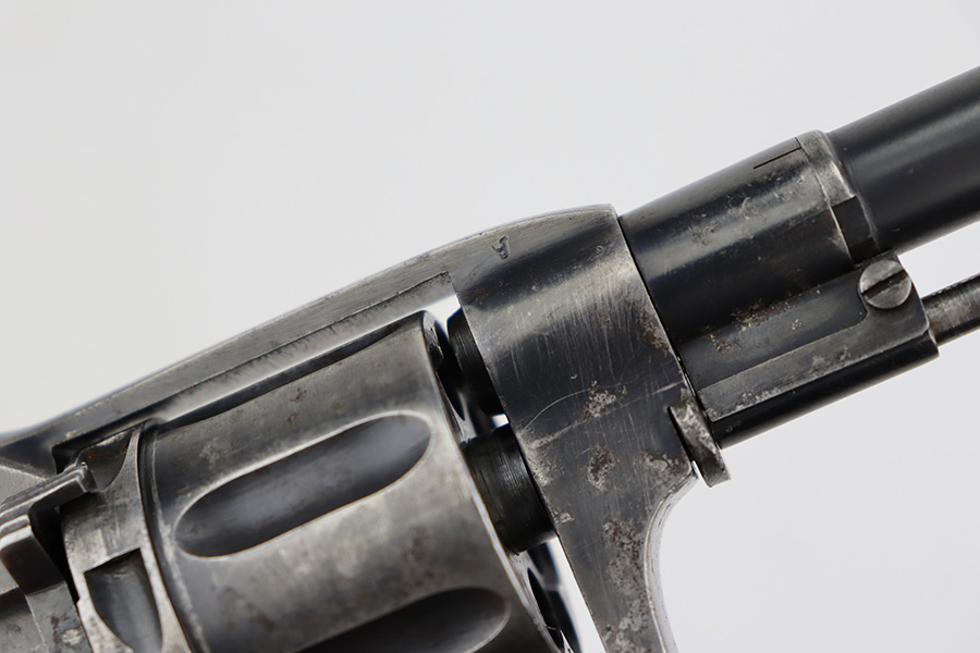 8/25/23 – This is a nice example of a Nagant Model 1895 Revolver, made in the Tula Factory and issued to the Russian military in 1938. It is all matching with no import marks. It has retained only roughly 40% of its original finish with obvious finish loss and splotchy discoloration throughout. A couple of very small spots of light pin-pricking here and there. Fitted with excellent period-correct wood grips – there is a tiny crack in the wood piece on the front strap. Original lanyard loop is intact. The bore has pretty good rifling, but there is pitting throughout.
