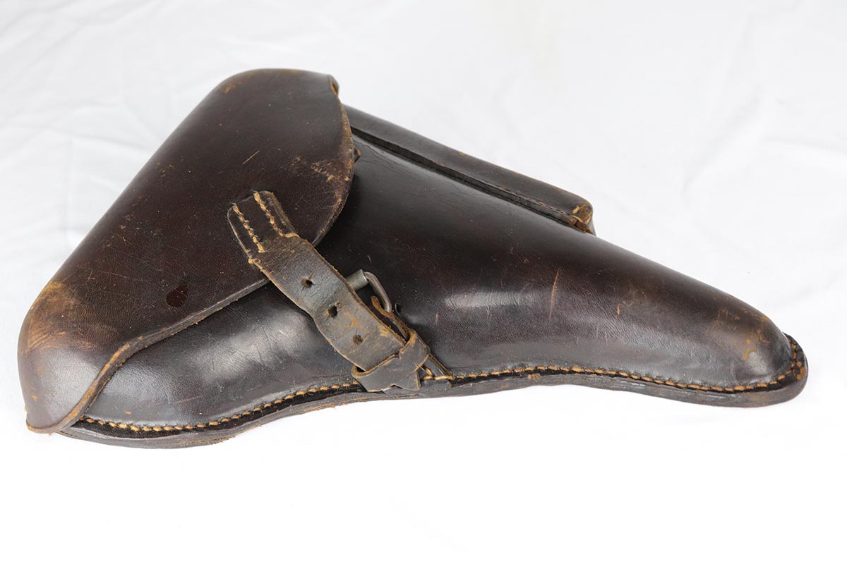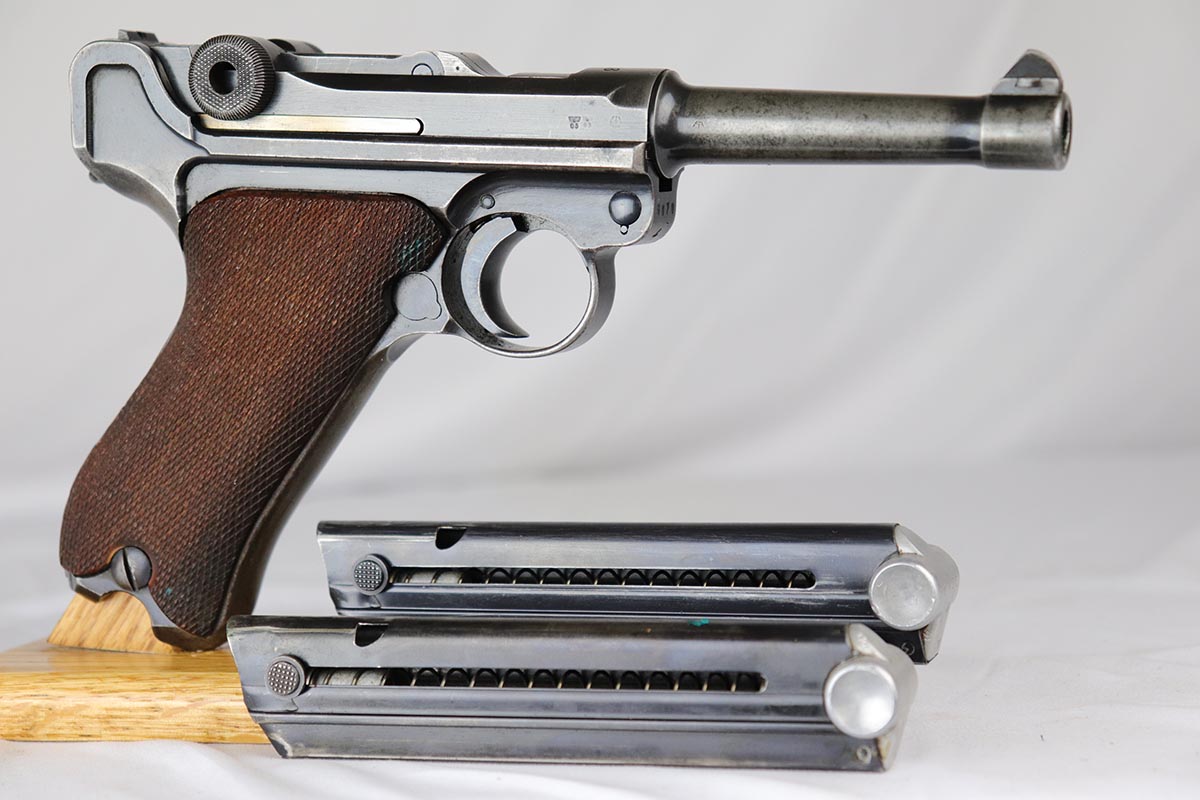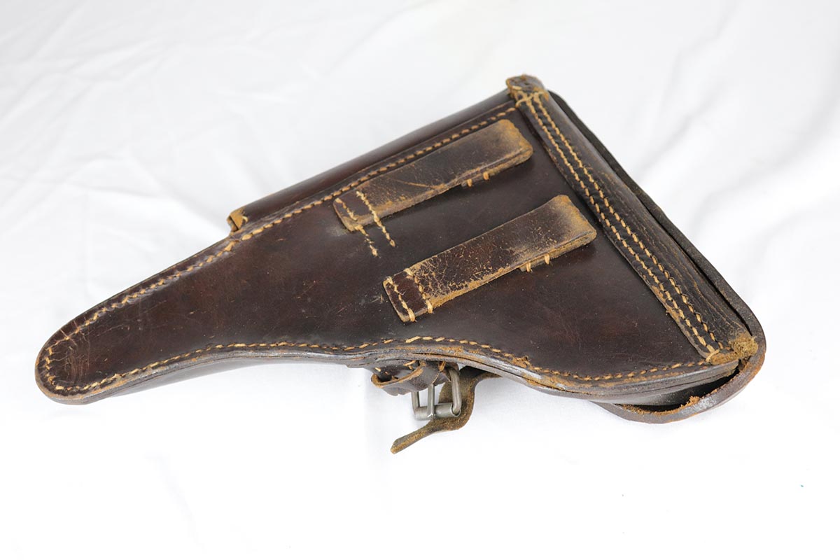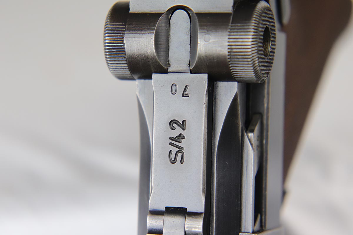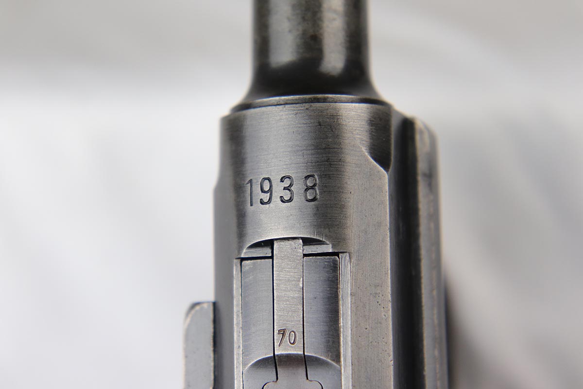 4/26/18 – This is a complete 1938 S/42 Mauser Luger rig with an original holster, spare magazine, and takedown tool. The pistol is all original and matching, but there is significant bluing loss throughout the pistol. The barrel and straps have most of the wear. The bore has some light corrosion but the rifling is still in tact. The grips are excellent and original. The magazines included with this rig are both stick wing eagle 63, as is the takedown tool. The leather holster is in great condition with excellent leather and stitching. The holster is either commercial or WW1 era because there is no date on the back of the leather. Guaranteed all original and authentic.