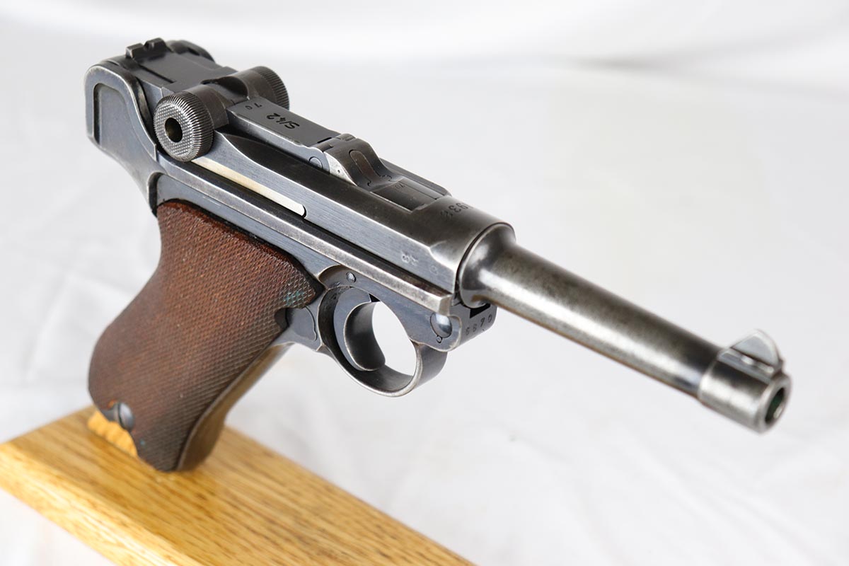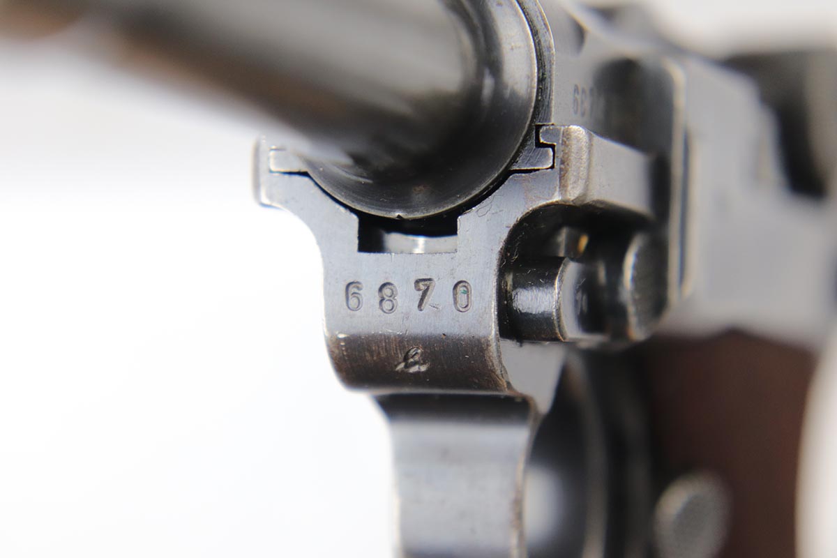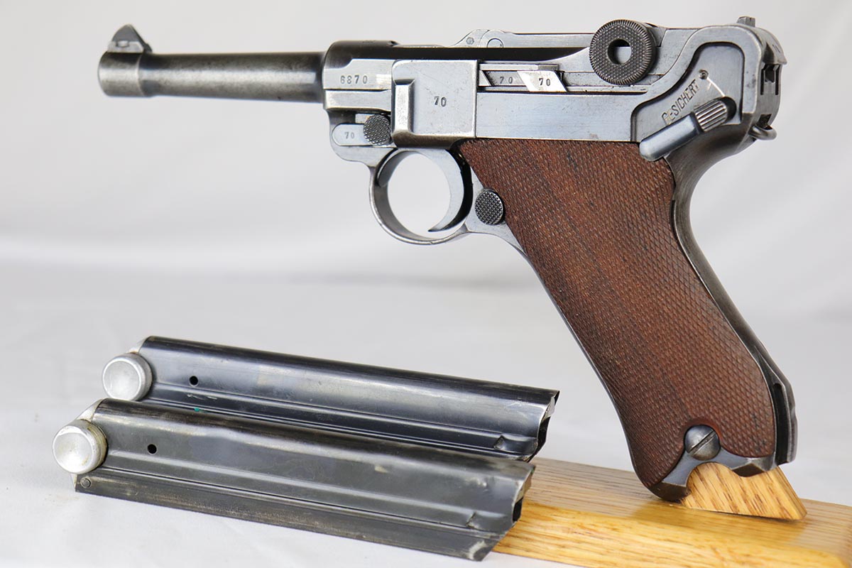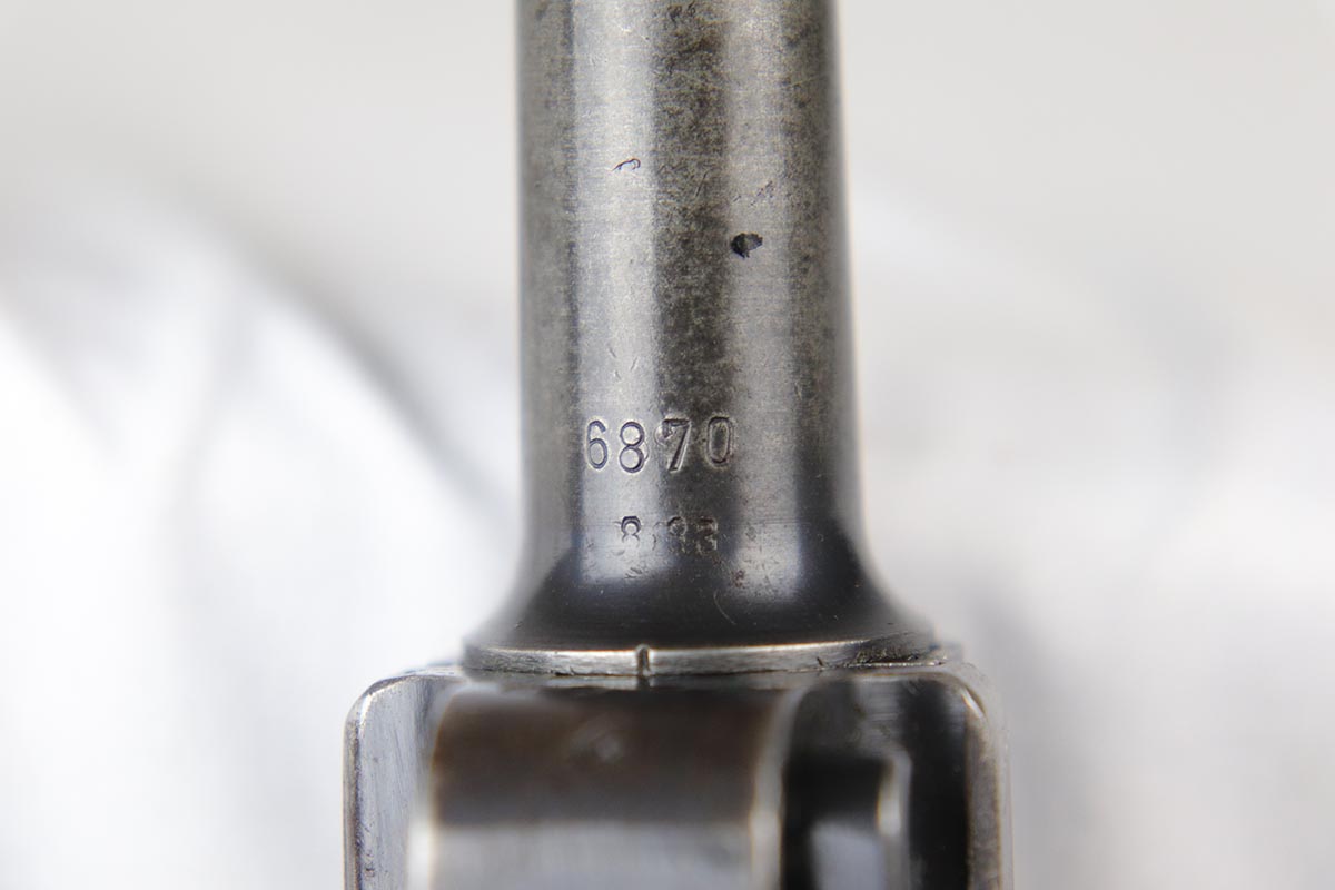 4/26/18 – This is a complete 1938 S/42 Mauser Luger rig with an original holster, spare magazine, and takedown tool. The pistol is all original and matching, but there is significant bluing loss throughout the pistol. The barrel and straps have most of the wear. The bore has some light corrosion but the rifling is still in tact. The grips are excellent and original. The magazines included with this rig are both stick wing eagle 63, as is the takedown tool. The leather holster is in great condition with excellent leather and stitching. The holster is either commercial or WW1 era because there is no date on the back of the leather. Guaranteed all original and authentic.