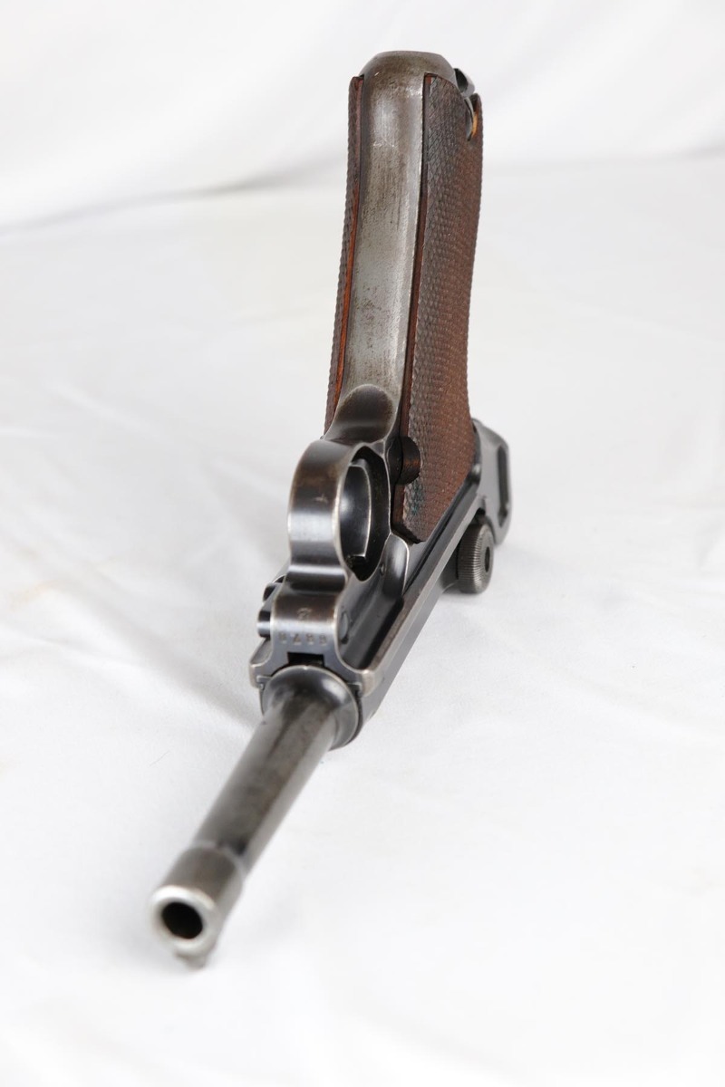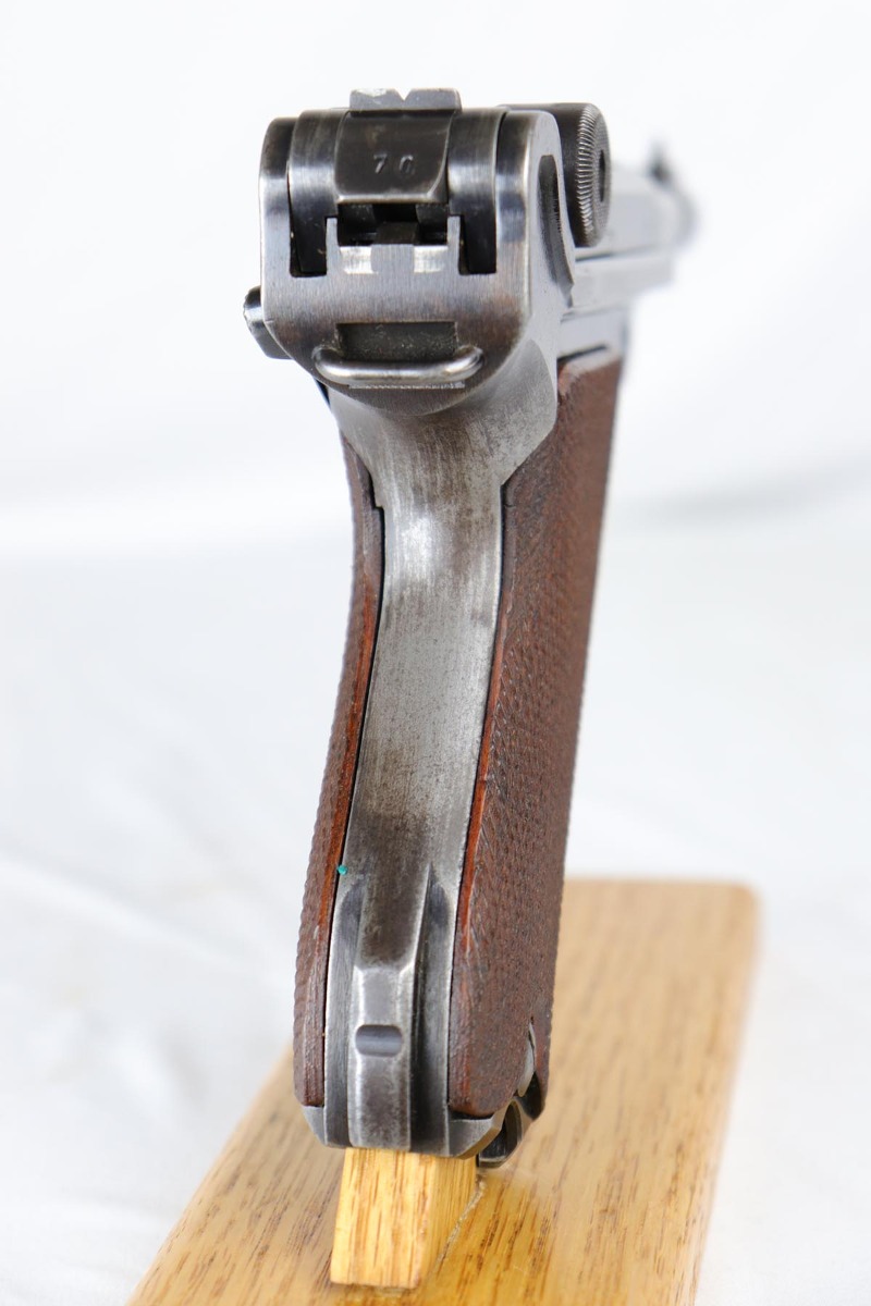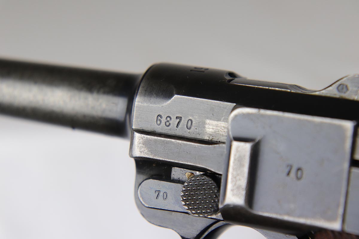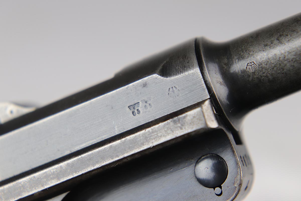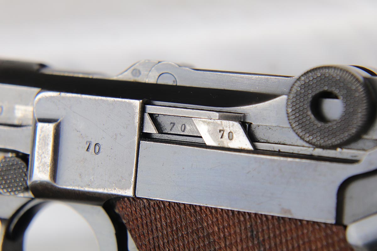 4/26/18 – This is a complete 1938 S/42 Mauser Luger rig with an original holster, spare magazine, and takedown tool. The pistol is all original and matching, but there is significant bluing loss throughout the pistol. The barrel and straps have most of the wear. The bore has some light corrosion but the rifling is still in tact. The grips are excellent and original. The magazines included with this rig are both stick wing eagle 63, as is the takedown tool. The leather holster is in great condition with excellent leather and stitching. The holster is either commercial or WW1 era because there is no date on the back of the leather. Guaranteed all original and authentic.