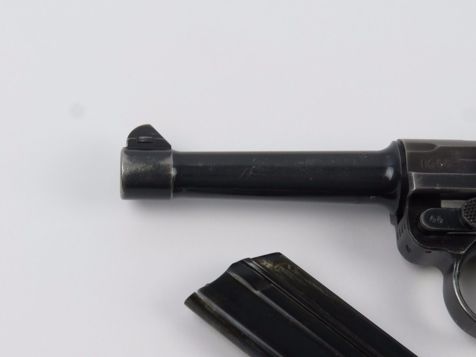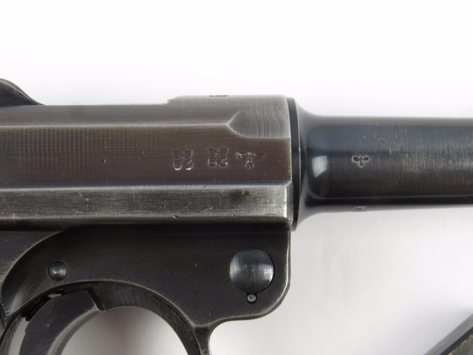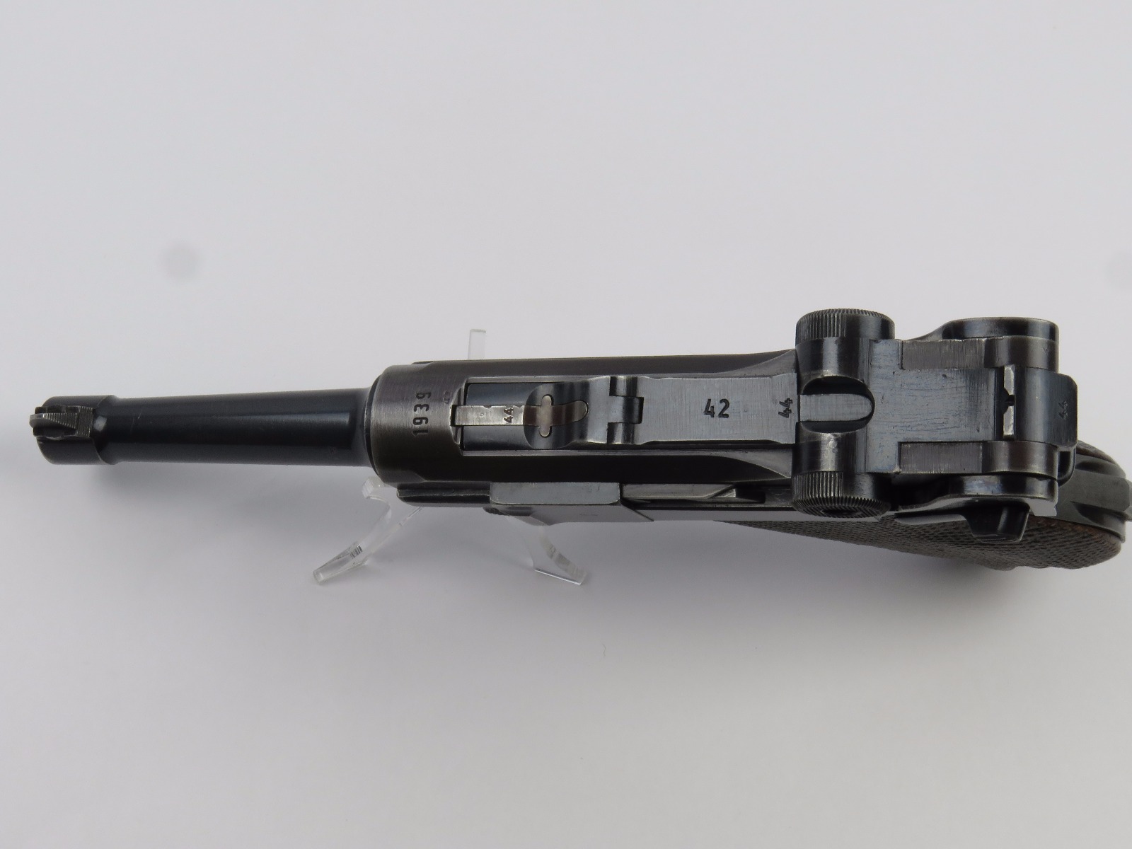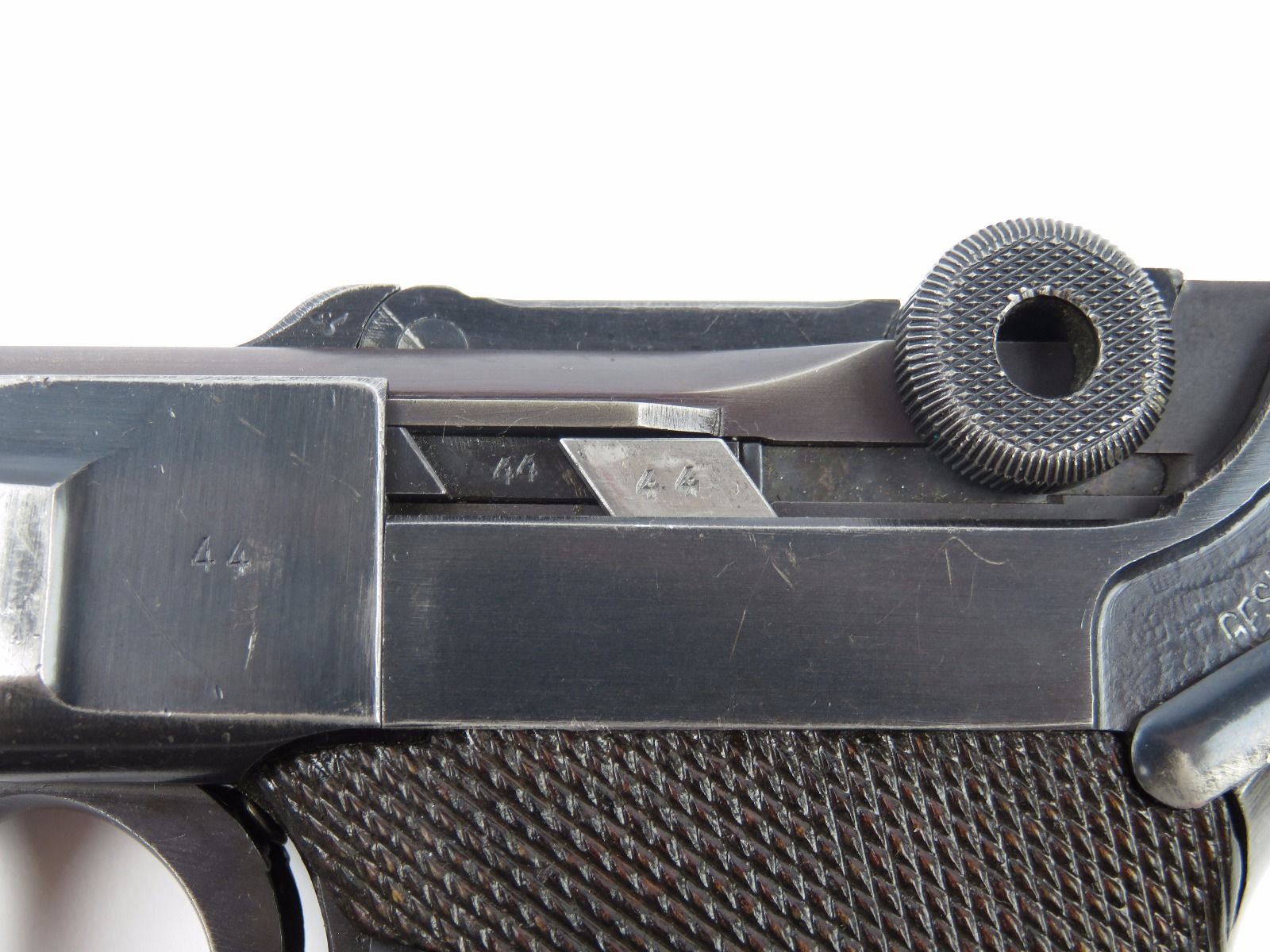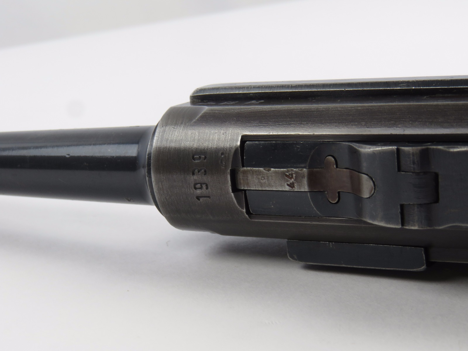 9/26/17 – This is an original Mauser Luger produced during WW2. The pistol has a light plumb colored finish on the receiver, while the frame, barrel, and toggle are blued. The bluing is completley worn off of the front and back strap, and there is normal thinning wear in other places like around the muzzle and barrel, side plate, and typical edge wear. Overall we rate at about 80% but most of the wear is clearly on the front and back straps. The toggle and top of pistol is fine though. The pistol is also all correct and original configuration with no signs of tampering, which makes this a nice all original condition shooter or relatively affordable collector piece. The bore has some minor corrosion and surface wear, but should have no problems shooting after a thorough cleaning and proper use.