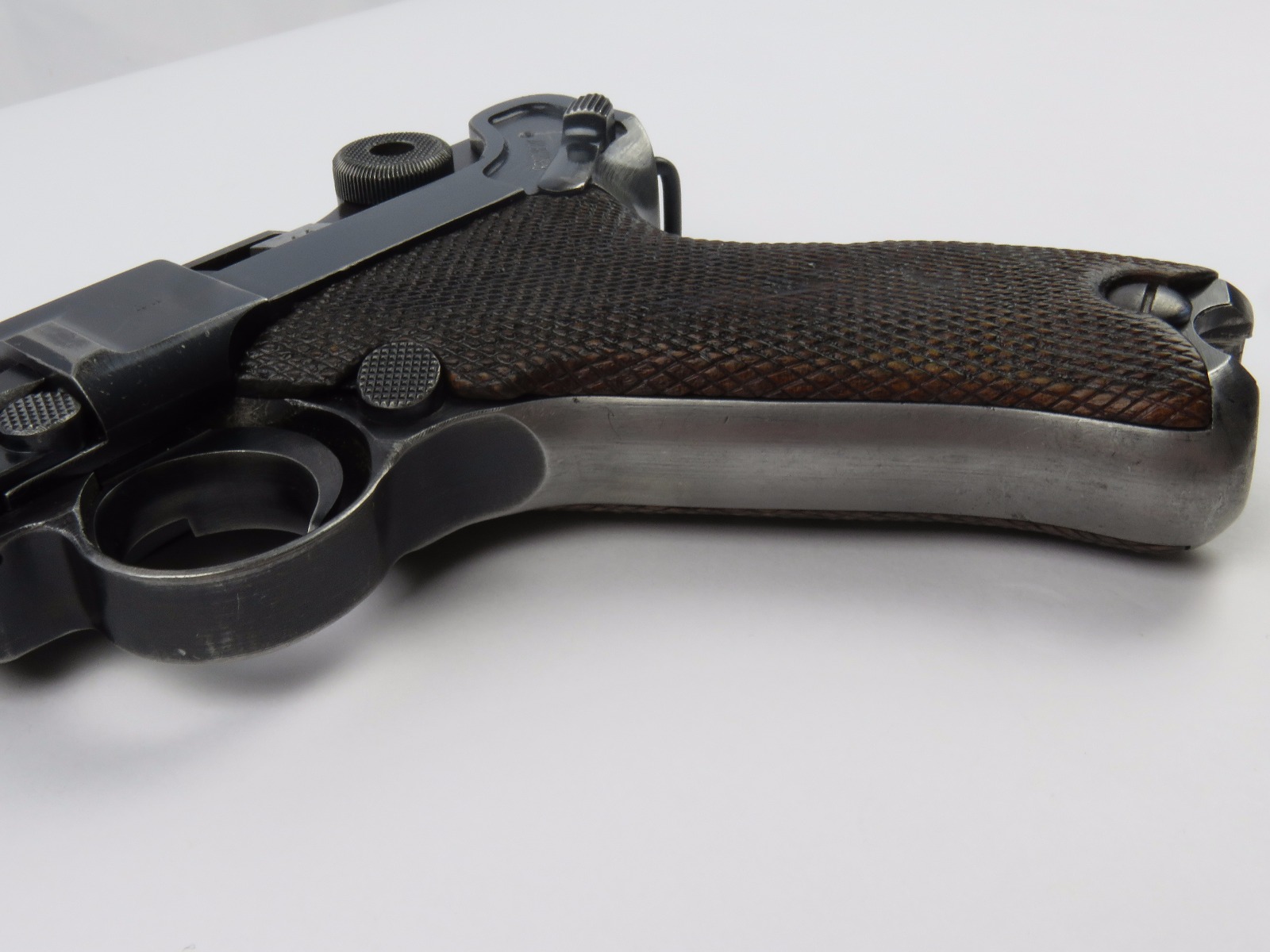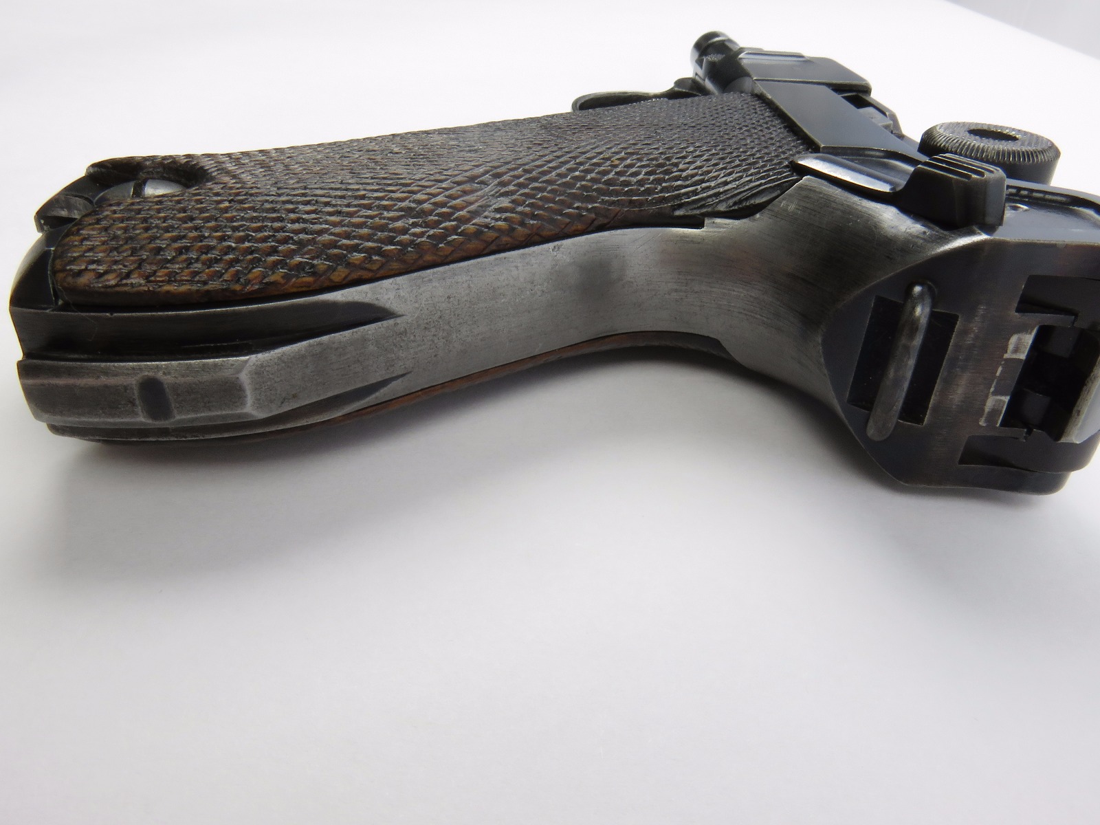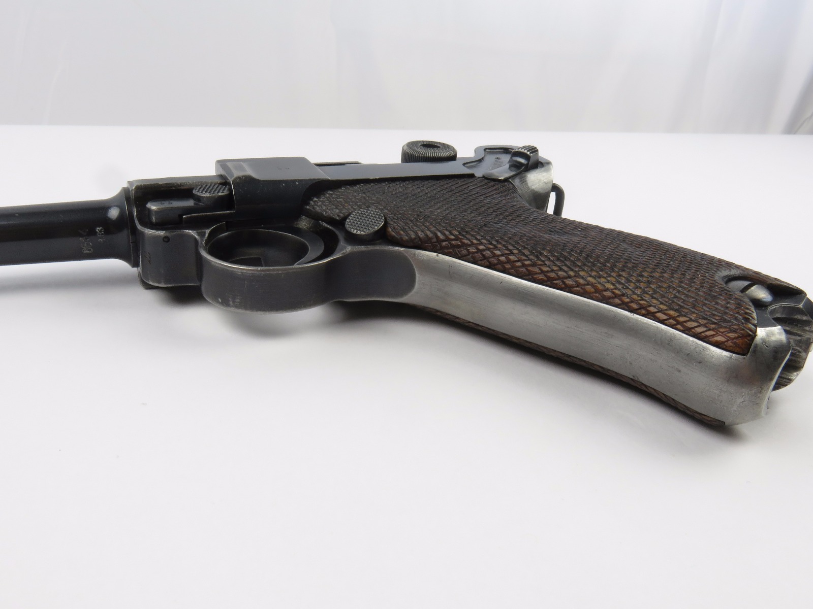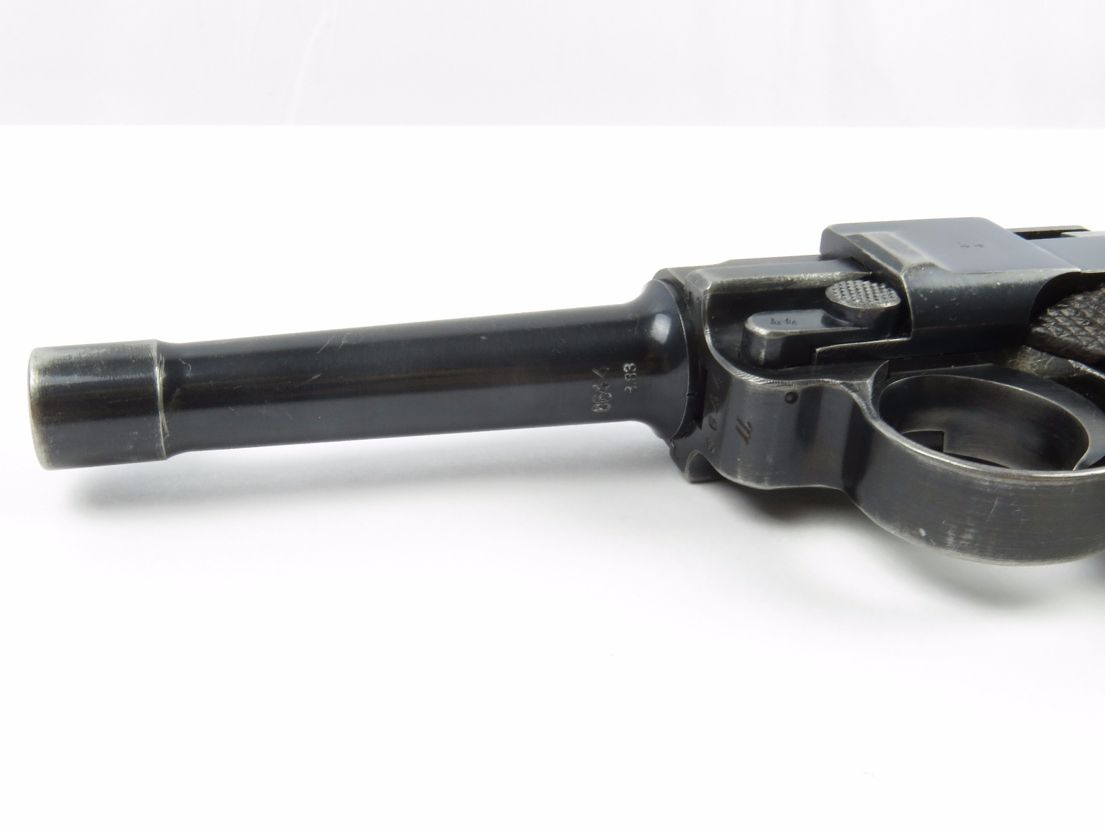 9/26/17 – This is an original Mauser Luger produced during WW2. The pistol has a light plumb colored finish on the receiver, while the frame, barrel, and toggle are blued. The bluing is completley worn off of the front and back strap, and there is normal thinning wear in other places like around the muzzle and barrel, side plate, and typical edge wear. Overall we rate at about 80% but most of the wear is clearly on the front and back straps. The toggle and top of pistol is fine though. The pistol is also all correct and original configuration with no signs of tampering, which makes this a nice all original condition shooter or relatively affordable collector piece. The bore has some minor corrosion and surface wear, but should have no problems shooting after a thorough cleaning and proper use.
