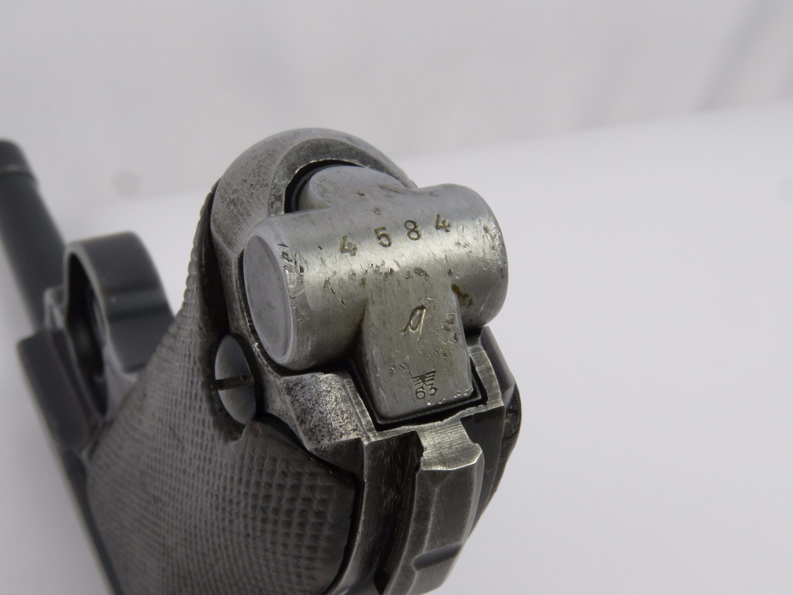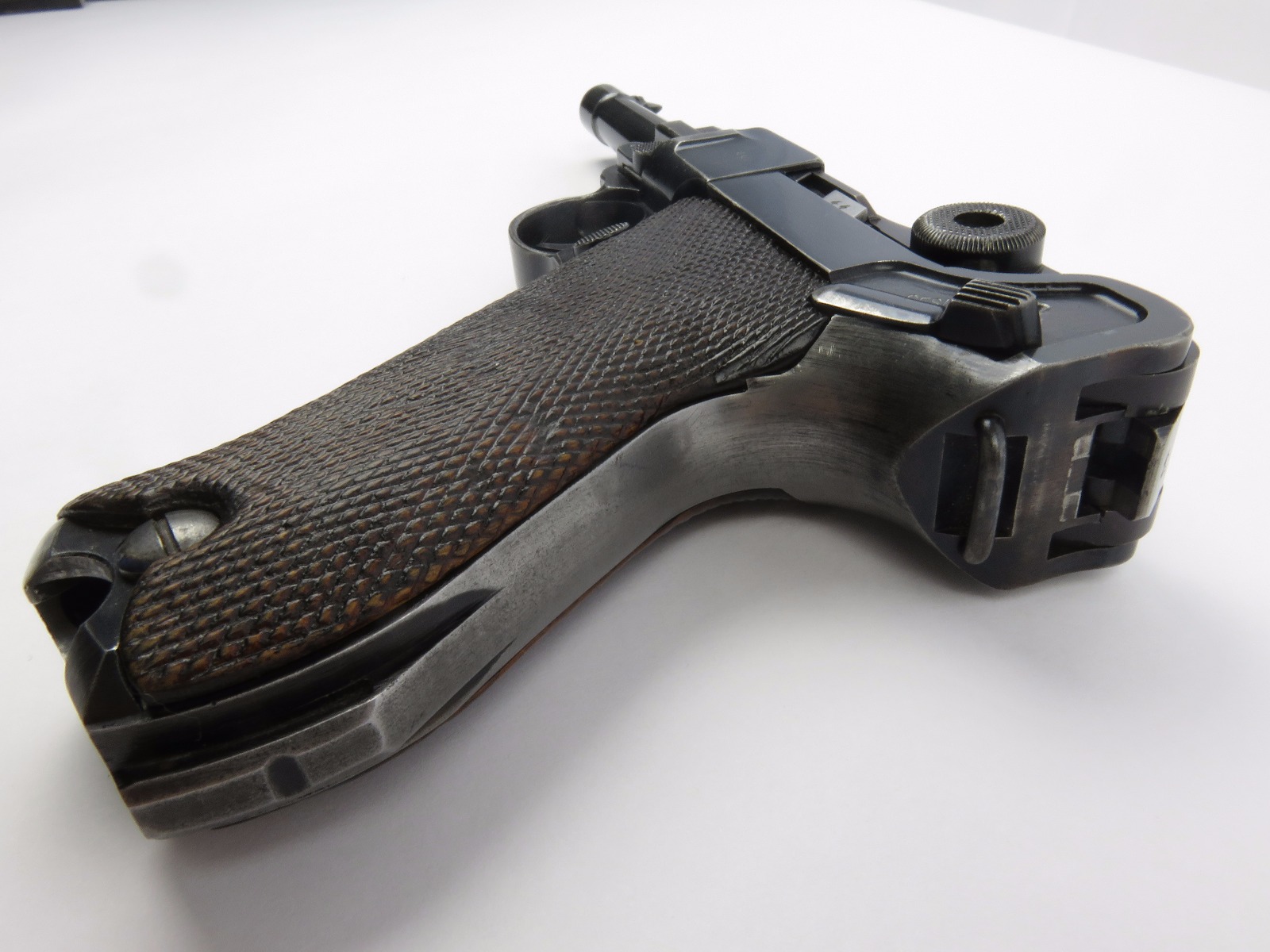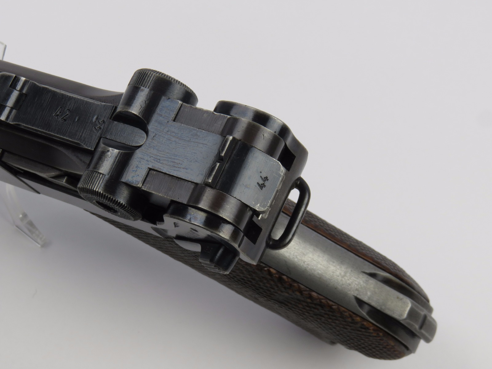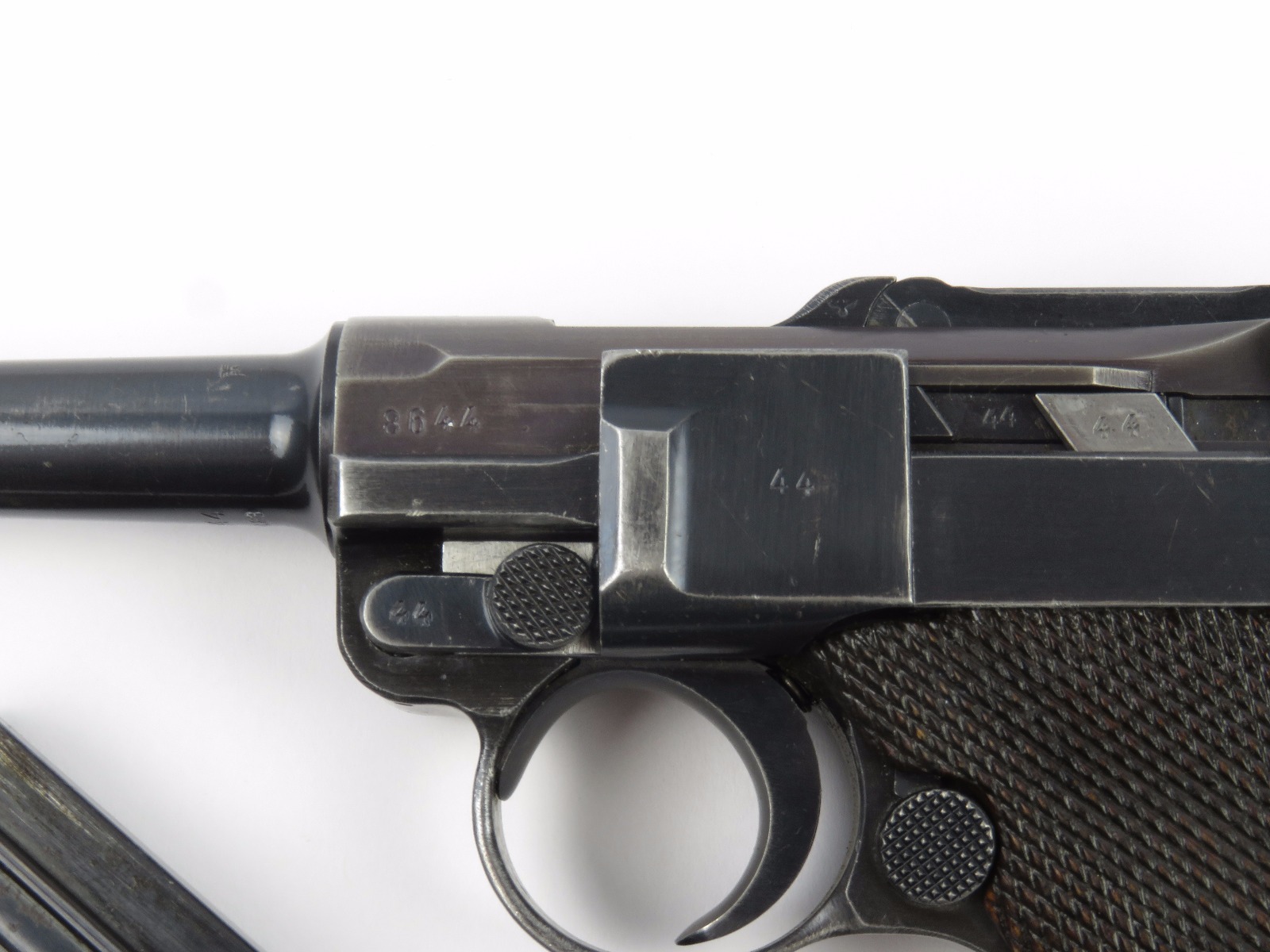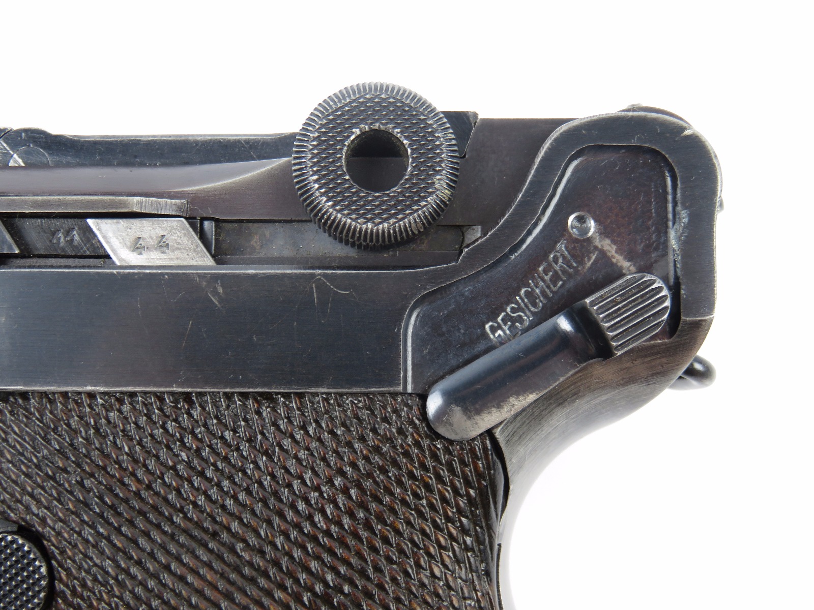 9/26/17 – This is an original Mauser Luger produced during WW2. The pistol has a light plumb colored finish on the receiver, while the frame, barrel, and toggle are blued. The bluing is completley worn off of the front and back strap, and there is normal thinning wear in other places like around the muzzle and barrel, side plate, and typical edge wear. Overall we rate at about 80% but most of the wear is clearly on the front and back straps. The toggle and top of pistol is fine though. The pistol is also all correct and original configuration with no signs of tampering, which makes this a nice all original condition shooter or relatively affordable collector piece. The bore has some minor corrosion and surface wear, but should have no problems shooting after a thorough cleaning and proper use.