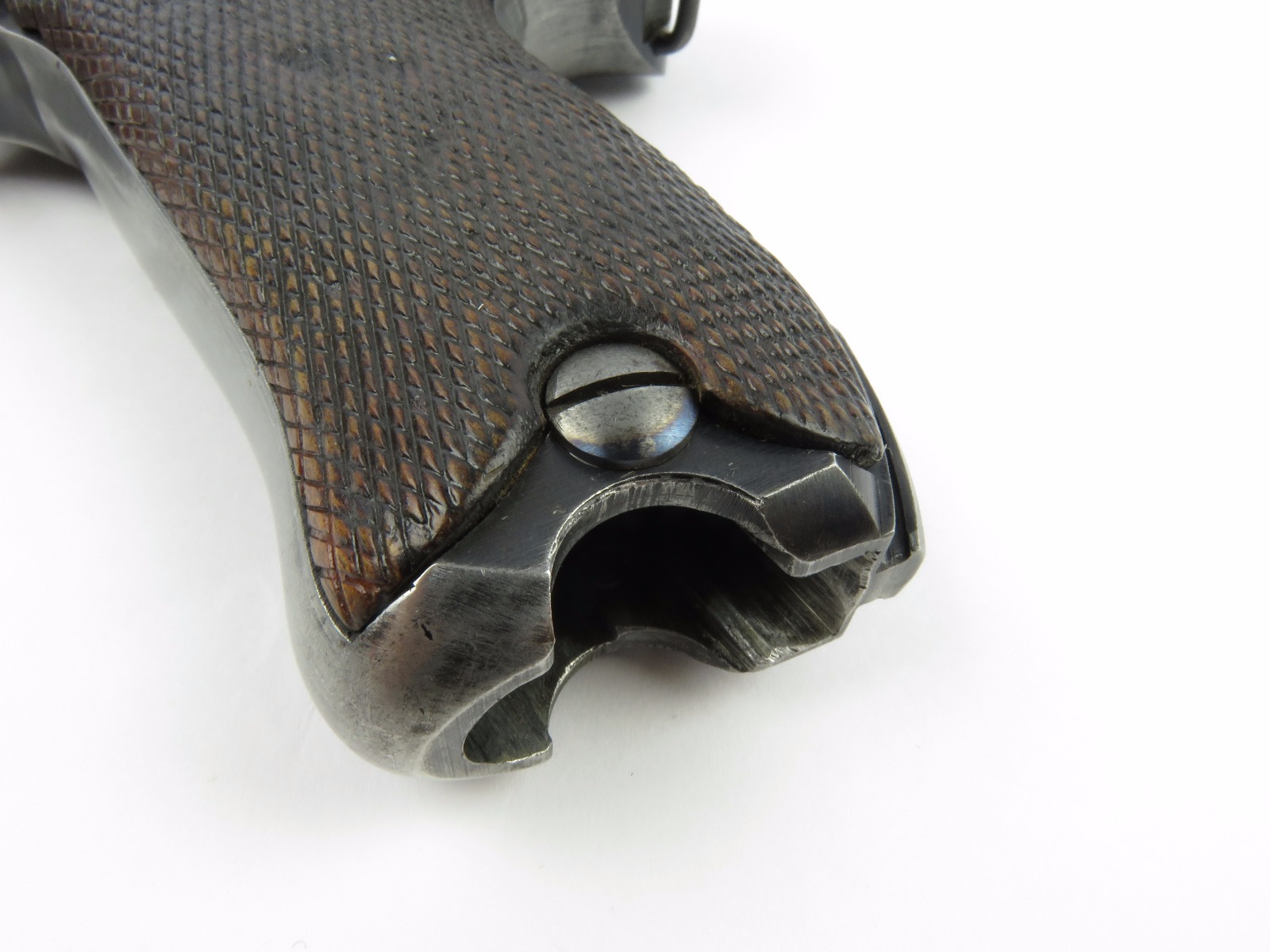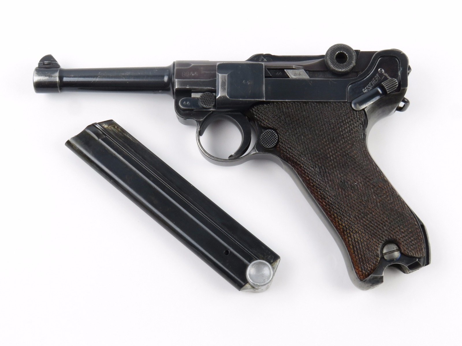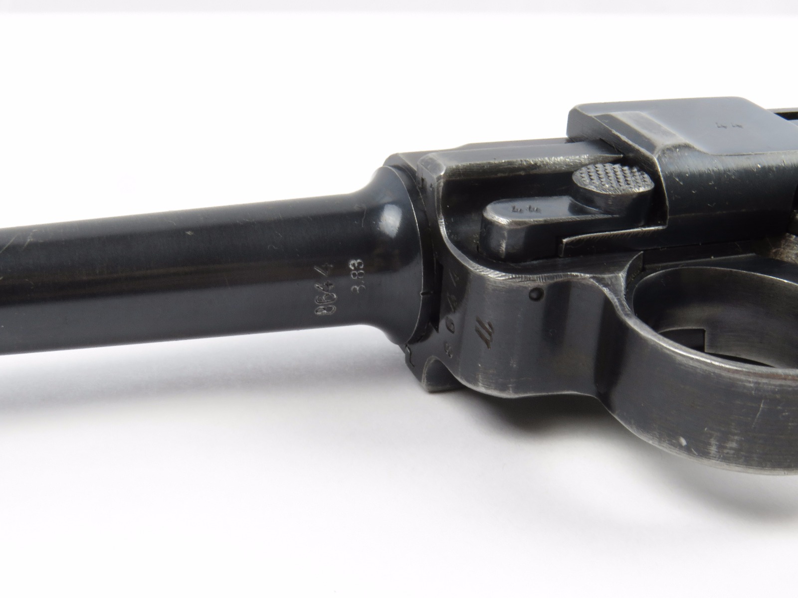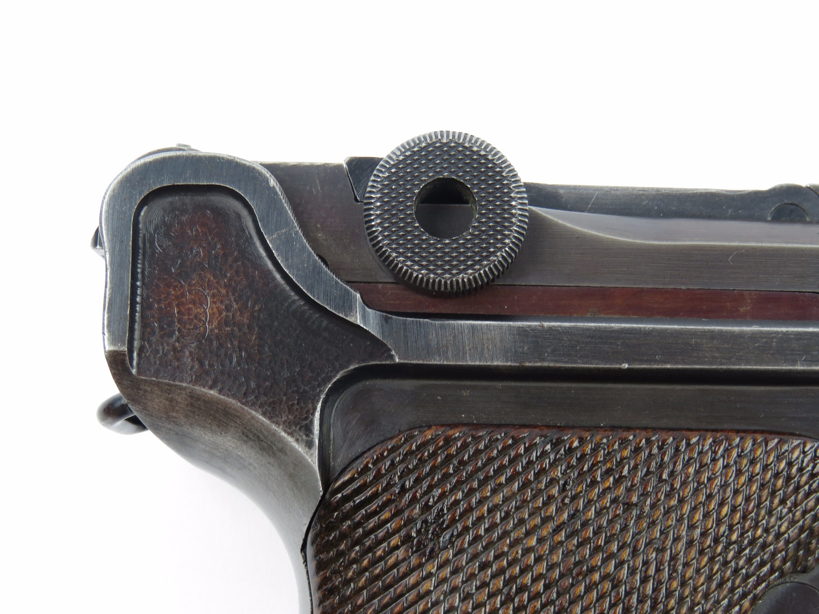 9/26/17 – This is an original Mauser Luger produced during WW2. The pistol has a light plumb colored finish on the receiver, while the frame, barrel, and toggle are blued. The bluing is completley worn off of the front and back strap, and there is normal thinning wear in other places like around the muzzle and barrel, side plate, and typical edge wear. Overall we rate at about 80% but most of the wear is clearly on the front and back straps. The toggle and top of pistol is fine though. The pistol is also all correct and original configuration with no signs of tampering, which makes this a nice all original condition shooter or relatively affordable collector piece. The bore has some minor corrosion and surface wear, but should have no problems shooting after a thorough cleaning and proper use.