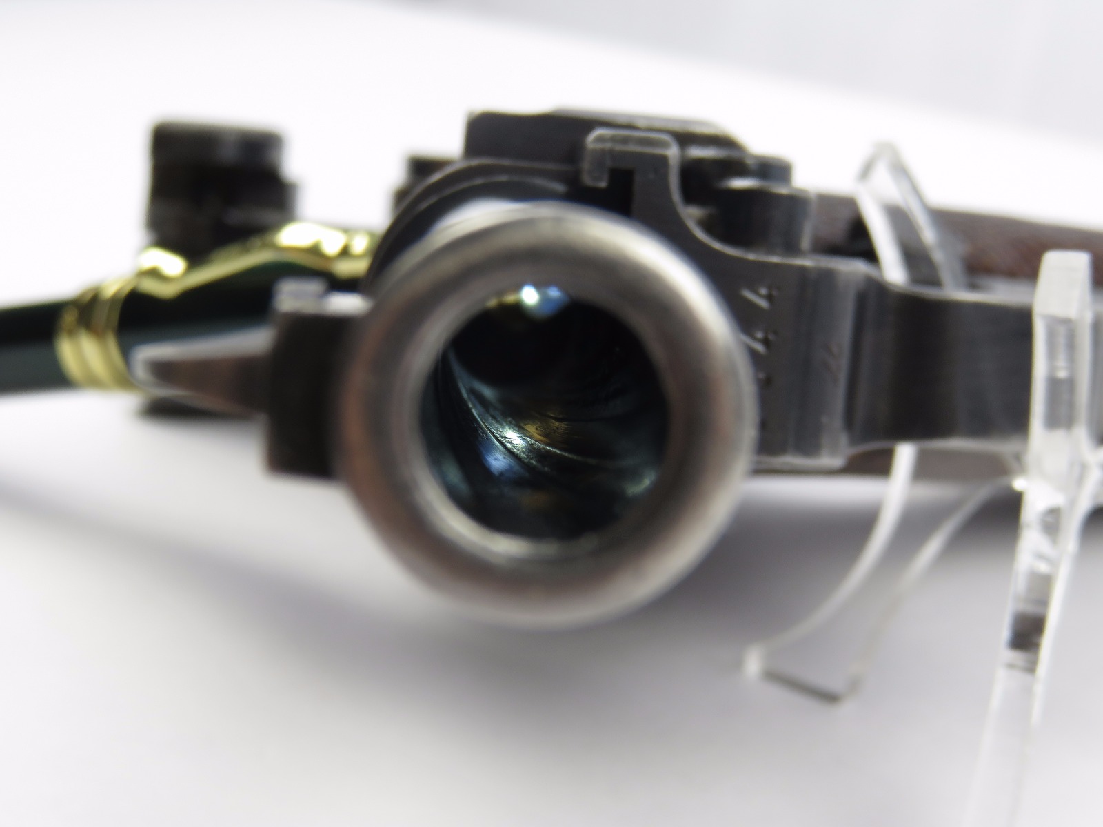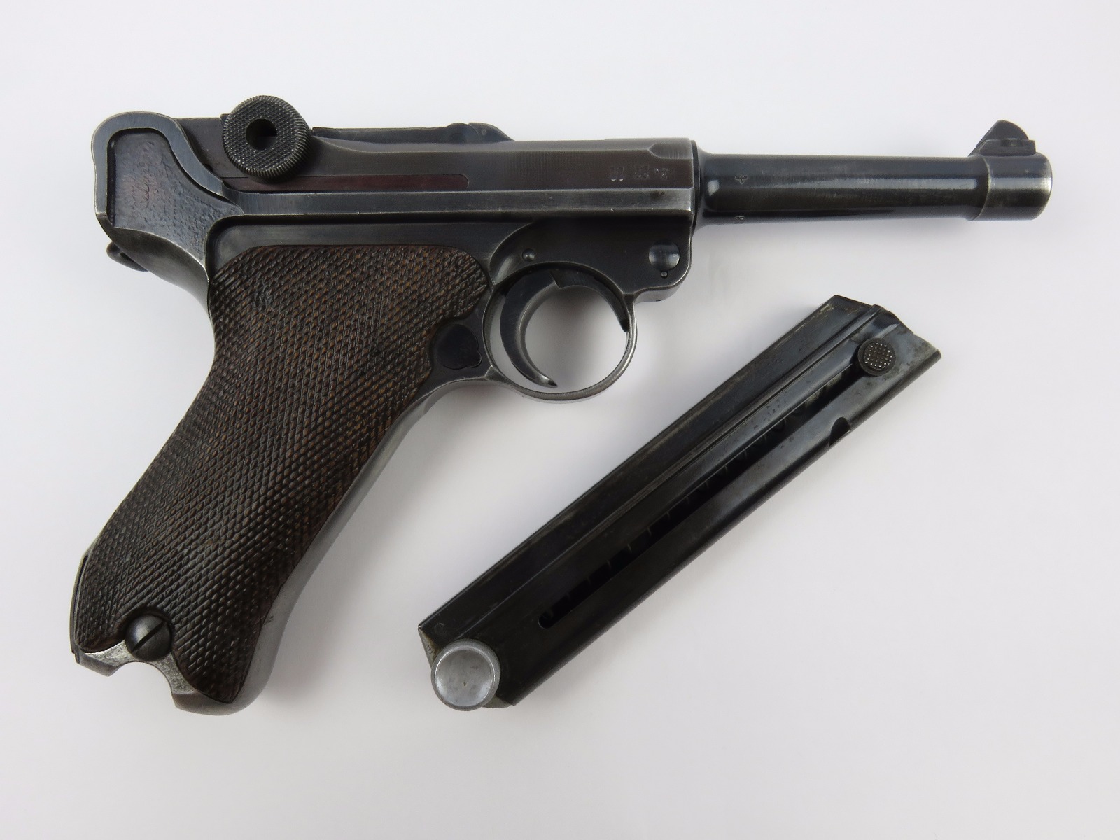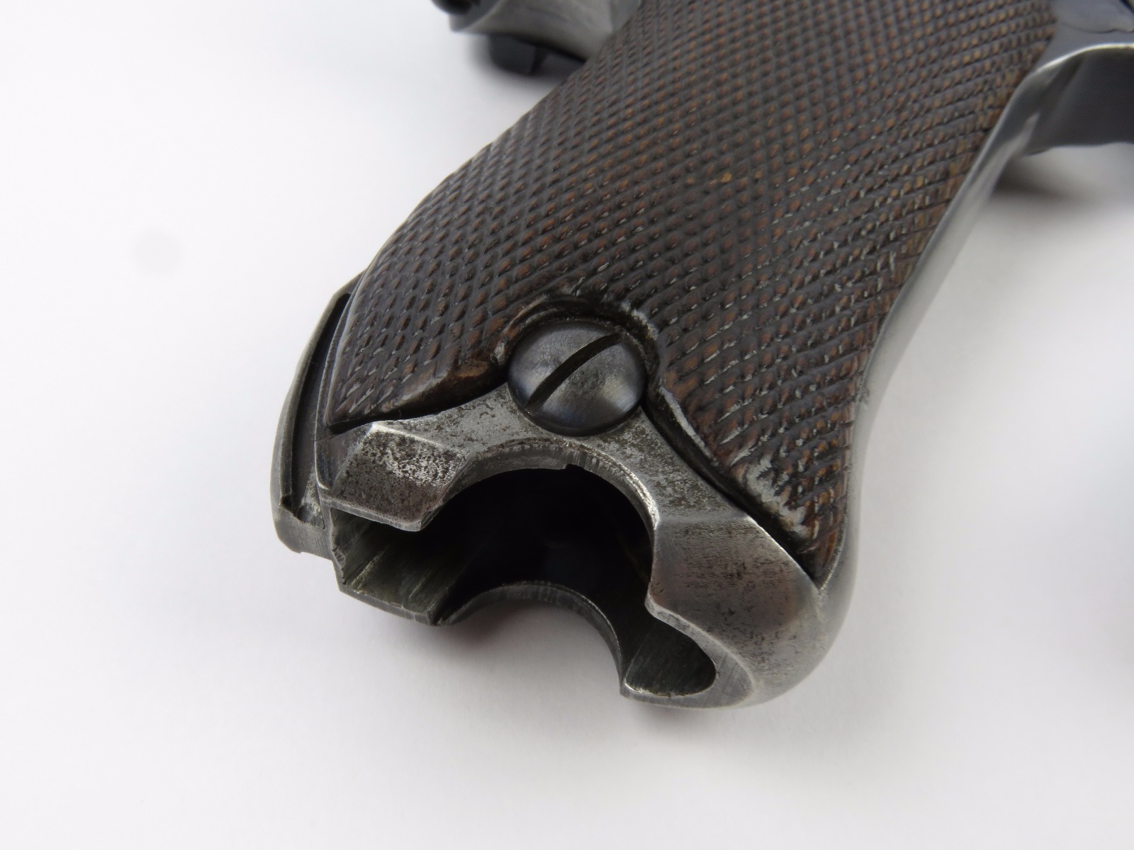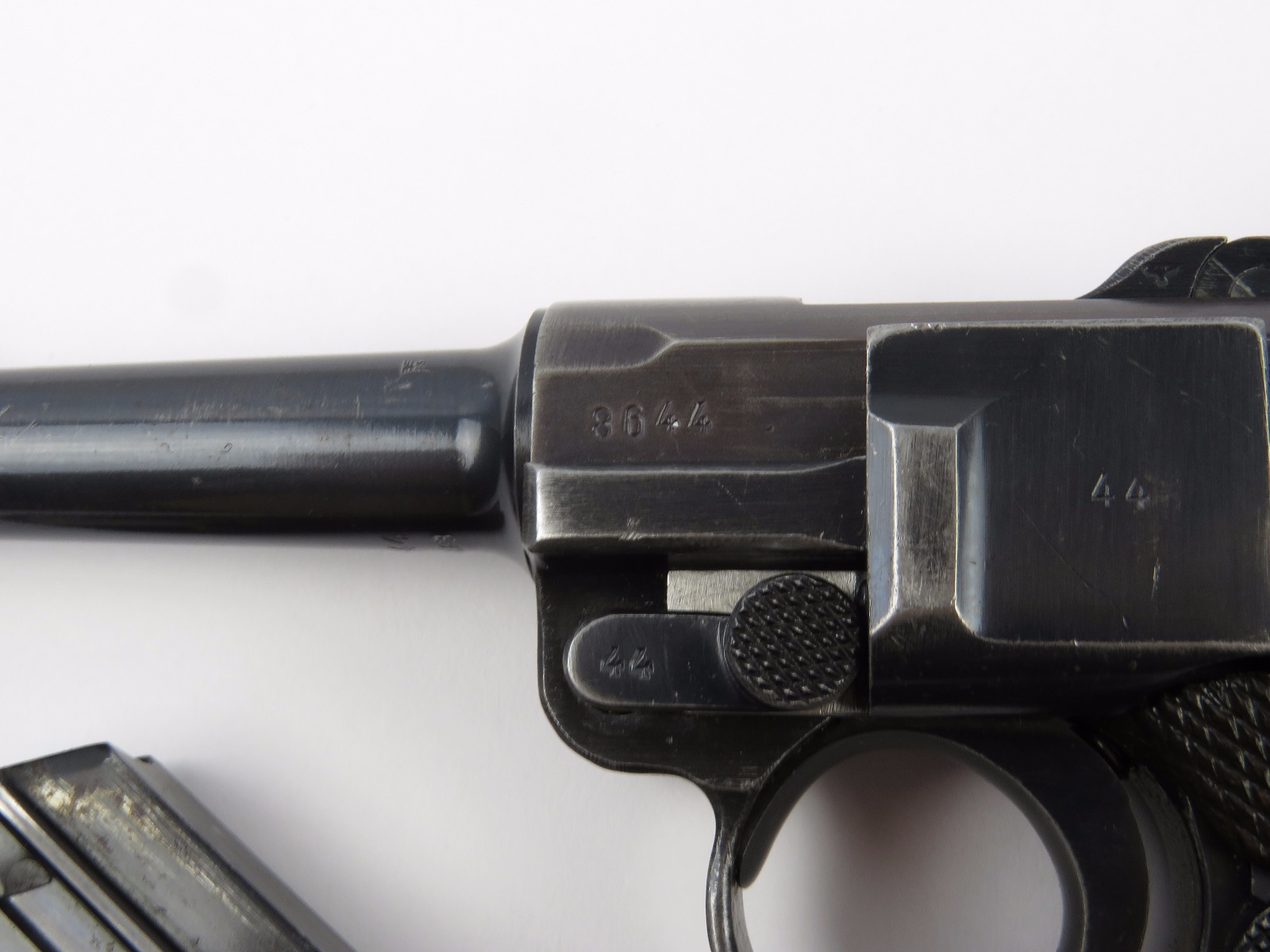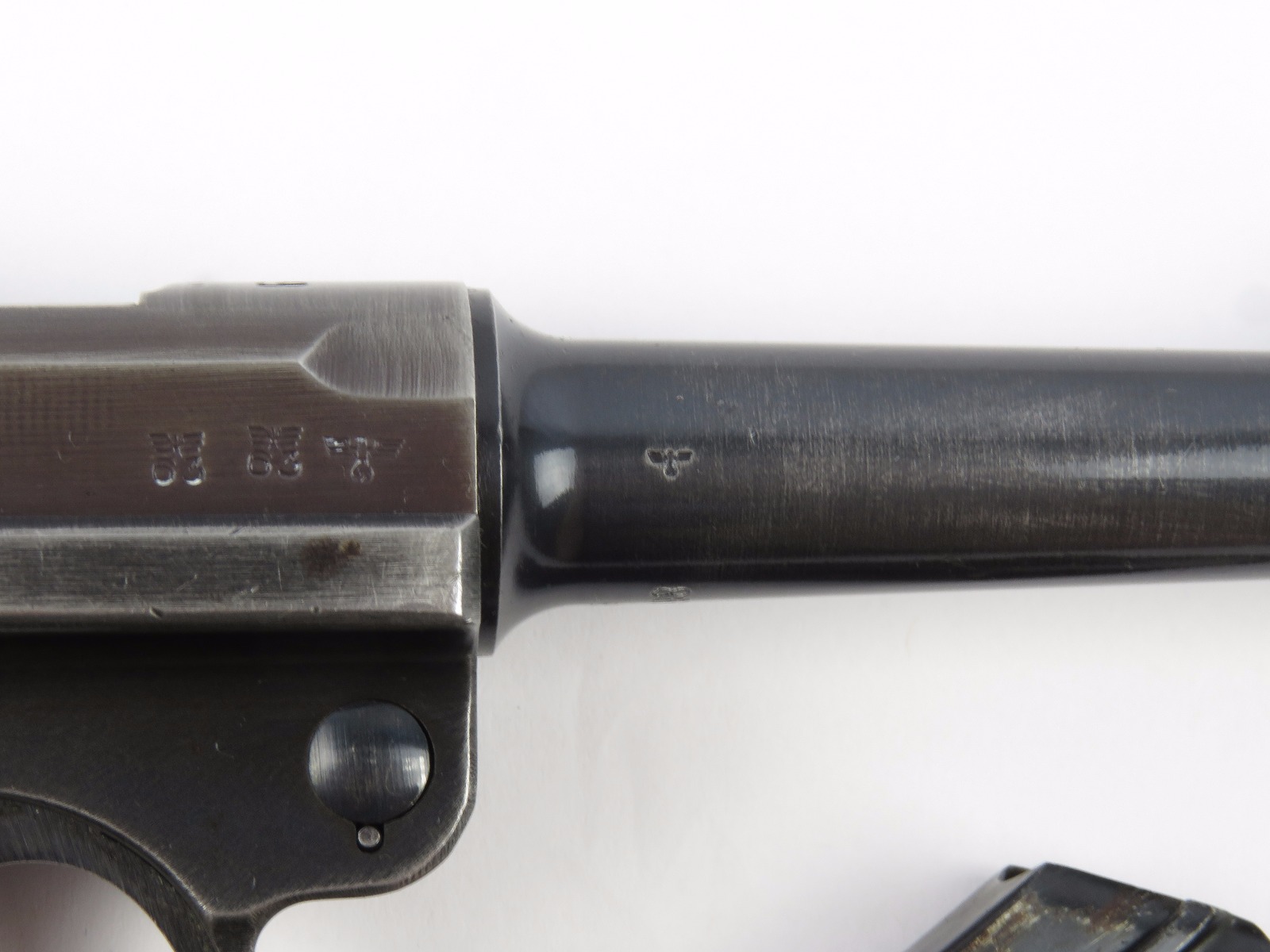 9/26/17 – This is an original Mauser Luger produced during WW2. The pistol has a light plumb colored finish on the receiver, while the frame, barrel, and toggle are blued. The bluing is completley worn off of the front and back strap, and there is normal thinning wear in other places like around the muzzle and barrel, side plate, and typical edge wear. Overall we rate at about 80% but most of the wear is clearly on the front and back straps. The toggle and top of pistol is fine though. The pistol is also all correct and original configuration with no signs of tampering, which makes this a nice all original condition shooter or relatively affordable collector piece. The bore has some minor corrosion and surface wear, but should have no problems shooting after a thorough cleaning and proper use.