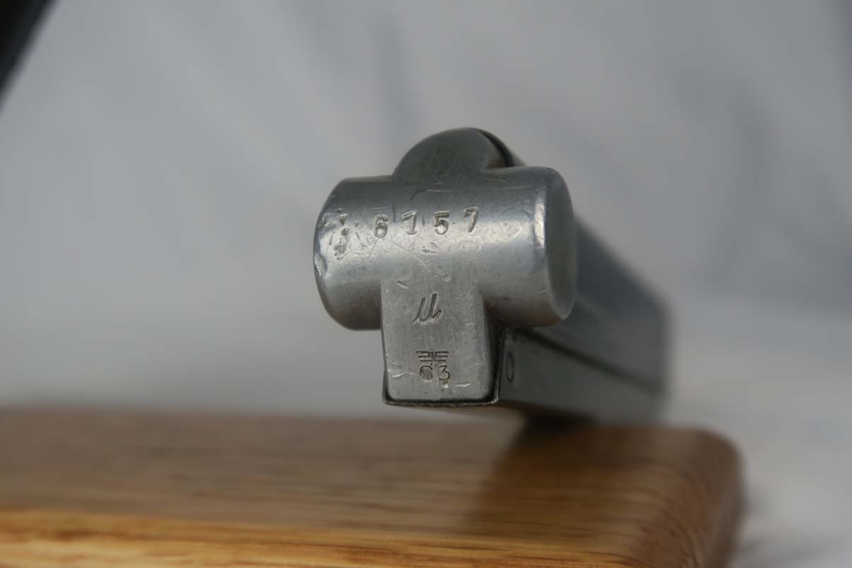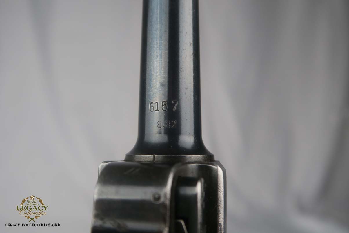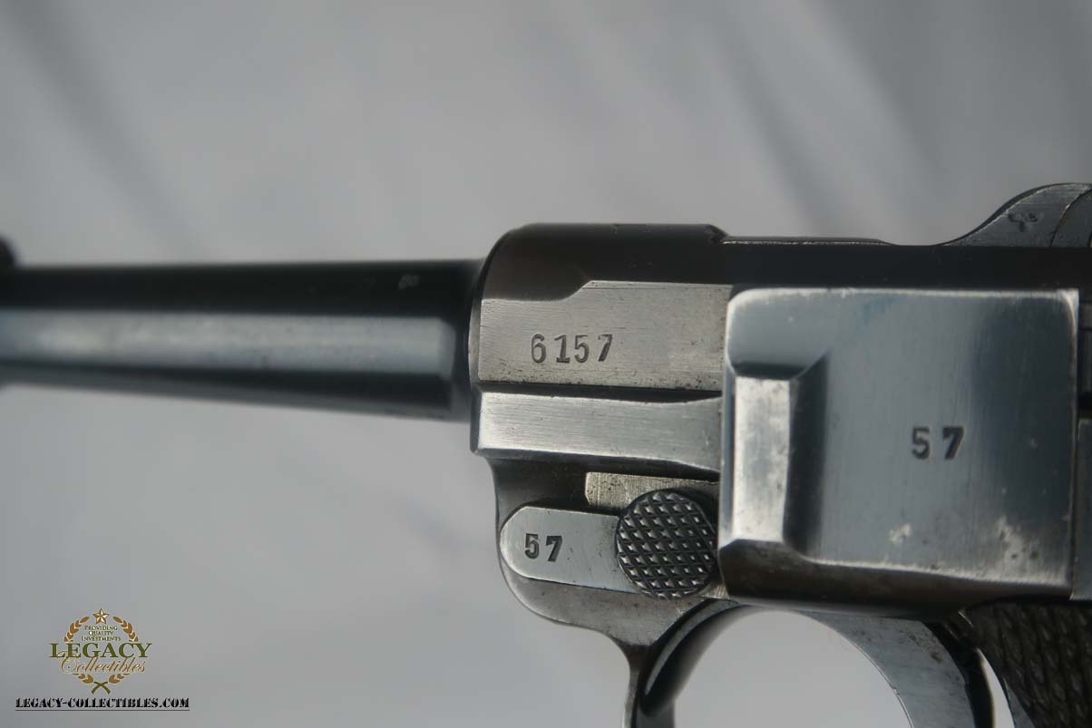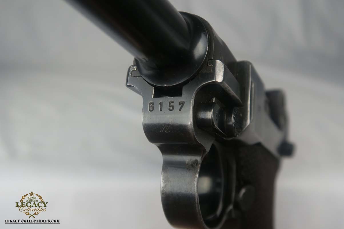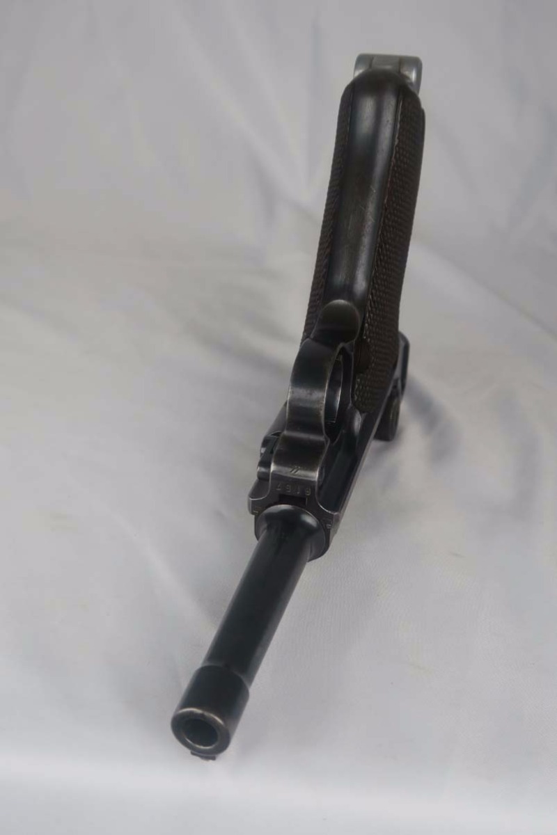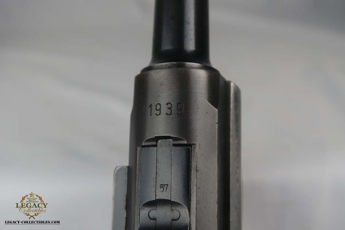 5/24/17 – This is a 1939 Mauser luger with original matching magazine.  It has the Mauser factory code of ’42’ on the toggle.  All small parts are matching and correct, though the grips are unnumbered.  The finish rates at about 90%, with patina on the straps and finish loss on both sides of the barrel.  Excellent bore.