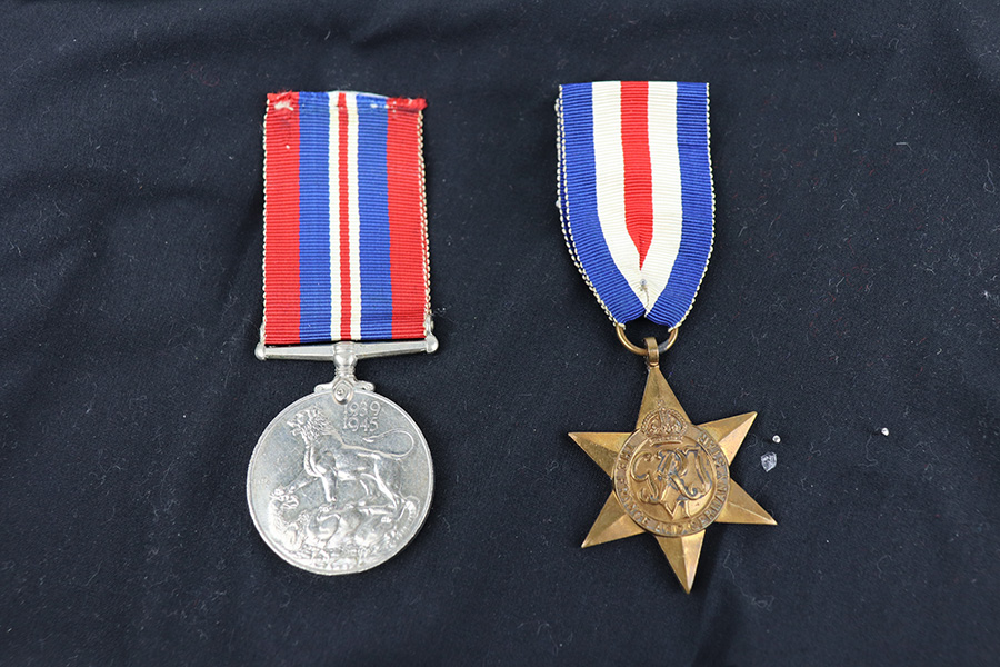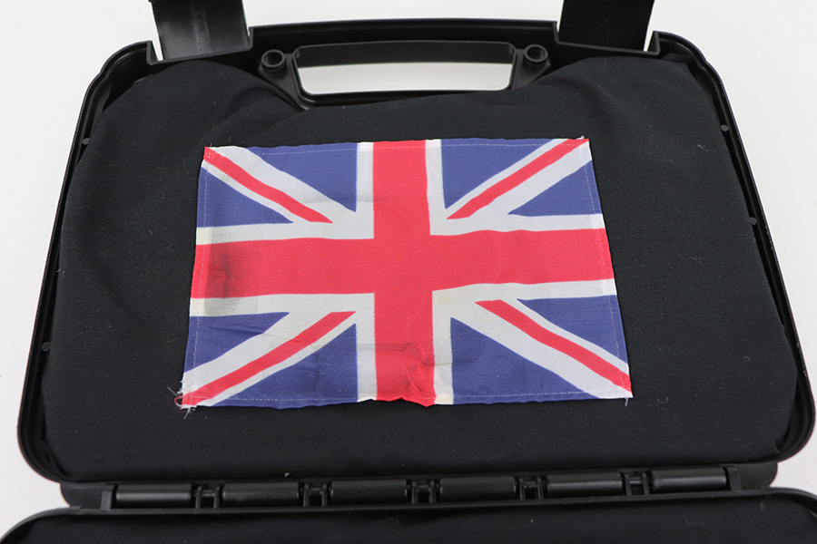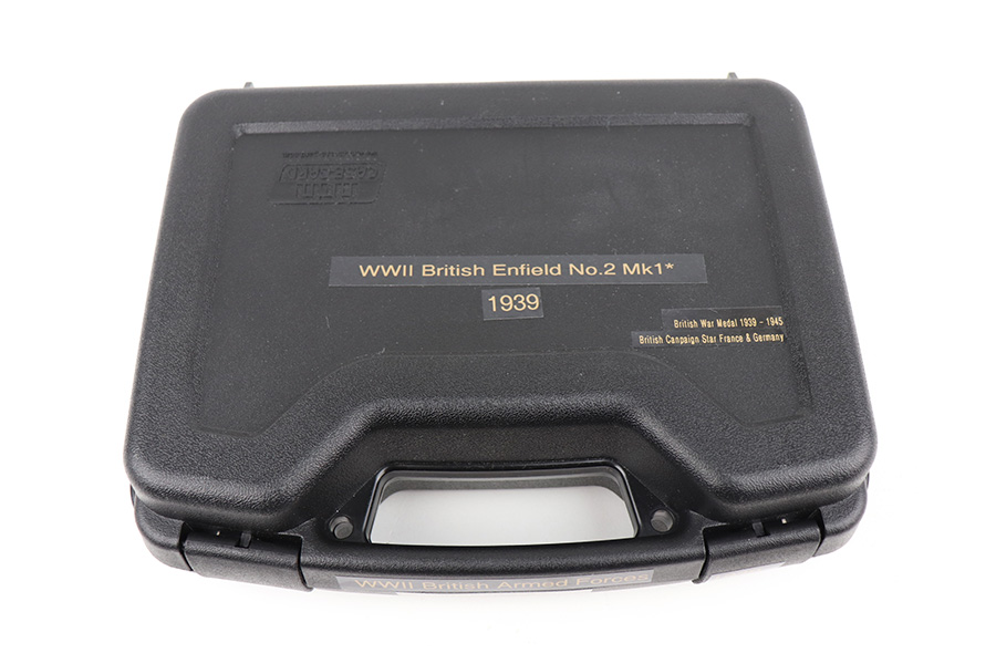 5/6/21 – This is a very nice example of an Enfield No 2 Mk 1 revolver issued to the British military in 1939. This gun is being sold on consignment. The consignment put together a very cool assembly to accompany the gun that includes a labeled hard case, a repro British flag, a WW2 medal, and a British Commonwealth France And Germany Star Campaign Medal. The gun is all matching but has an import mark on the underside of the barrel. It has retained about 90% of its original finish. There is minor wear on the high edges in general and on the underside of the frame and trigger guard. Very minor dings here and there. Light roll mark on the cylinder. Comes with nice grips (minor dings throughout). Mint bore.