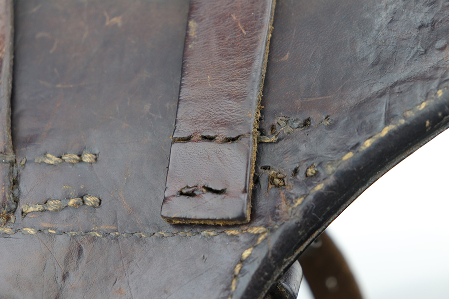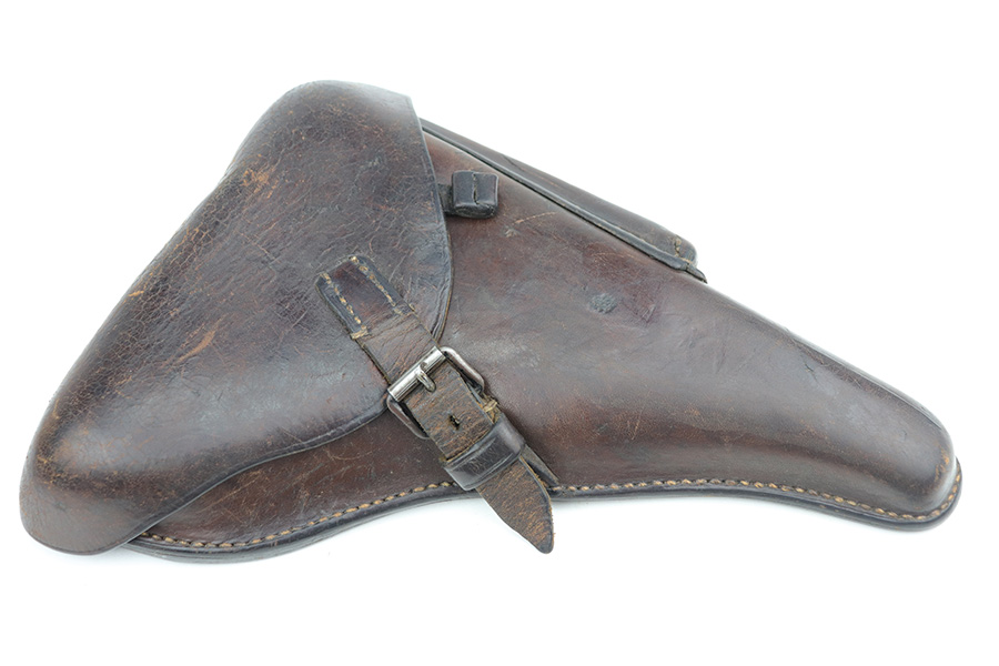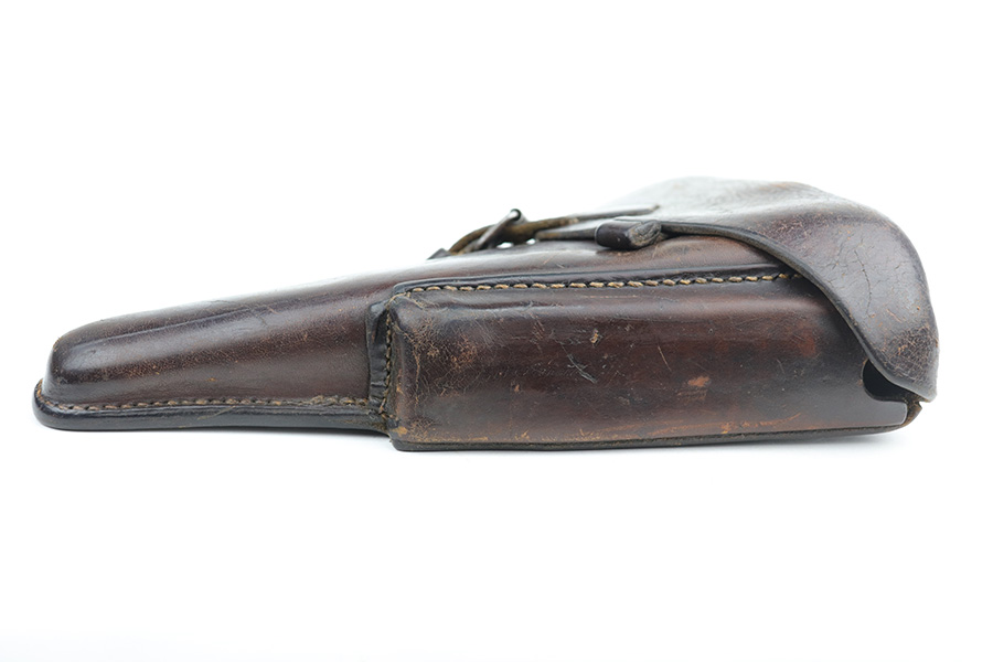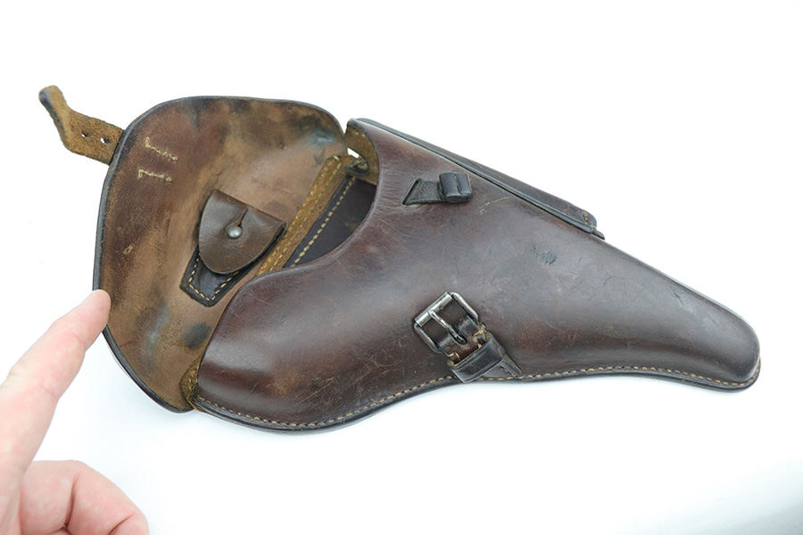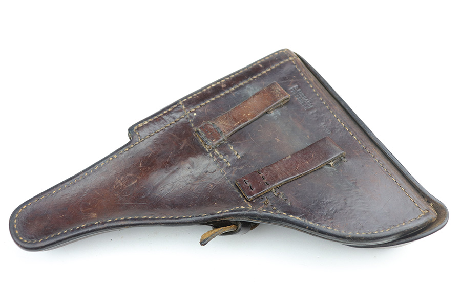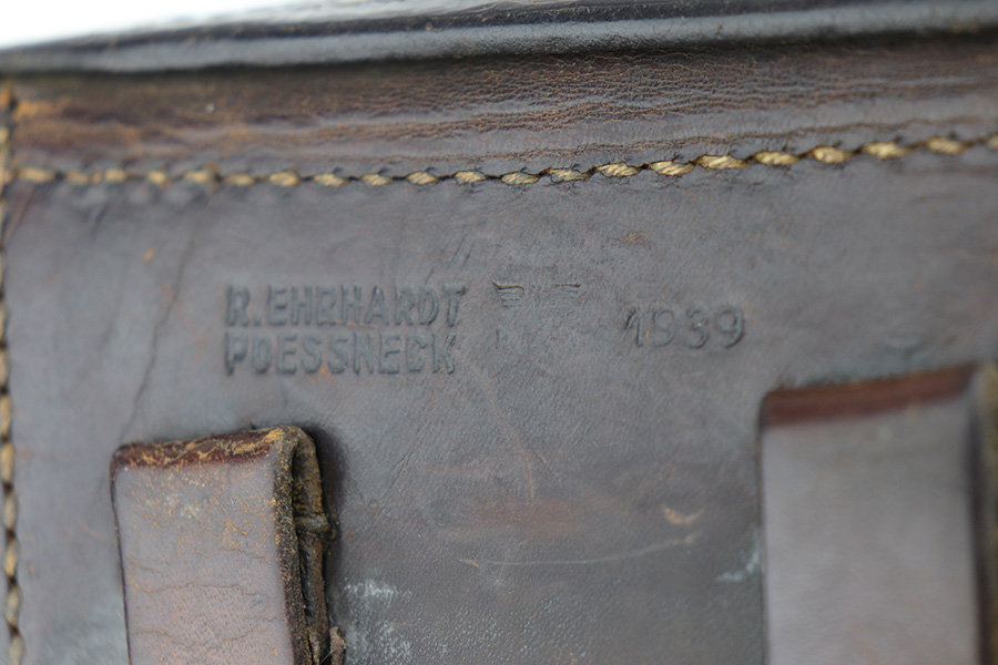 10/1/21 – This holster is for a P.08 Luger. Overall the holster is in okay condition. The flap has light cracking and the holster has a few marks from wear and use. The stitching of the holster is primarily intact. One of the belt loops on the back of the holster has its lower stitching missing as shown. The holster is maker marked, dated “1939”, and Waffen stamped.