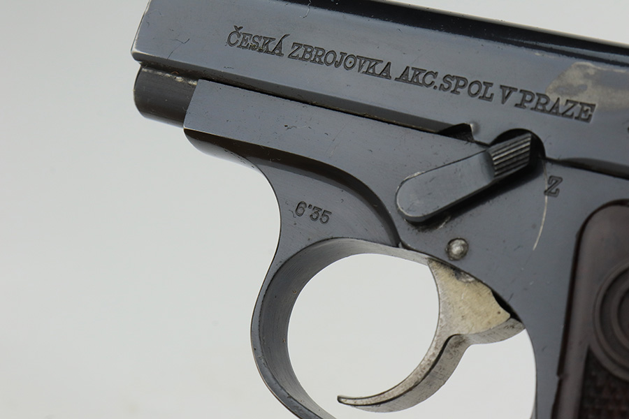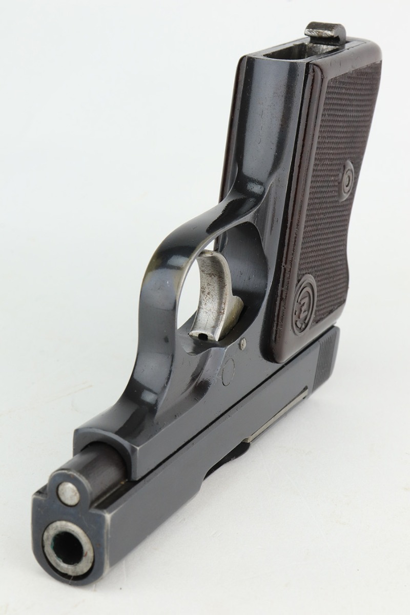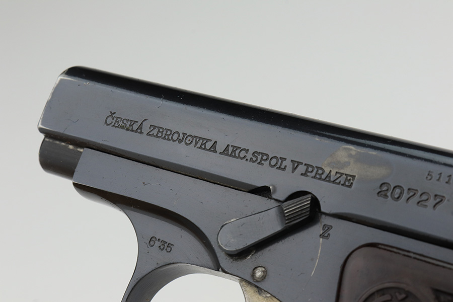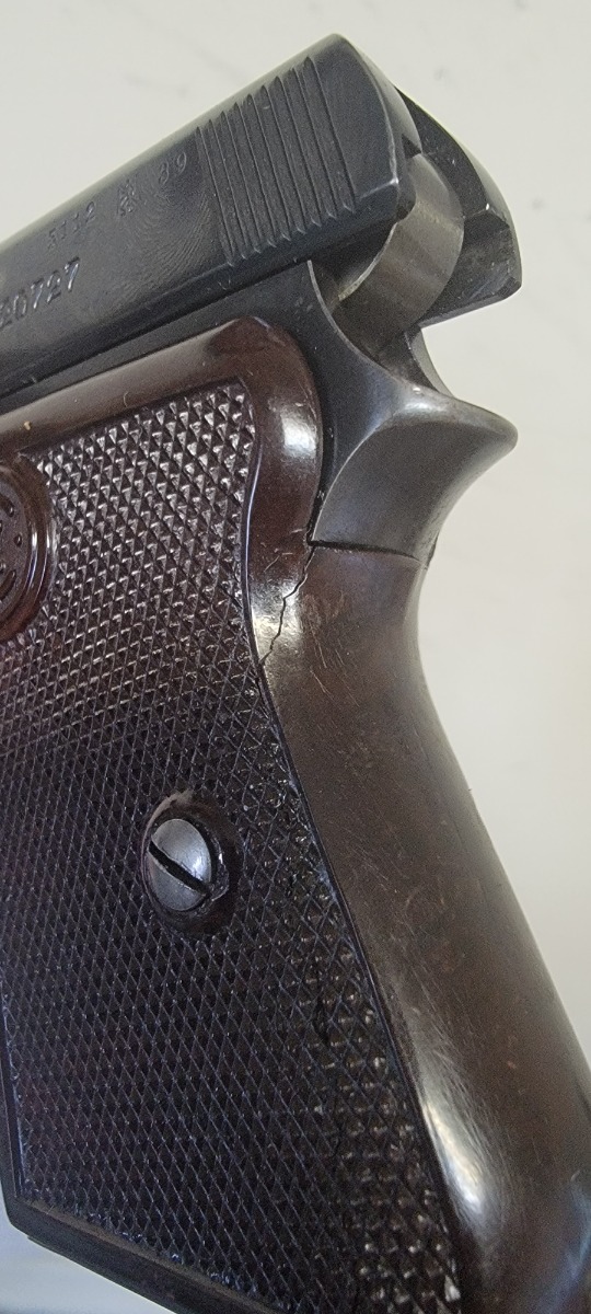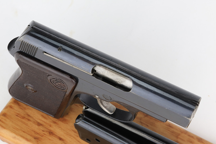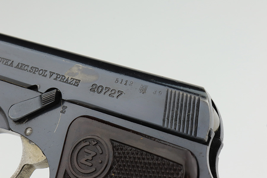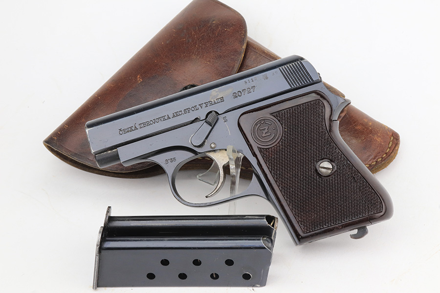 1/27/23 – This is an original CZ model 36 pistol made in 1939. The pistol comes as a complete rig with an original leather CZ style holster and a spare magazine (2 magazines total). The pistol is mechanically sound and retains about 92-95% of the original finish. There’s a spot of discoloration on the slide, near the serial number. There’s also some mild surface patina within the finish on the front and back strap, as well as some mild edge wear along the muzzle and frame. The grip has a crack on the left side, starting at the back spine, as shown in photos. Mechanically sound with a nice bore that has strong rifling but some honest wear, surface patina, and very light pitting in the grooves. Should still be fine for shooting and functionality, and we rate the bore 7/10 overall. These pocket pistols are believed to be carried by German Officers and other officials who tended to prefer smaller pocket pistols for everyday carry.