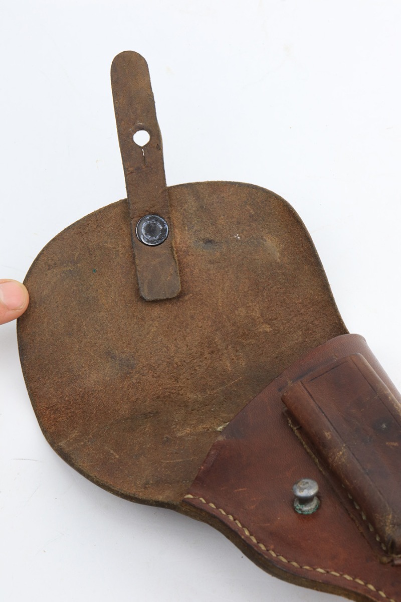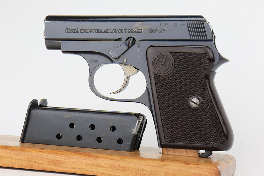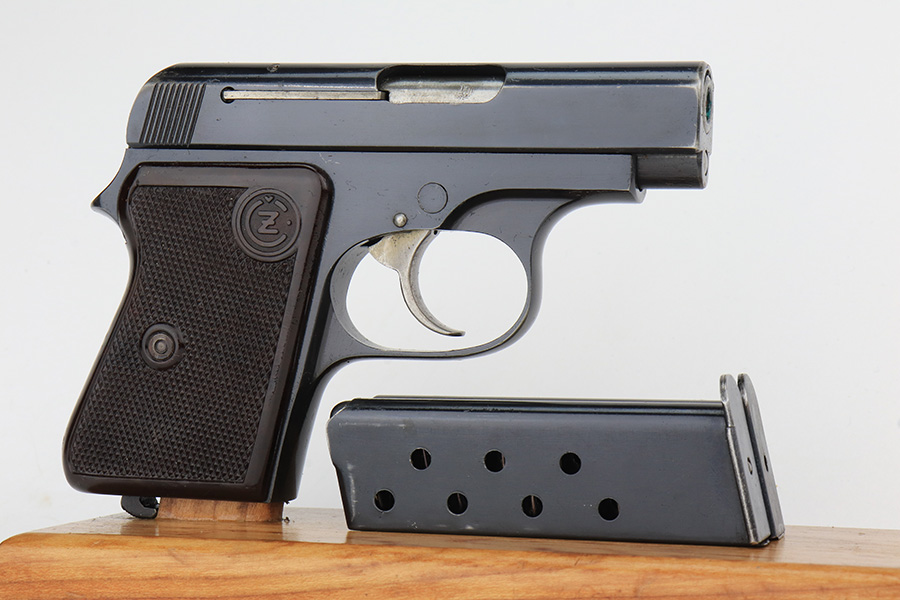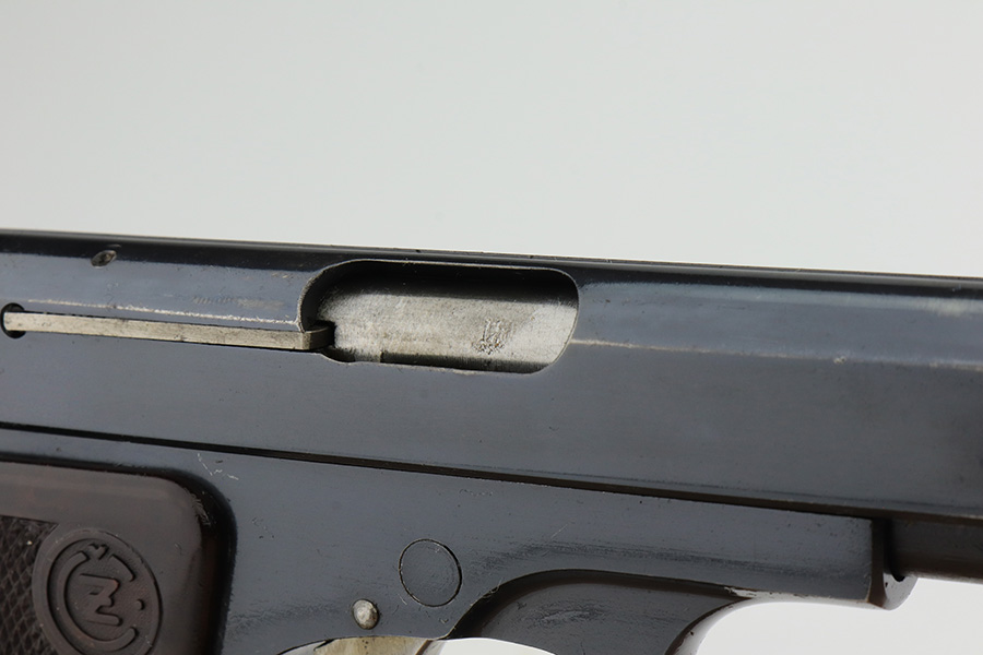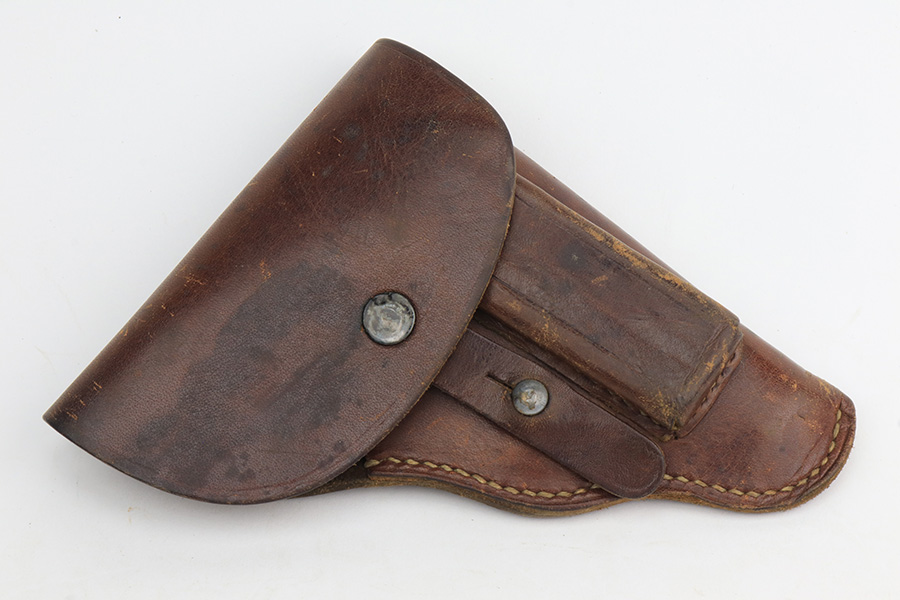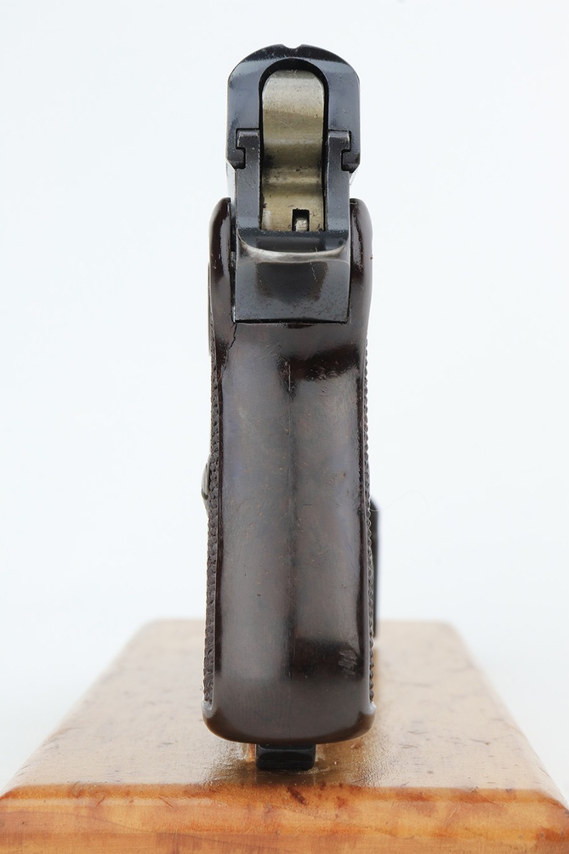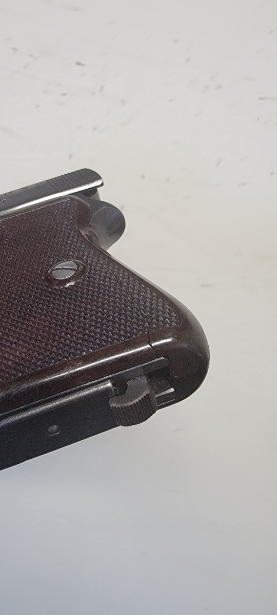 1/27/23 – This is an original CZ model 36 pistol made in 1939. The pistol comes as a complete rig with an original leather CZ style holster and a spare magazine (2 magazines total). The pistol is mechanically sound and retains about 92-95% of the original finish. There’s a spot of discoloration on the slide, near the serial number. There’s also some mild surface patina within the finish on the front and back strap, as well as some mild edge wear along the muzzle and frame. The grip has a crack on the left side, starting at the back spine, as shown in photos. Mechanically sound with a nice bore that has strong rifling but some honest wear, surface patina, and very light pitting in the grooves. Should still be fine for shooting and functionality, and we rate the bore 7/10 overall. These pocket pistols are believed to be carried by German Officers and other officials who tended to prefer smaller pocket pistols for everyday carry.