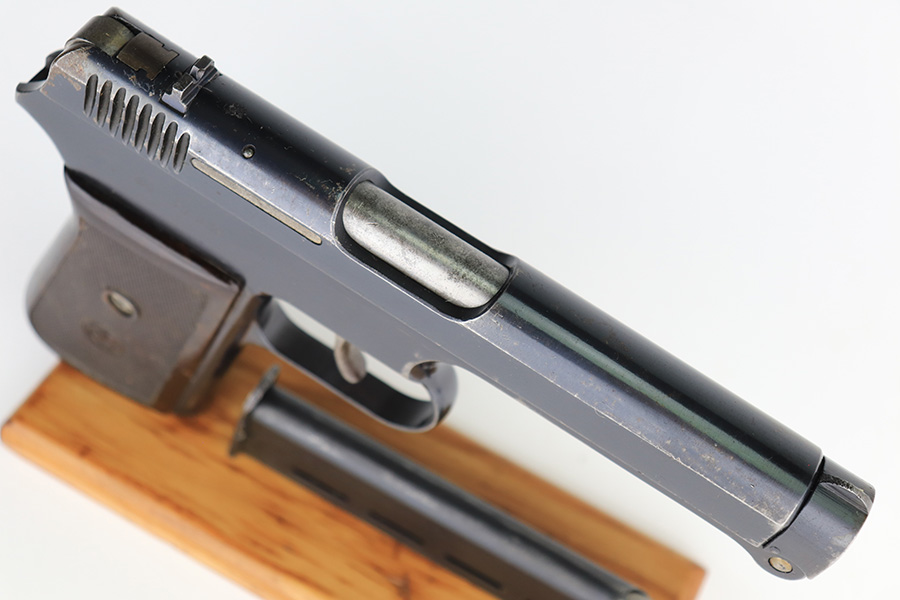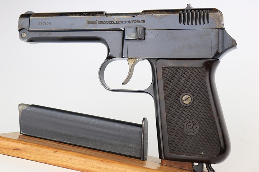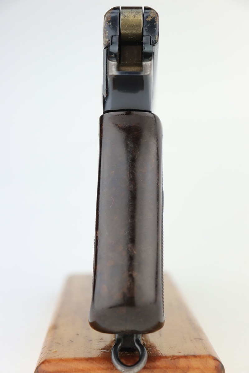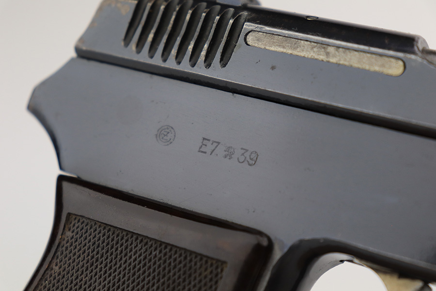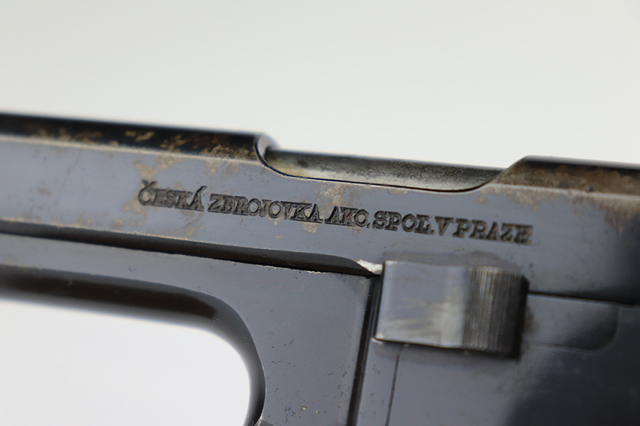 4/19/23 – This is a nice example of a CZ Model 38 manufactured in 1939. This one is part of the early Nazi military contract. It is in the proper 250000-291000 serial range and has the proper features, such as high polish finish and Czech Lion proofs throughout. It has retained roughly 85% of its original bluing. The most obvious sign of wear is splotchy discoloration and patina along the left side of the slide and one spot on the right side of the frame. Minor freckling on the front strap. Very nice period-correct bakelite grip – a couple of tiny chips on the right side. Comes with a proper magazine. Excellent, shiny bore with strong rifling.