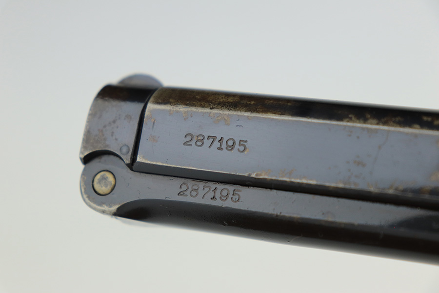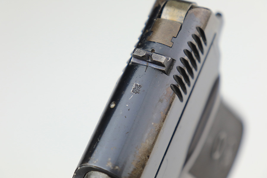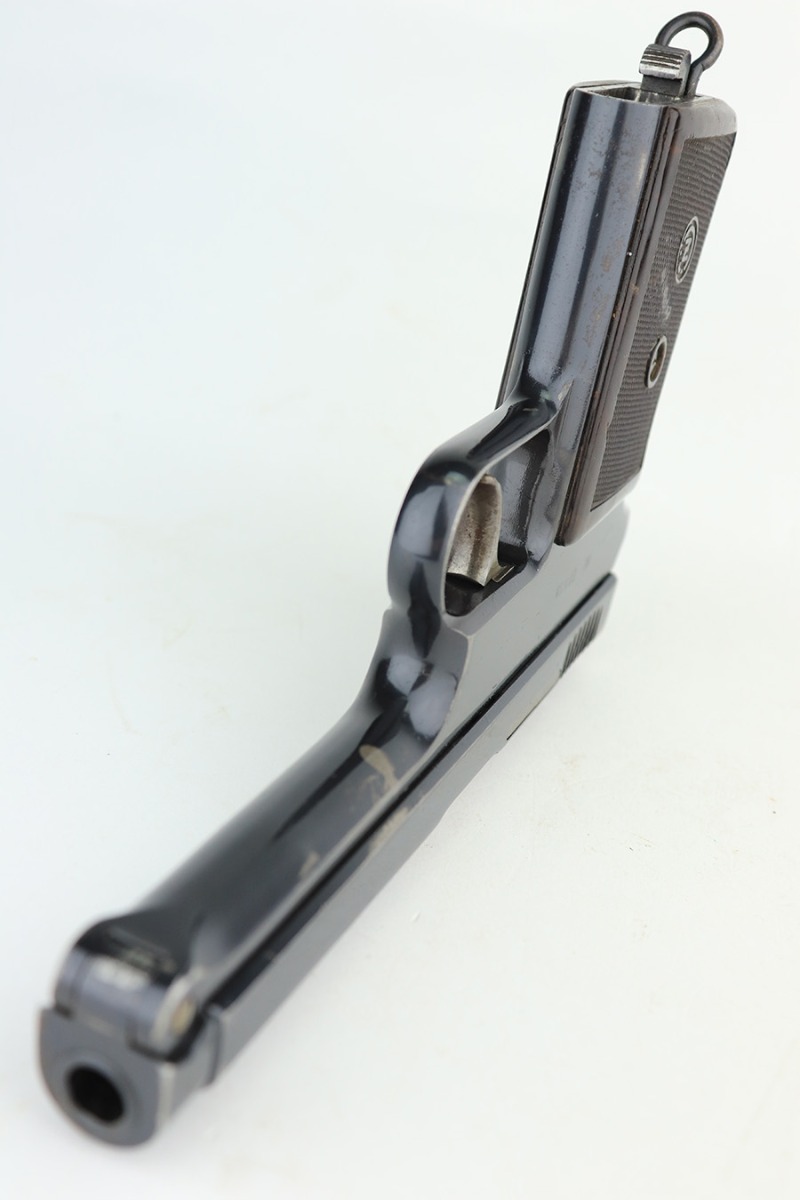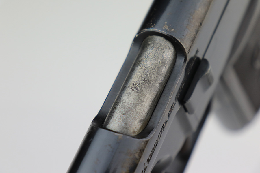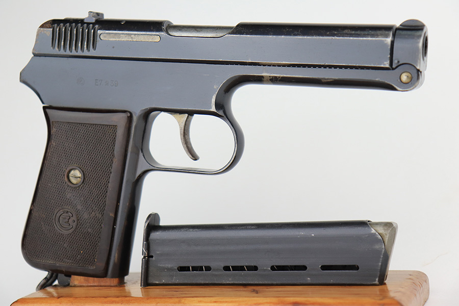 4/19/23 – This is a nice example of a CZ Model 38 manufactured in 1939. This one is part of the early Nazi military contract. It is in the proper 250000-291000 serial range and has the proper features, such as high polish finish and Czech Lion proofs throughout. It has retained roughly 85% of its original bluing. The most obvious sign of wear is splotchy discoloration and patina along the left side of the slide and one spot on the right side of the frame. Minor freckling on the front strap. Very nice period-correct bakelite grip – a couple of tiny chips on the right side. Comes with a proper magazine. Excellent, shiny bore with strong rifling.