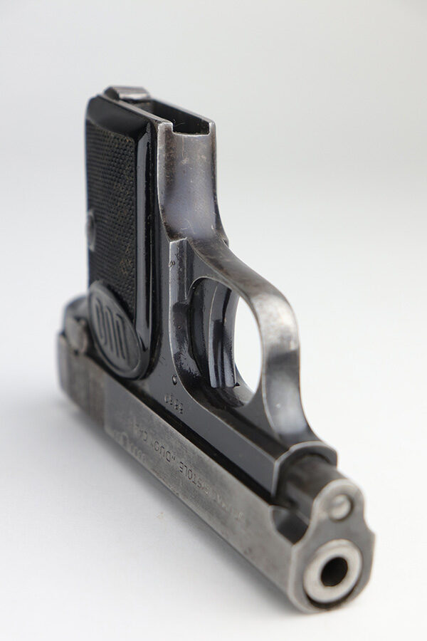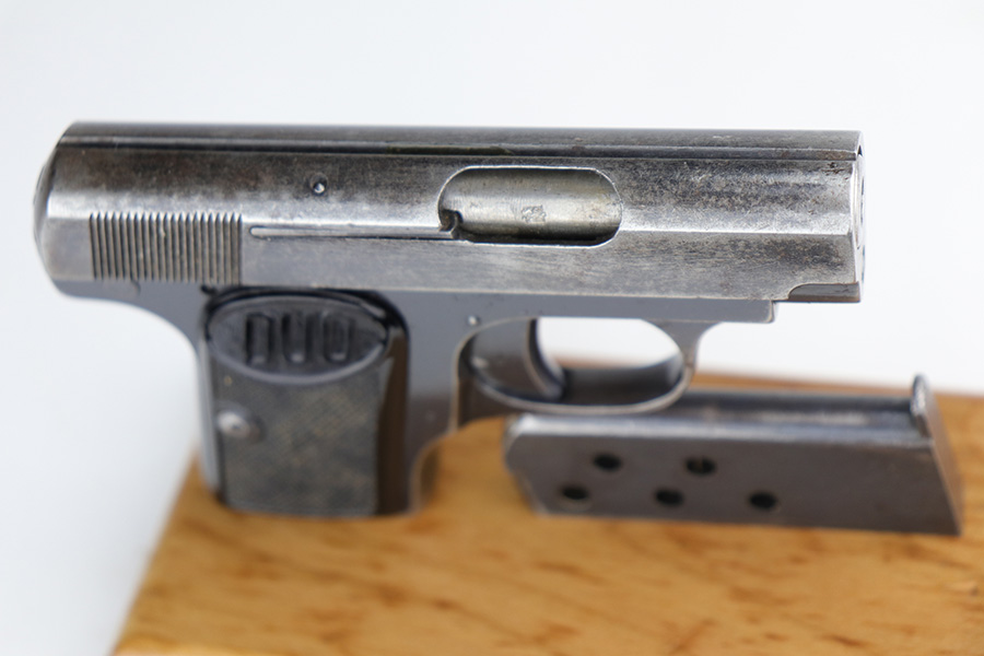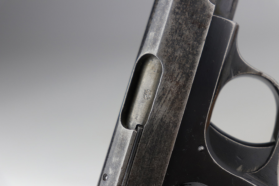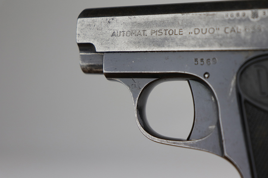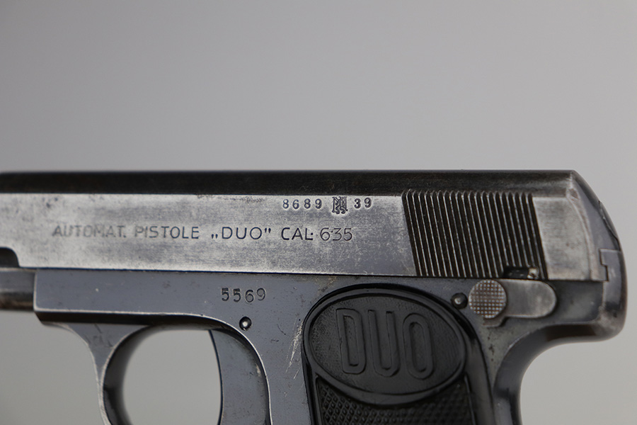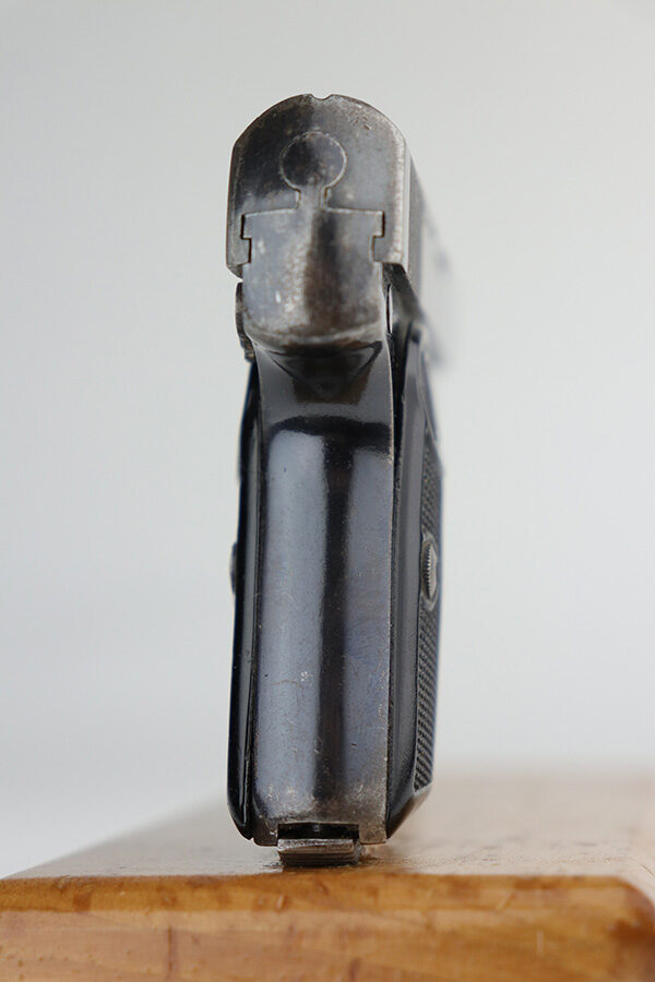 9/10/21 – This is a nice example of a Czech Duo Vest Pocket pistol manufactured in 1939. The slide and frame are mismatched, but it has the proper Czech lion proofs on the slide and ejection port. There is a star proof on the left side of the trigger guard. We are not sure of the meaning. It has retained roughly 50% of its original finish. Most of the wear is on the slide, but there is also some minor scratchy wear on the straps and underside of the trigger guard. Comes with excellent black bakelite grips and a proper magazine. Very nice bore with great rifling.