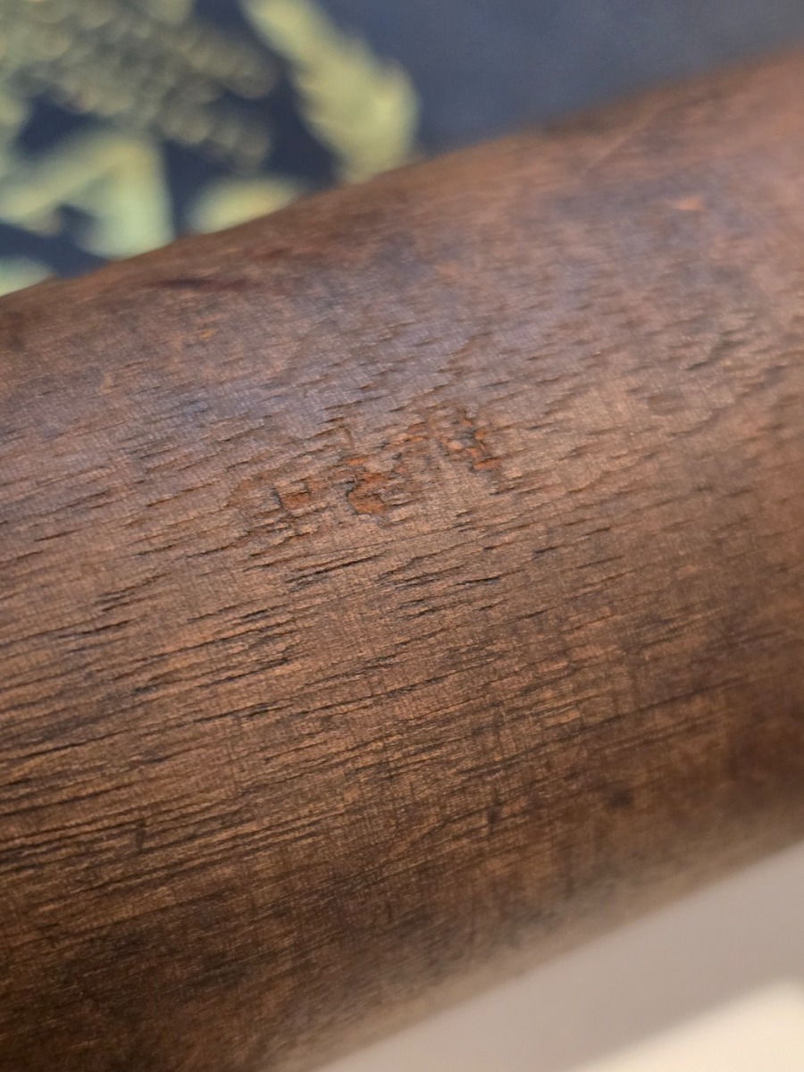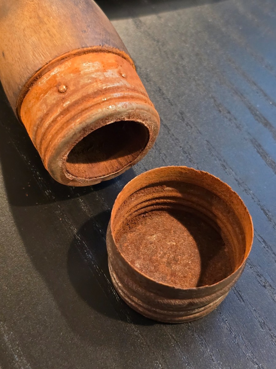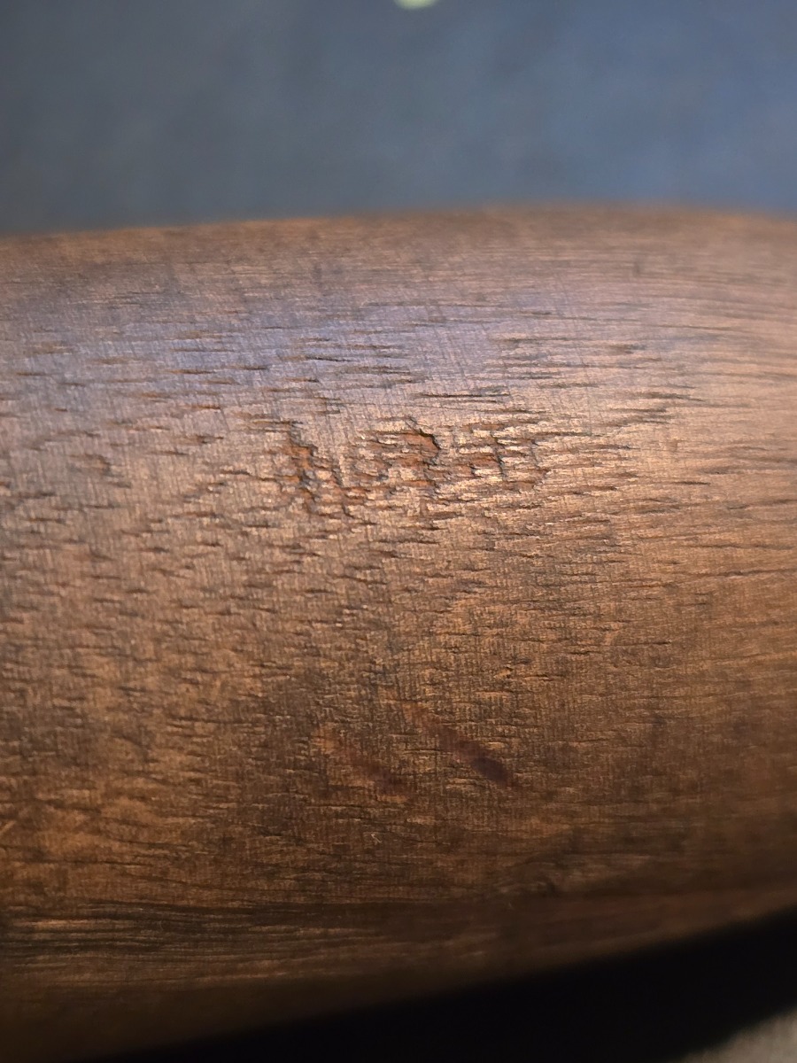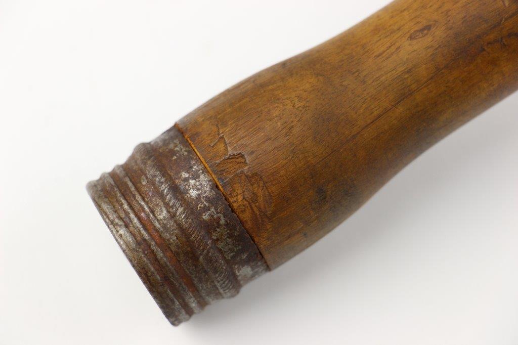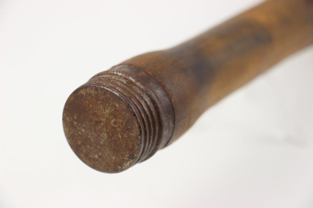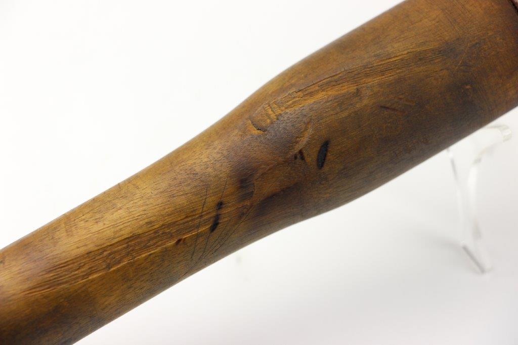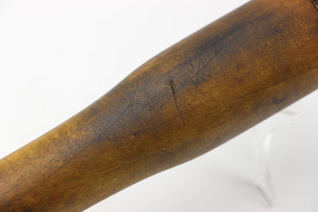 10/8/24 – This is an original 1939 dated inert M24 Stielhandgranate or “stick grenade” from WW2 Germany. The grenade comes as-shown with no internals included. The metal base properly unscrews and can be removed, revealing natural patina and surface rust on the interior cap and metal threading. The wood handle has a few light surface bruises and imperfections, but no major cracks or chips. We found no distinctly visible markings on the wood, but there is a faint, small number stamp of some kind that we cannot decipher (see last photo). The top of the “potato masher” grenade has traces of olive green paint found, but is mostly worn off with the steel and dark spotty patina showing prominently. The top is maker and date stamped by Richard Rinker. All original retaining screws are still intact.