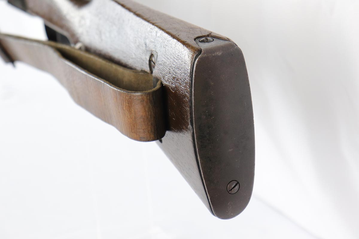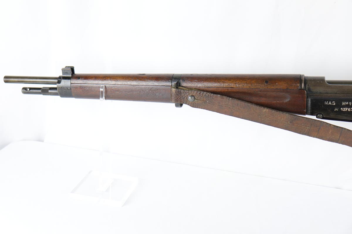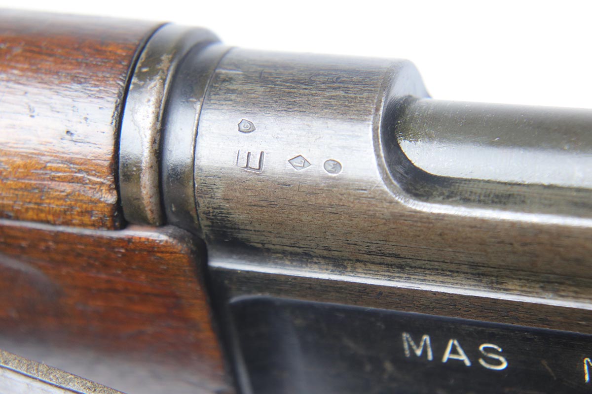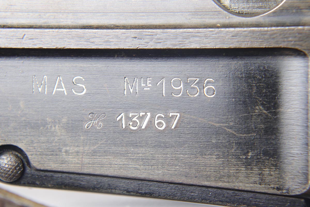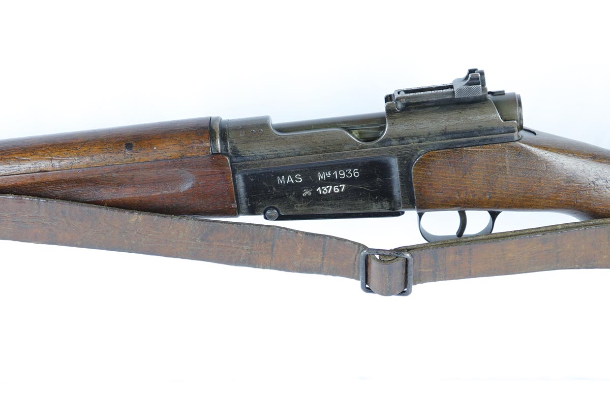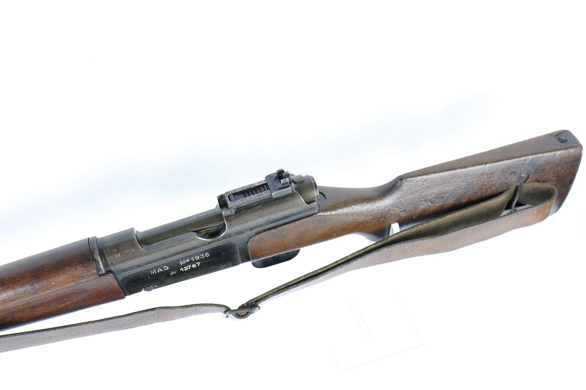 7/12/18 – This is a 1939 WWII French MLE Model 1936 bolt action MAS Rifle in 7.5 x 54mm caliber. Excellent condition, still in original wartime finish and configuration, not postwar overhauled. Rifle is not import marked. 1939 dated stock cartouche with proper French WWII leather sling installed, leather is completely supple. Rifle shows all matching serial numbers including receiver, bolt, buttstock, triggerguard, floorplate, and the forward mounted spike bayonet which stores in a tube under the barrel.  Forend wood and handguard are correctly unnumbered.  Original WWII finish on both metal and stock with some normal handling marks.  Metal finish is original WWII black showing some use wear. Bore is excellent with strong rifling. A super example of a scarce, all matching wartime Model 1936 French MAS.  This rifle would have been there during the fall of France in 1940 and was likely a US Vet bring back after WWII. Excellent, complete and 100% matching.