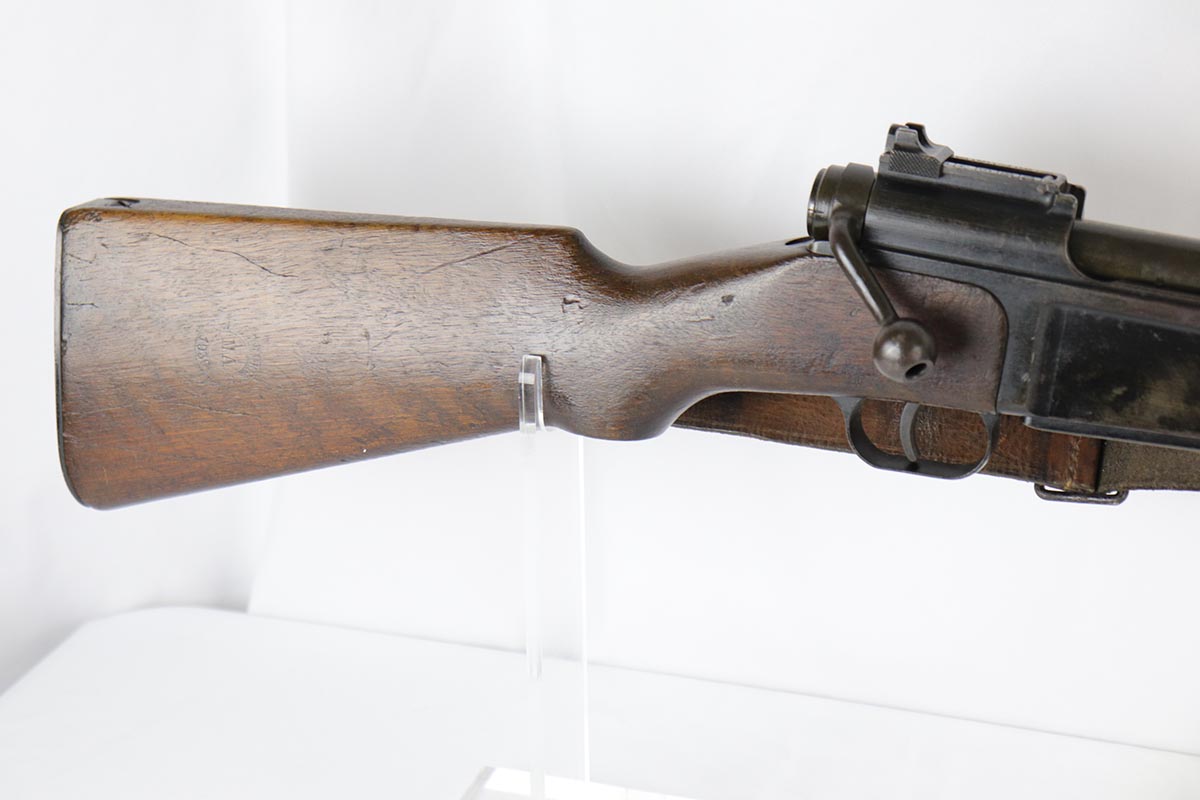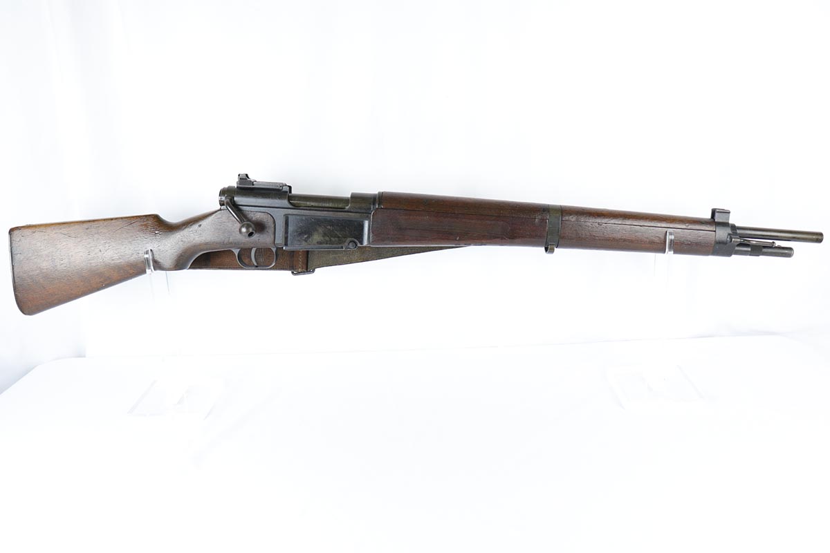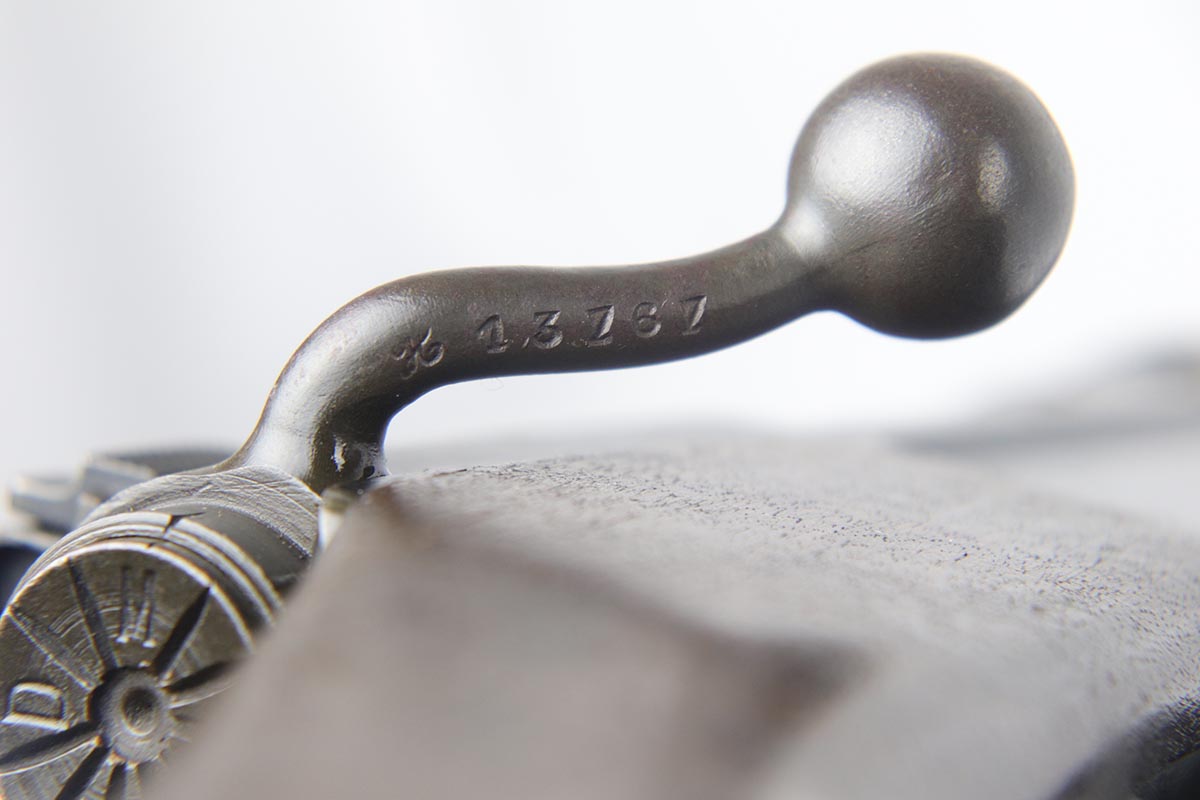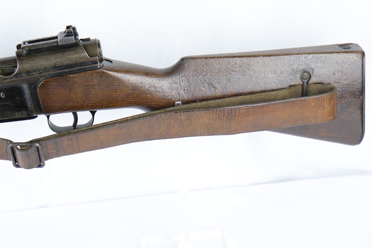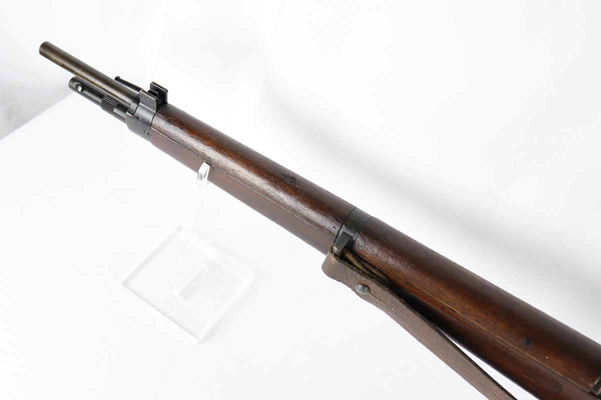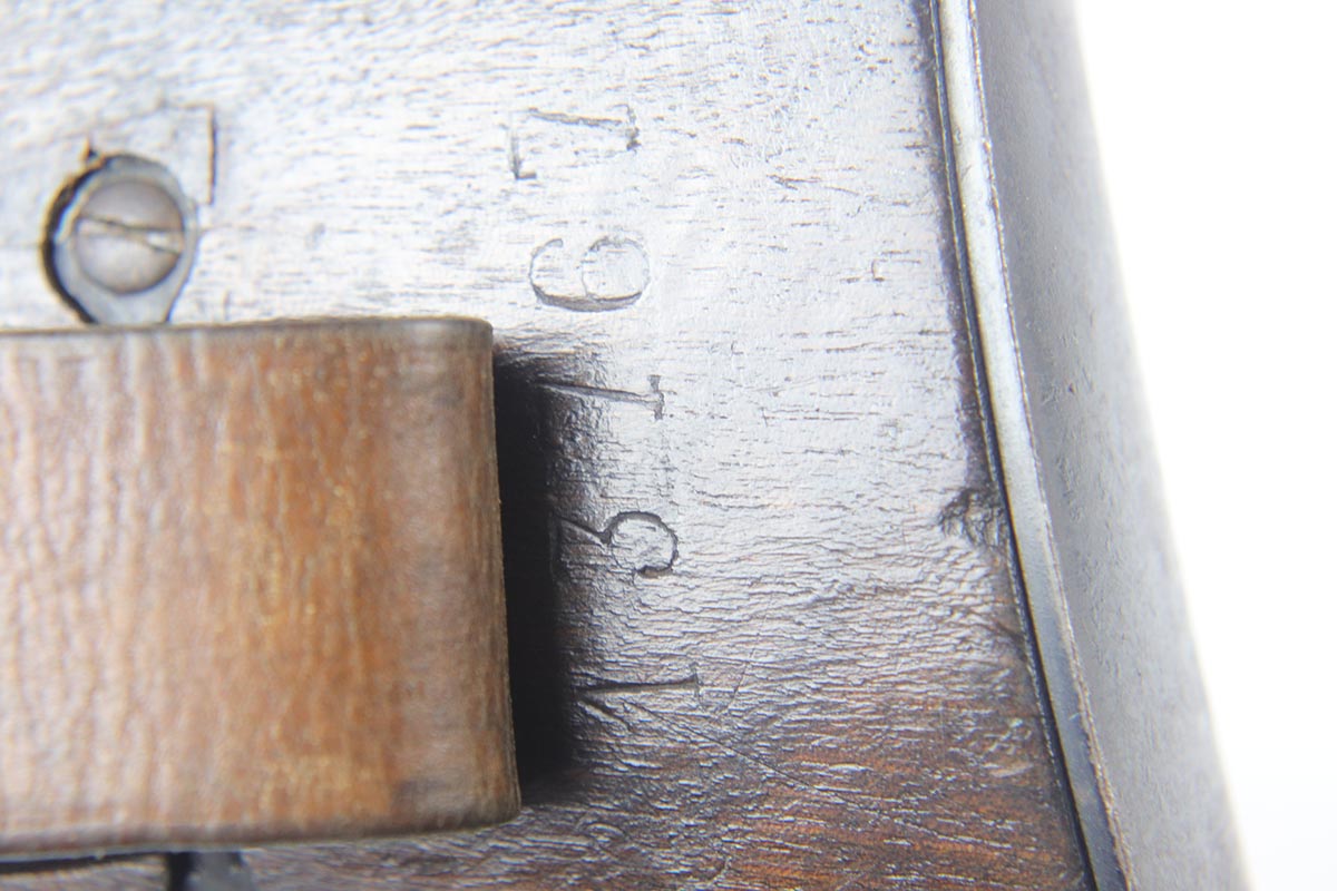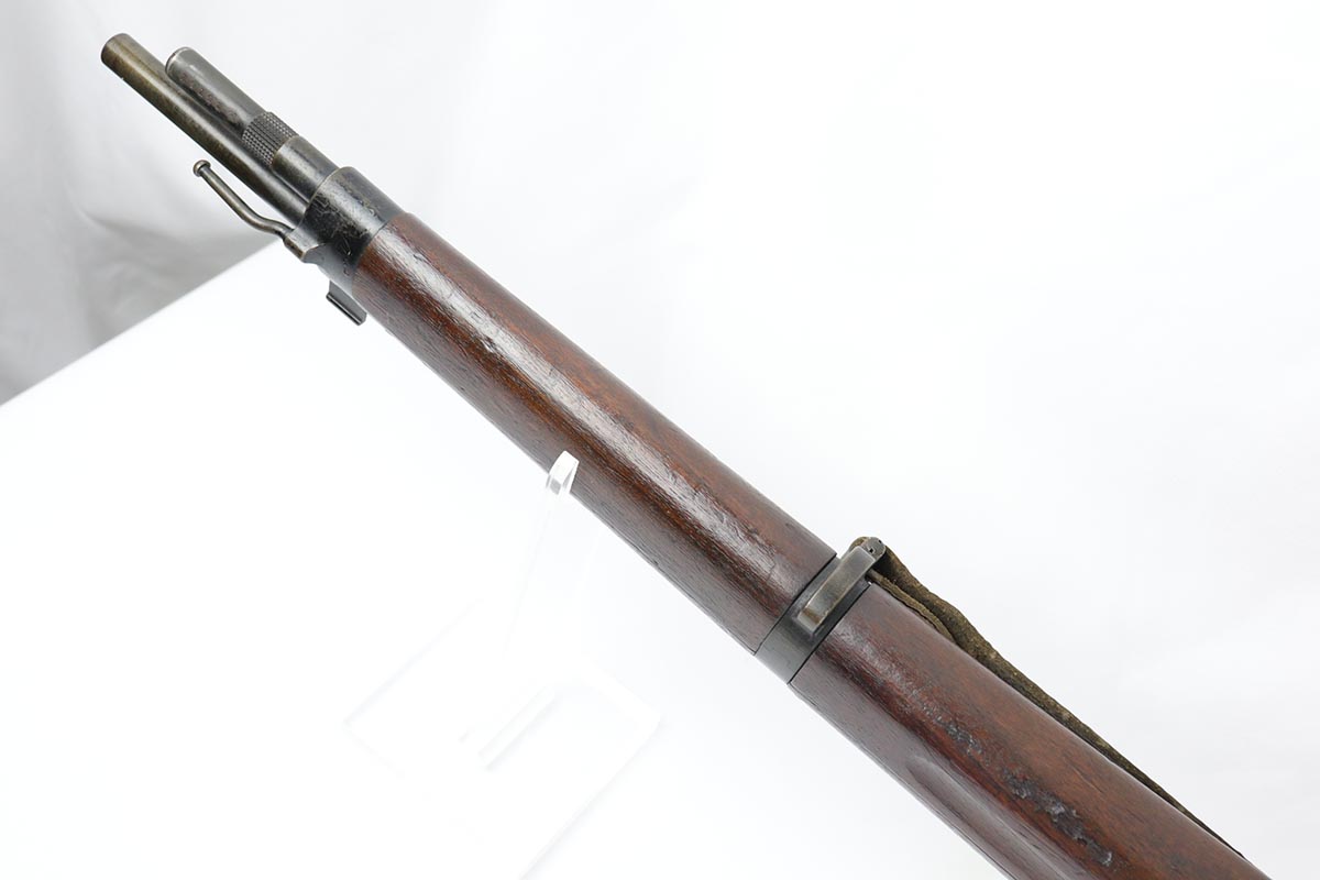 7/12/18 – This is a 1939 WWII French MLE Model 1936 bolt action MAS Rifle in 7.5 x 54mm caliber. Excellent condition, still in original wartime finish and configuration, not postwar overhauled. Rifle is not import marked. 1939 dated stock cartouche with proper French WWII leather sling installed, leather is completely supple. Rifle shows all matching serial numbers including receiver, bolt, buttstock, triggerguard, floorplate, and the forward mounted spike bayonet which stores in a tube under the barrel.  Forend wood and handguard are correctly unnumbered.  Original WWII finish on both metal and stock with some normal handling marks.  Metal finish is original WWII black showing some use wear. Bore is excellent with strong rifling. A super example of a scarce, all matching wartime Model 1936 French MAS.  This rifle would have been there during the fall of France in 1940 and was likely a US Vet bring back after WWII. Excellent, complete and 100% matching.