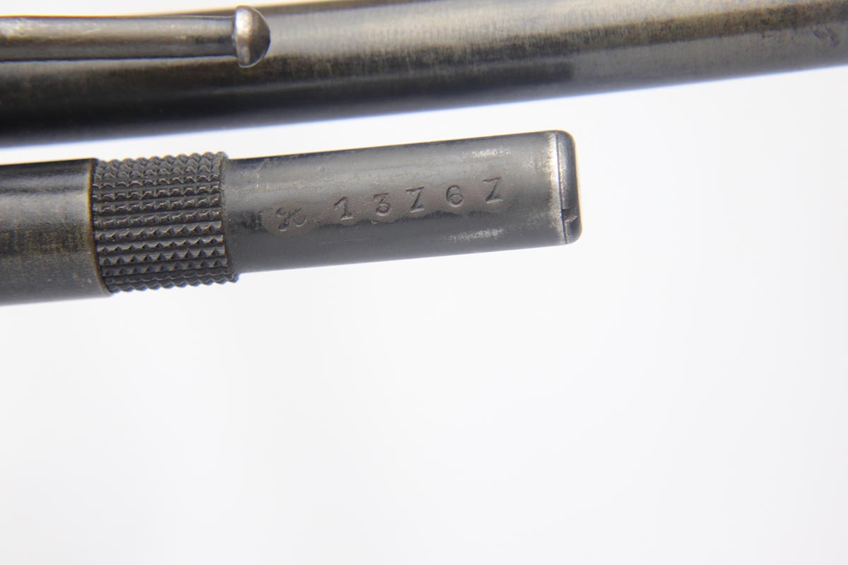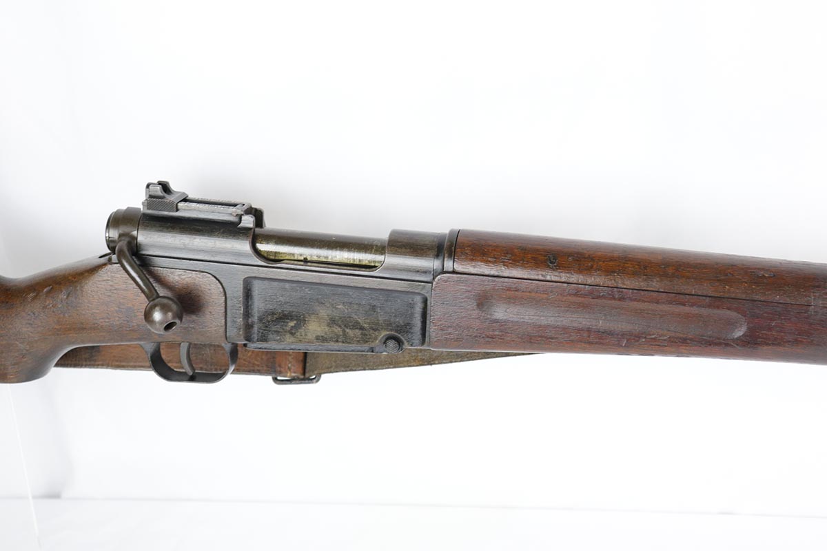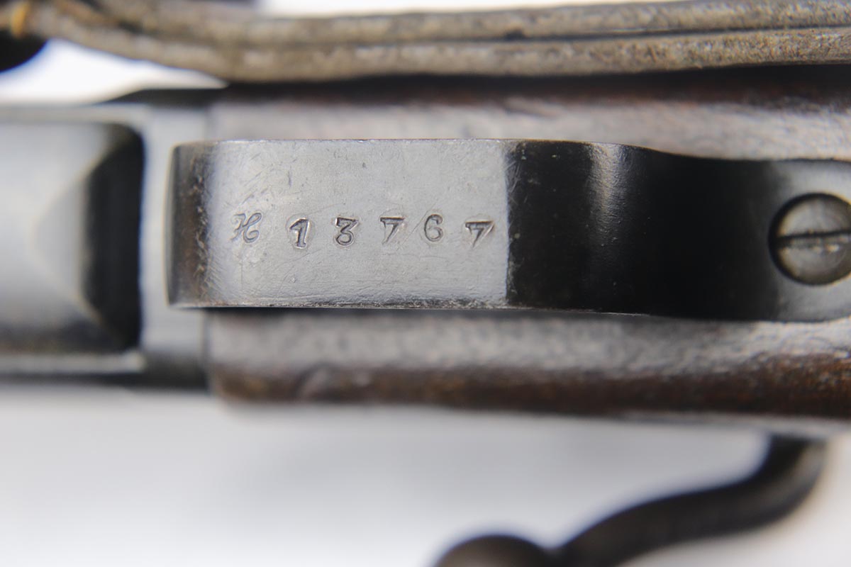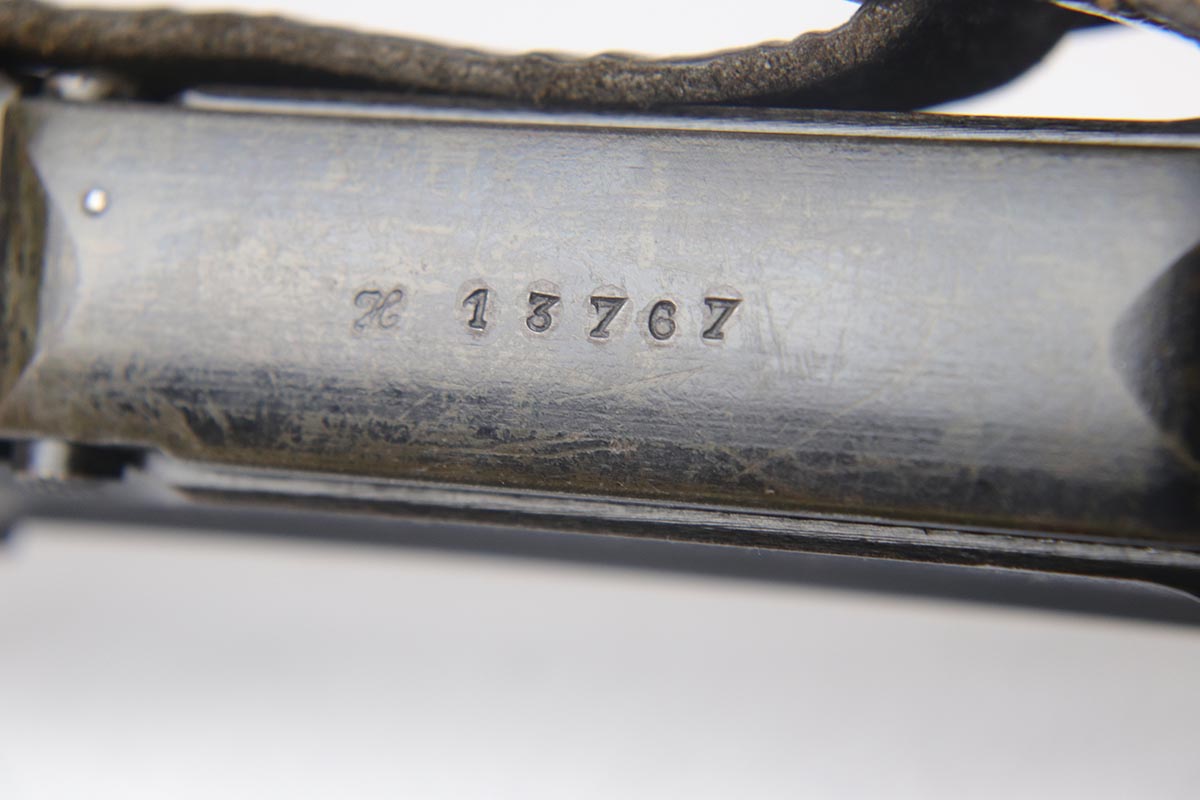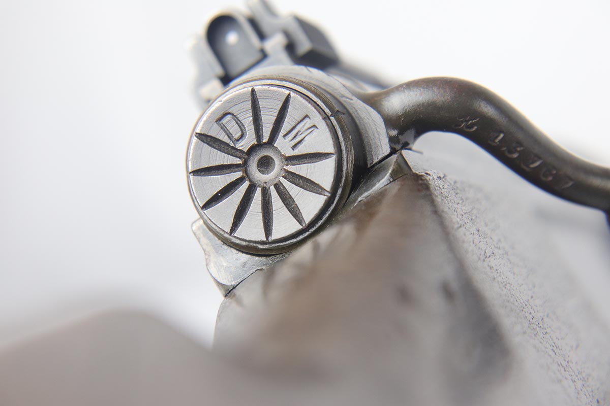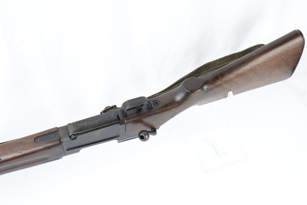 7/12/18 – This is a 1939 WWII French MLE Model 1936 bolt action MAS Rifle in 7.5 x 54mm caliber. Excellent condition, still in original wartime finish and configuration, not postwar overhauled. Rifle is not import marked. 1939 dated stock cartouche with proper French WWII leather sling installed, leather is completely supple. Rifle shows all matching serial numbers including receiver, bolt, buttstock, triggerguard, floorplate, and the forward mounted spike bayonet which stores in a tube under the barrel.  Forend wood and handguard are correctly unnumbered.  Original WWII finish on both metal and stock with some normal handling marks.  Metal finish is original WWII black showing some use wear. Bore is excellent with strong rifling. A super example of a scarce, all matching wartime Model 1936 French MAS.  This rifle would have been there during the fall of France in 1940 and was likely a US Vet bring back after WWII. Excellent, complete and 100% matching.